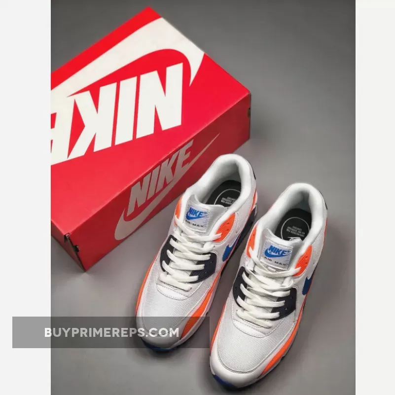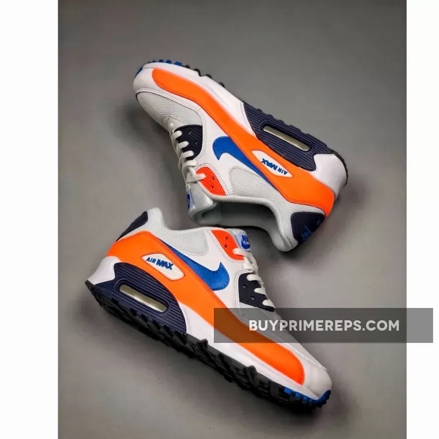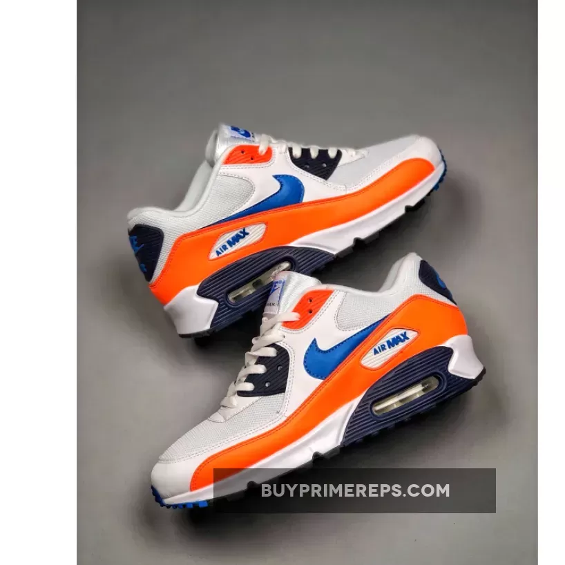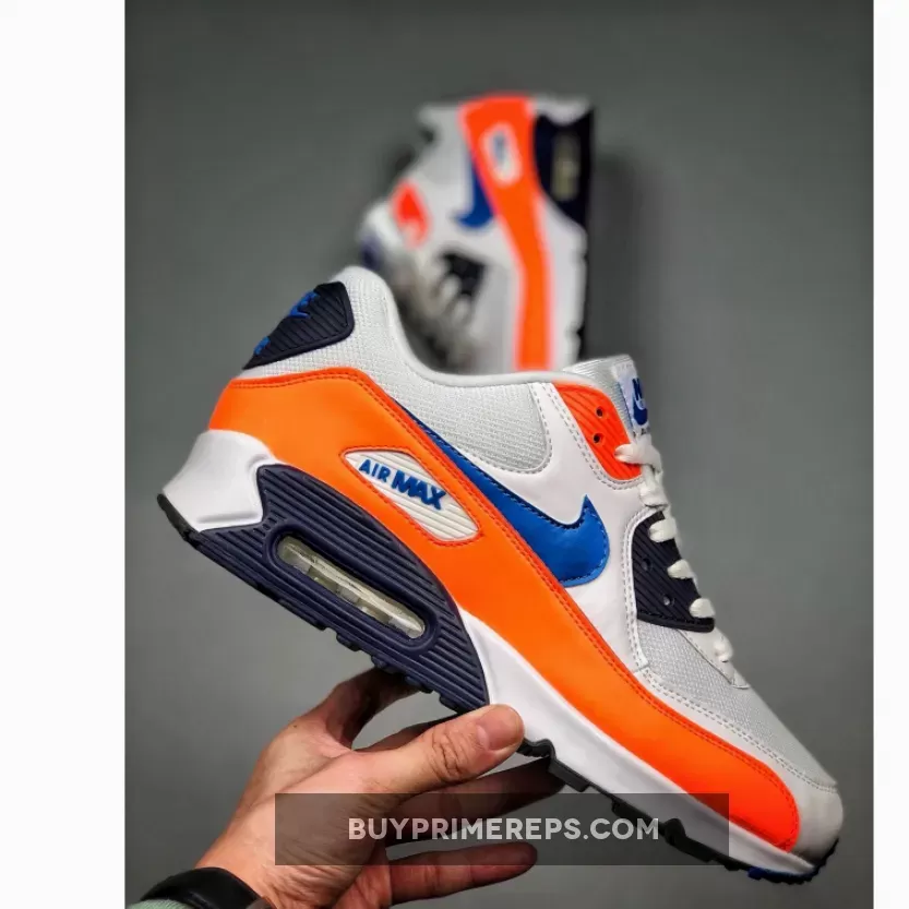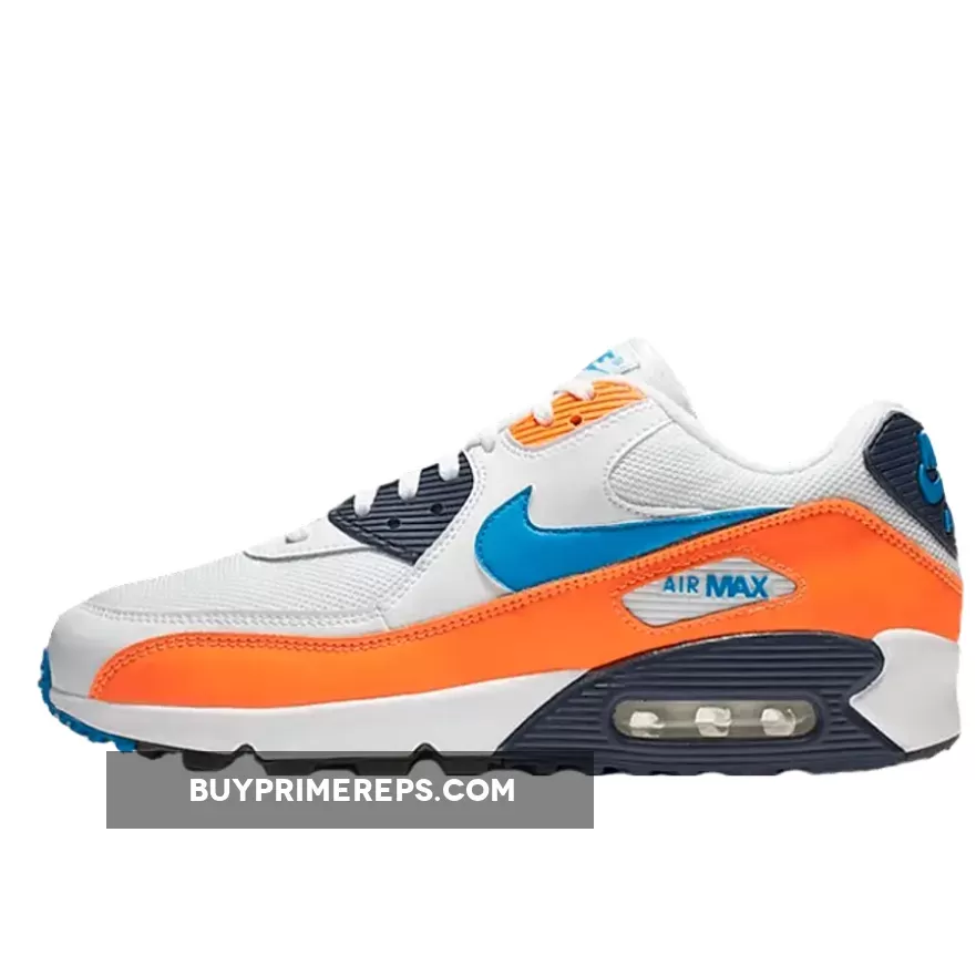 The Nike Air Max 90 ‘Orange Blue’ is a vibrant and eye-catching sneaker that is sure to turn heads wherever you go. This unique colorway features a combination of white leather and mesh on the upper, with pops of bright orange and deep blue accents throughout. The midfoot Swoosh and tongue badge are adorned with a striking shade of orange, adding a bold touch to the design.