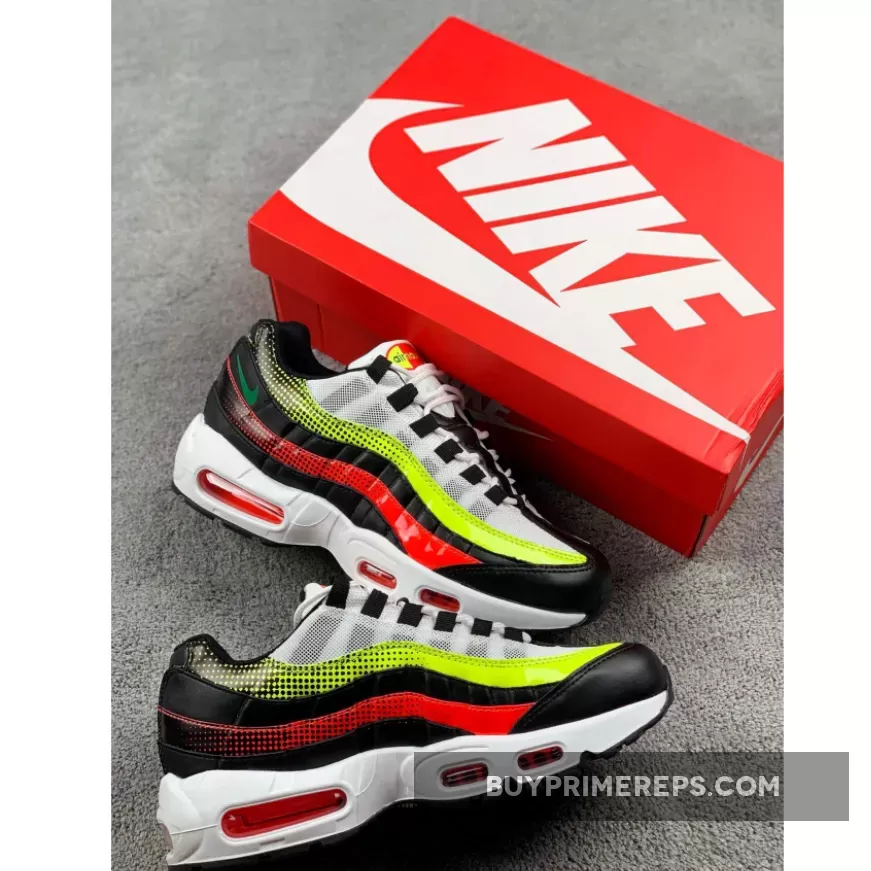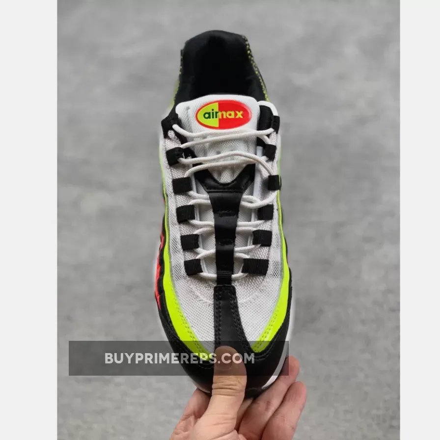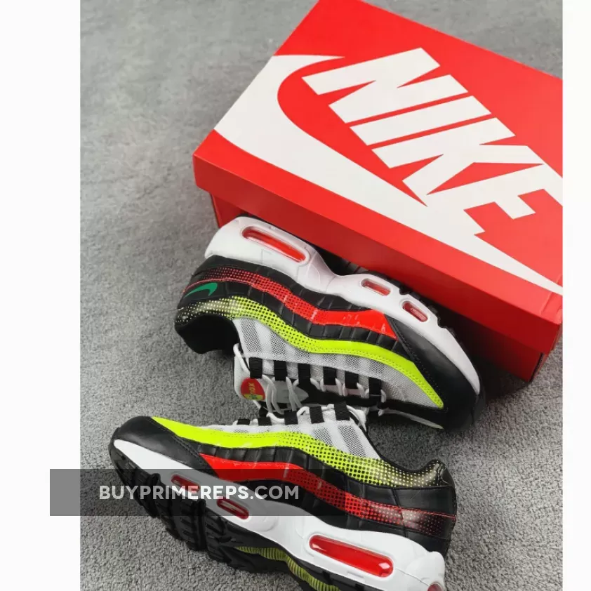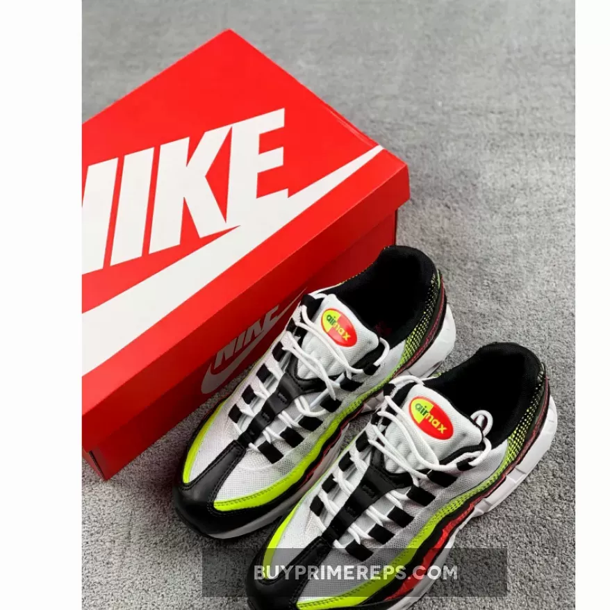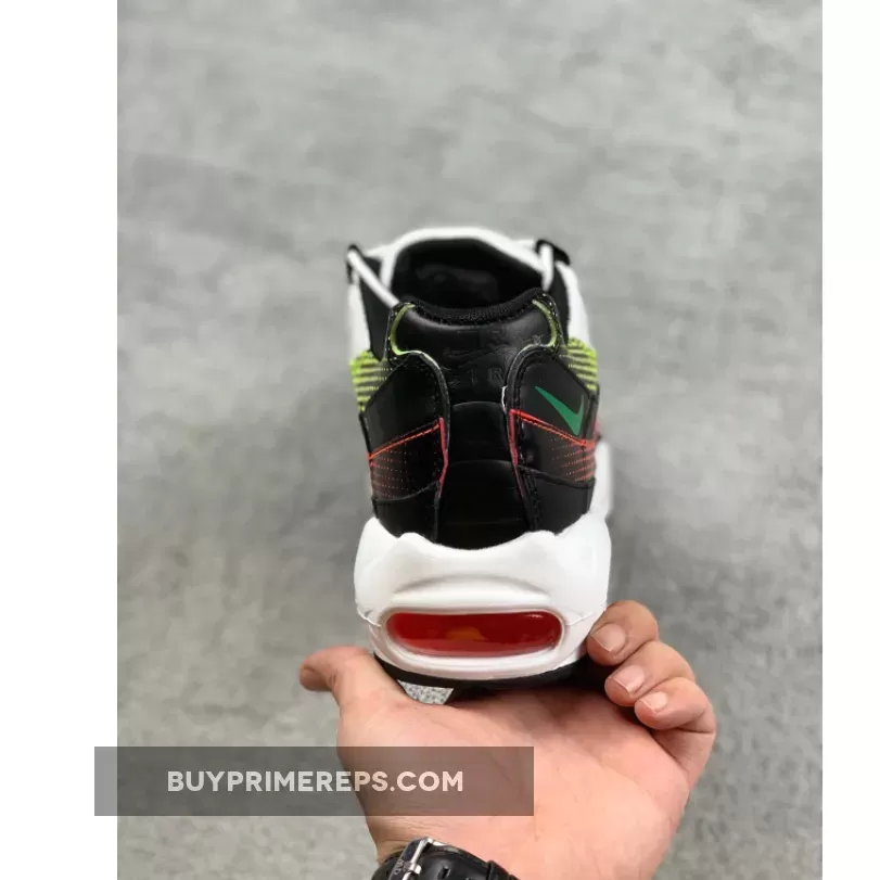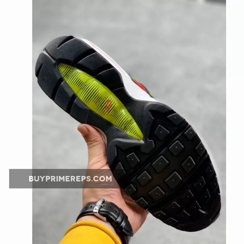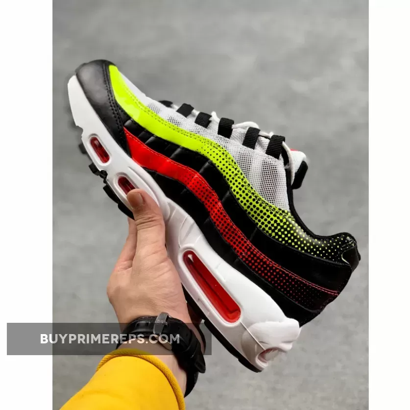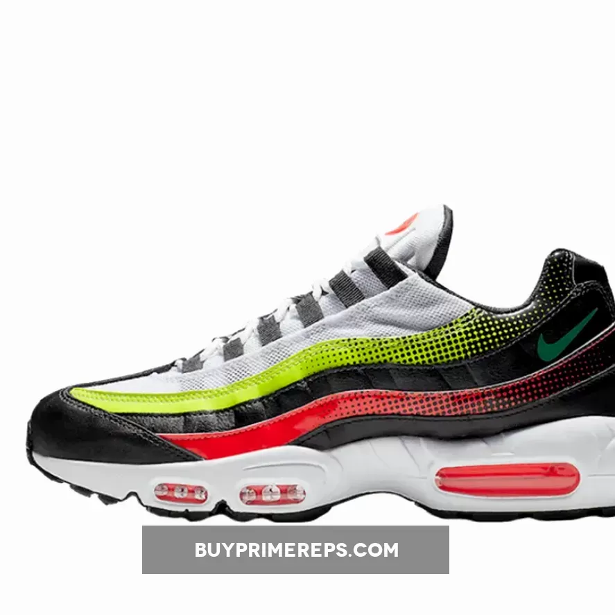 The color palette of the Air Max 95 White Black Volt is what really sets it apart. The shoe features a clean white base with bold red and vibrant volt accents throughout. These pops of color provide a striking contrast against the white backdrop. One of the standout features of this shoe is the fading effect of the colors towards the heel. The red and volt hues slowly transition into black, creating a visually appealing gradient effect.