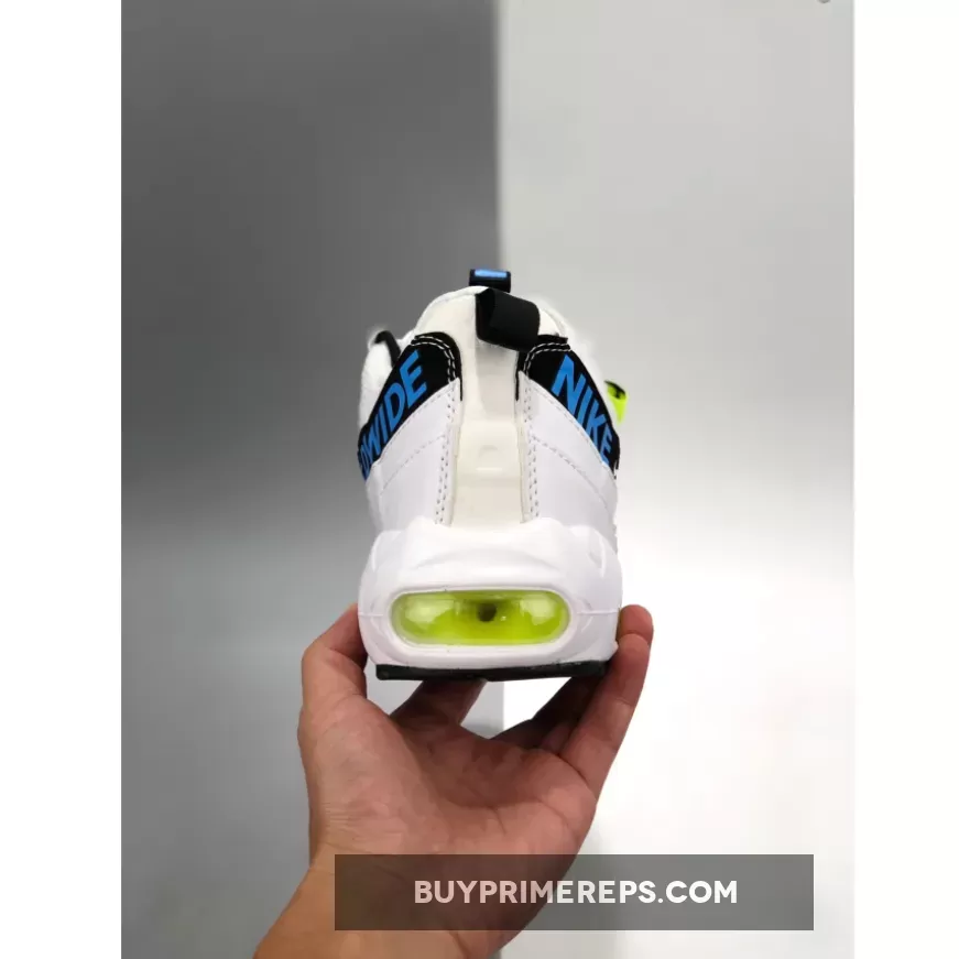 The Air Max 95 ‘Worldwide’ features a white leather upper that exudes a timeless appeal. The wavy side overlays, a signature design element of the Air Max 95, are rendered in a contrasting black finish, adding depth and dimension to the shoe. The bold and vibrant ‘Nike Worldwide’ branding is prominently displayed on an extended pull tab atop the tongue, making a powerful statement about the global reach of the brand.