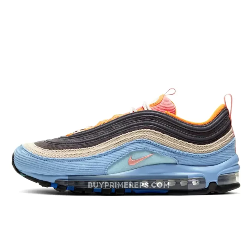 To complete the look, the shoe is finished off with a rubber outsole that offers traction and durability. Whether you’re wearing them for a casual day out or for a sporty look, the Nike Air Max 97 Corduroy Pack Blue is sure to turn heads and make a statement.