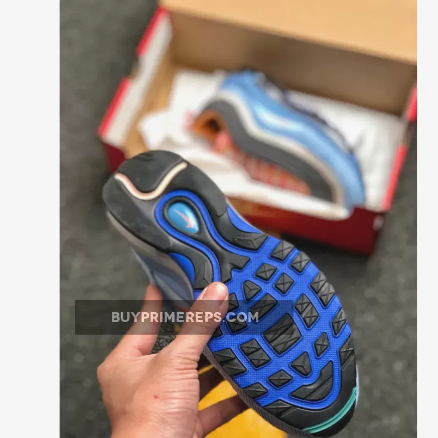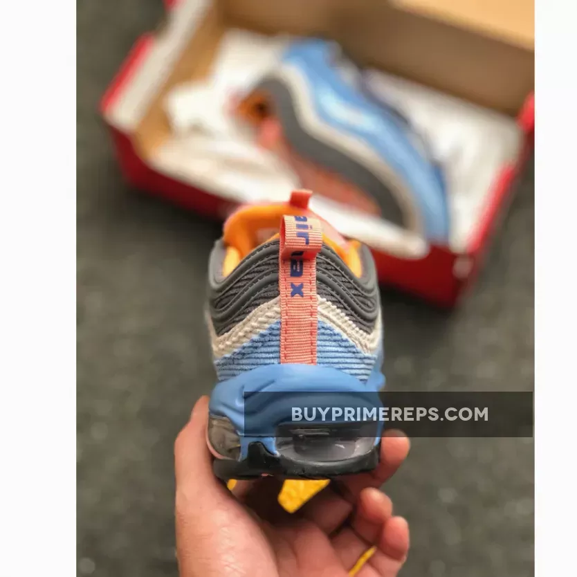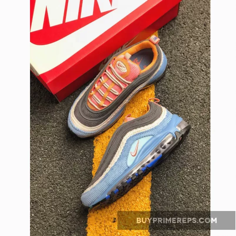 Underneath it all, the Air Max 97 Corduroy Pack Blue is equipped with a bright midsole that houses the visible Max Air unit. This Air unit provides cushioning and support, making the shoe not only stylish but also comfortable to wear.