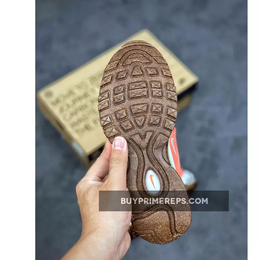 The Nike Air Max 97 Cork Pink also features a transparent cassette in the full-length Air unit, showcasing the white construction inside. This transparent design element adds depth and visual intrigue, allowing wearers to appreciate the innovative technology that provides superior cushioning and comfort.