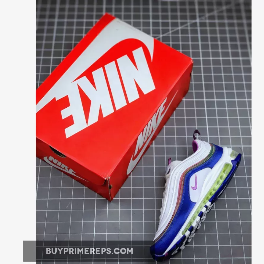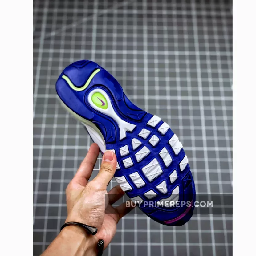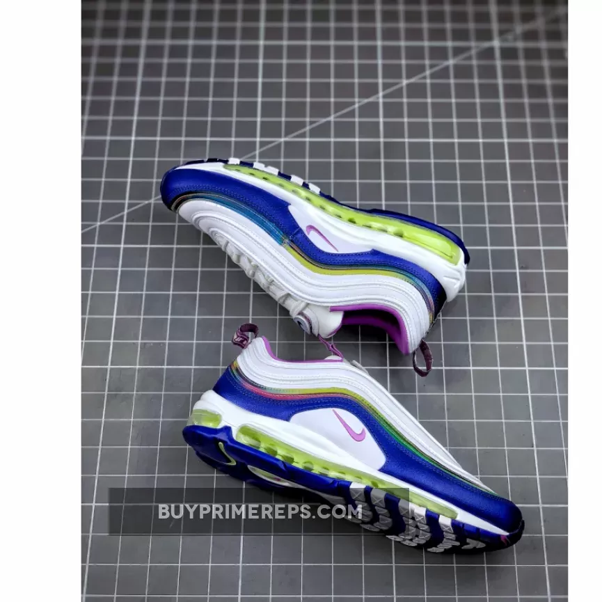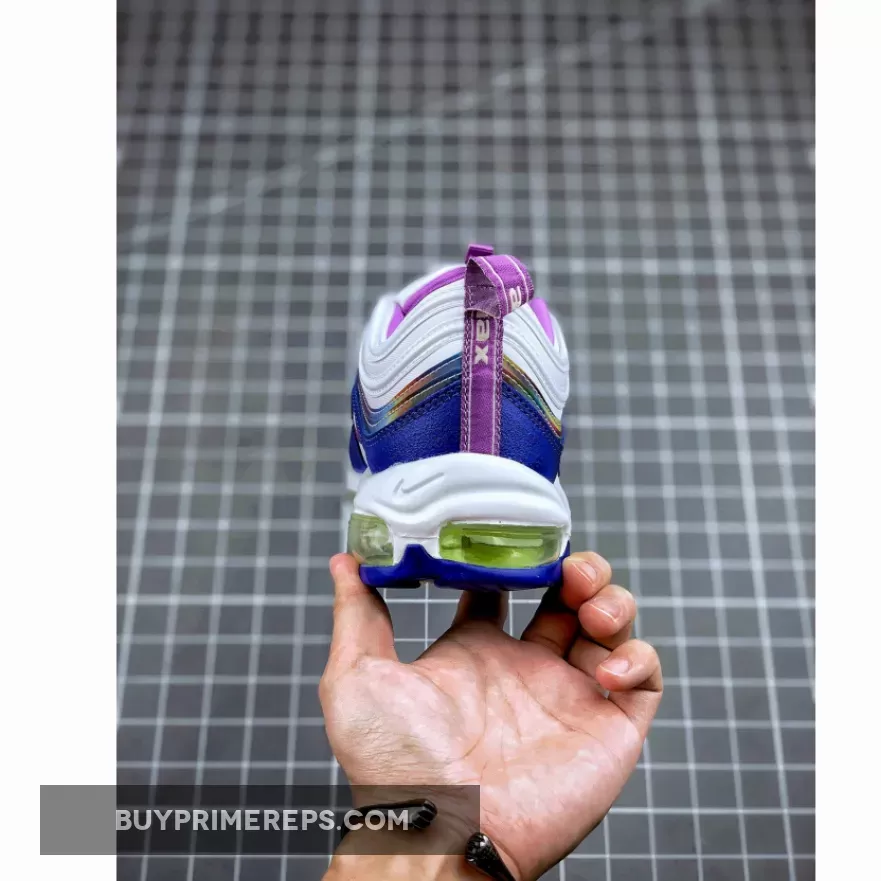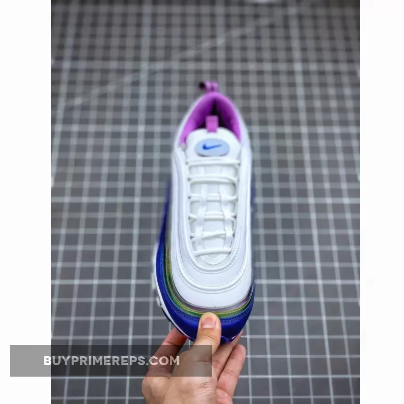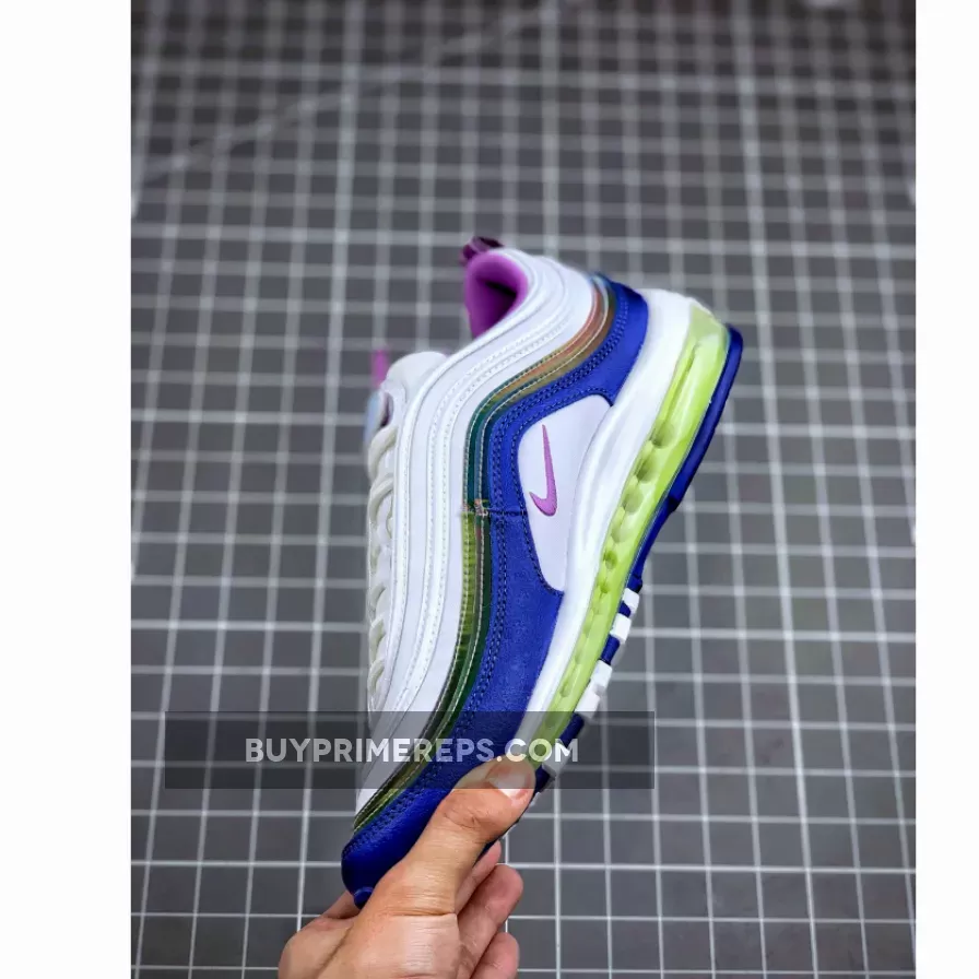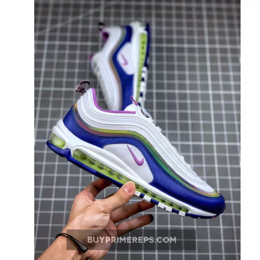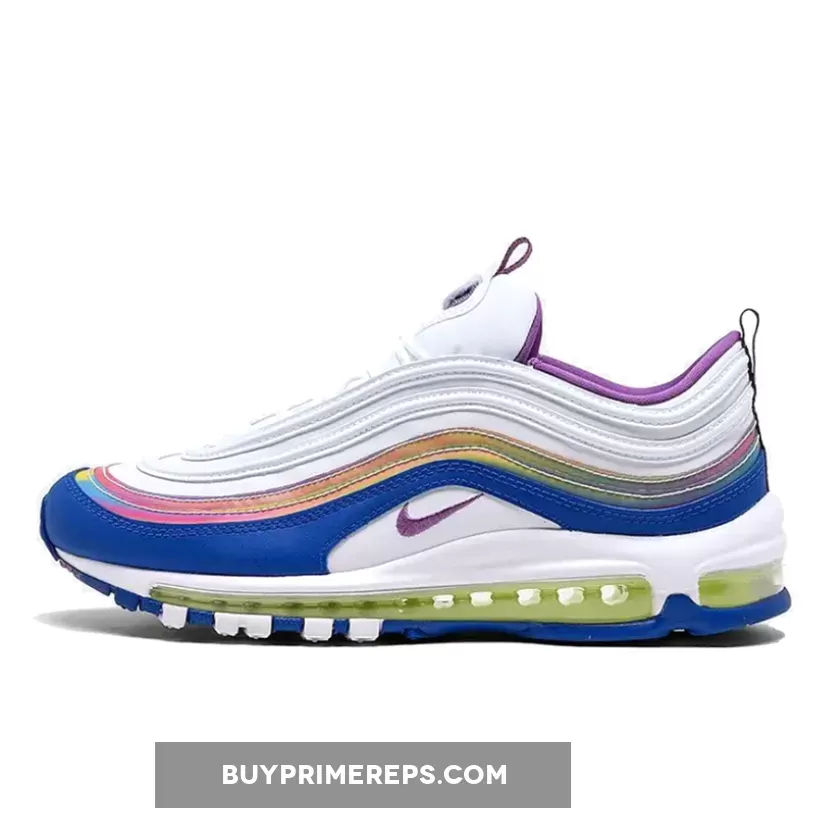 The upper of the Nike Air Max 97 Easter combines a white mesh base with wavy leather overlays in various shades of multicolor and Game Royal Blue. These colorful accents are not only visually appealing but also have a reflective coating, ensuring visibility even in low-light conditions. The combination of the white and multicolor elements creates a striking contrast that adds to the shoe’s overall aesthetic.