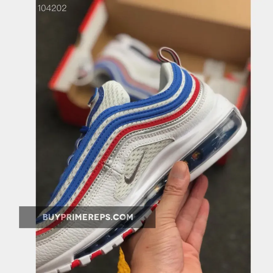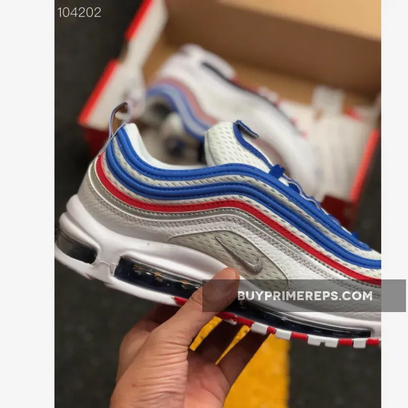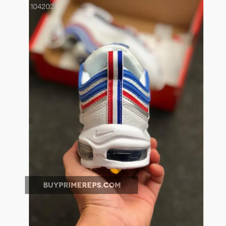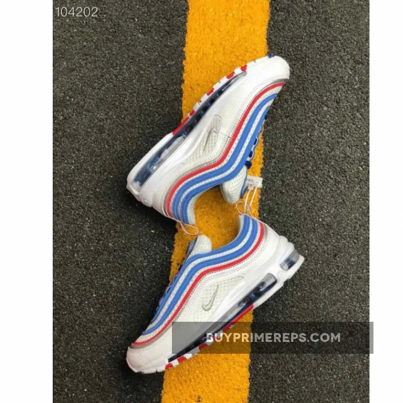 The upper of the Nike Air Max 97 Game Royal is constructed with a jersey-style material, reminiscent of basketball or football jerseys. The white mesh base is lightweight and breathable, providing optimal comfort for all-day wear. Reflective red and royal blue piping adds a touch of flair and enhances visibility, making this sneaker stand out from the crowd.