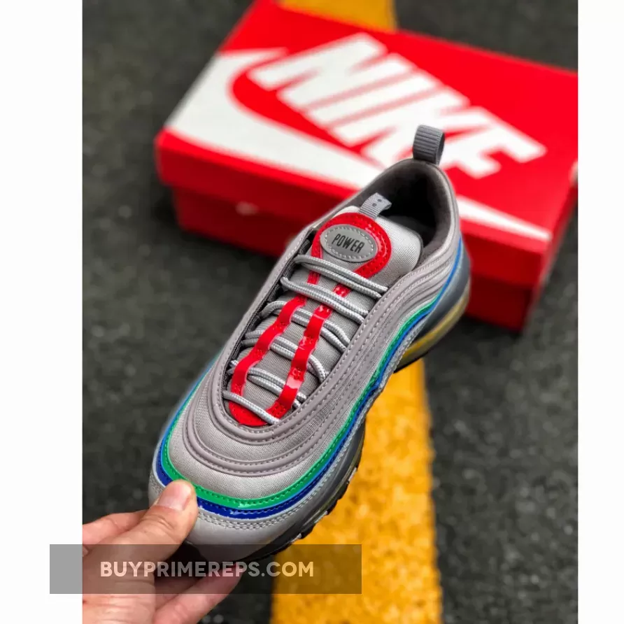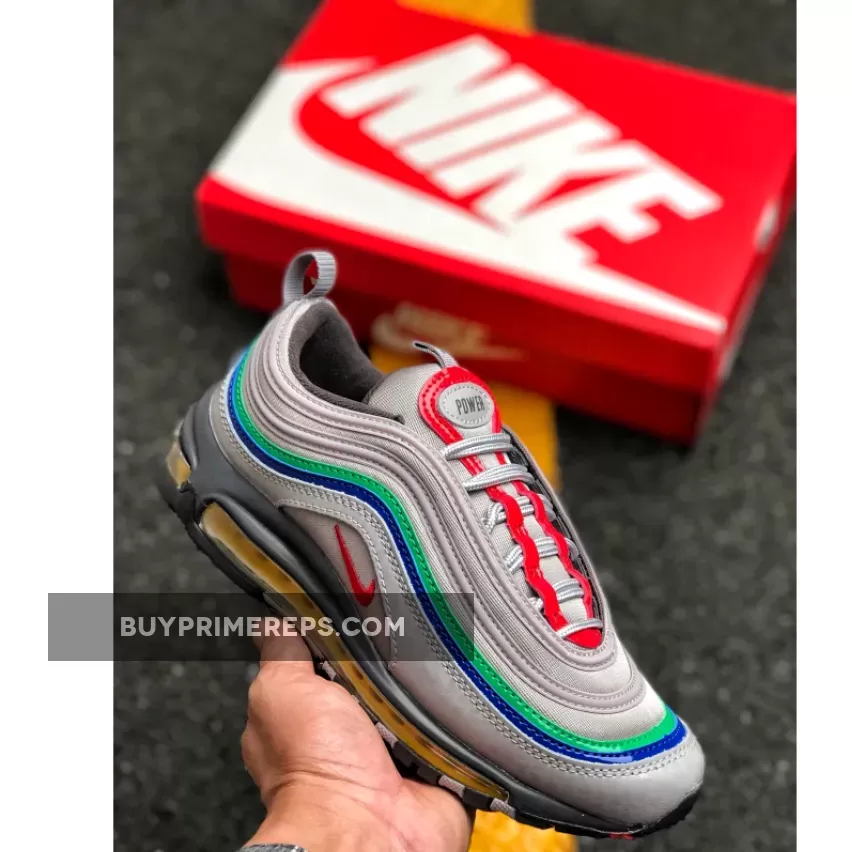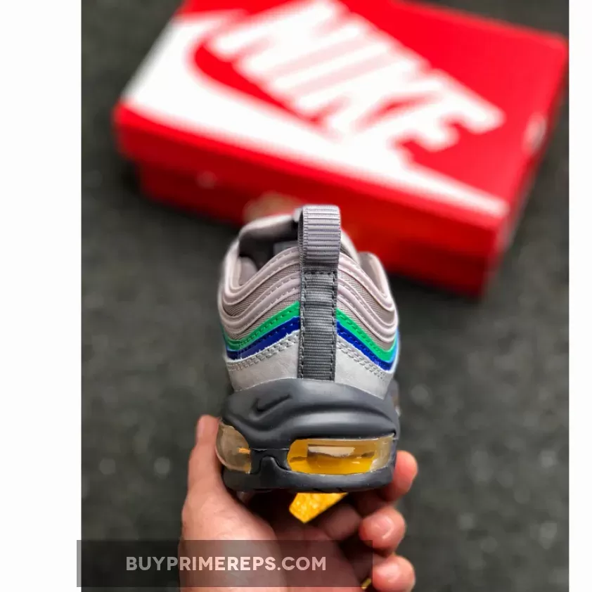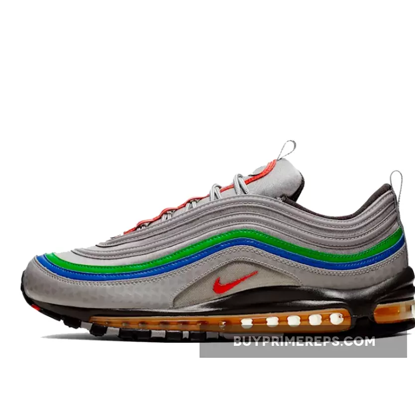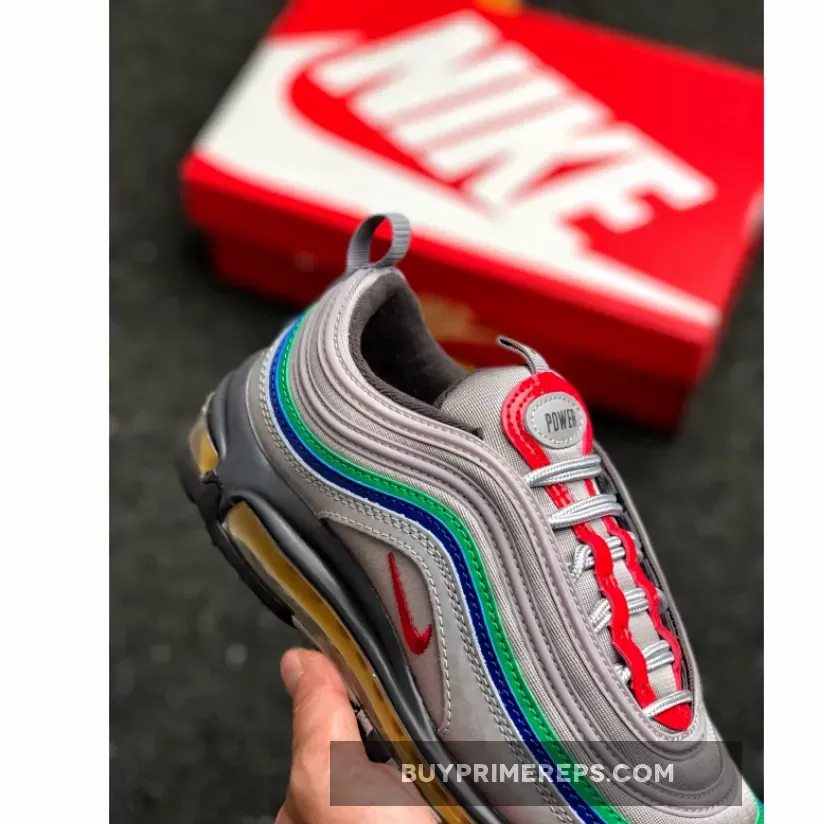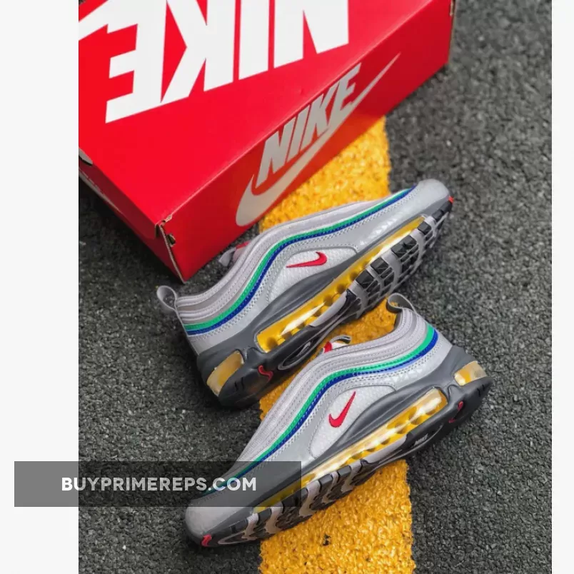 The Air Max 97 Nintendo 64 features a sleek and sporty design, with a light grey mesh upper and leather overlays that pay homage to the N64 controller. The grey color palette is accented by pops of red, green, blue, and yellow, representing the buttons on the controller. These vibrant accents add a playful touch to the shoe and make it instantly recognizable as a tribute to the beloved gaming console.