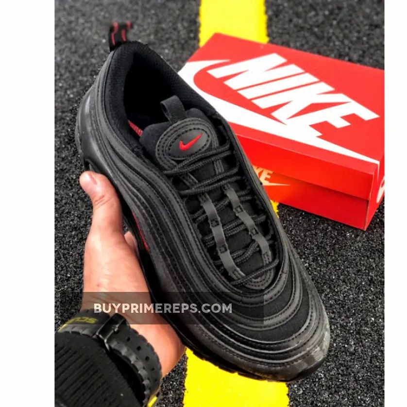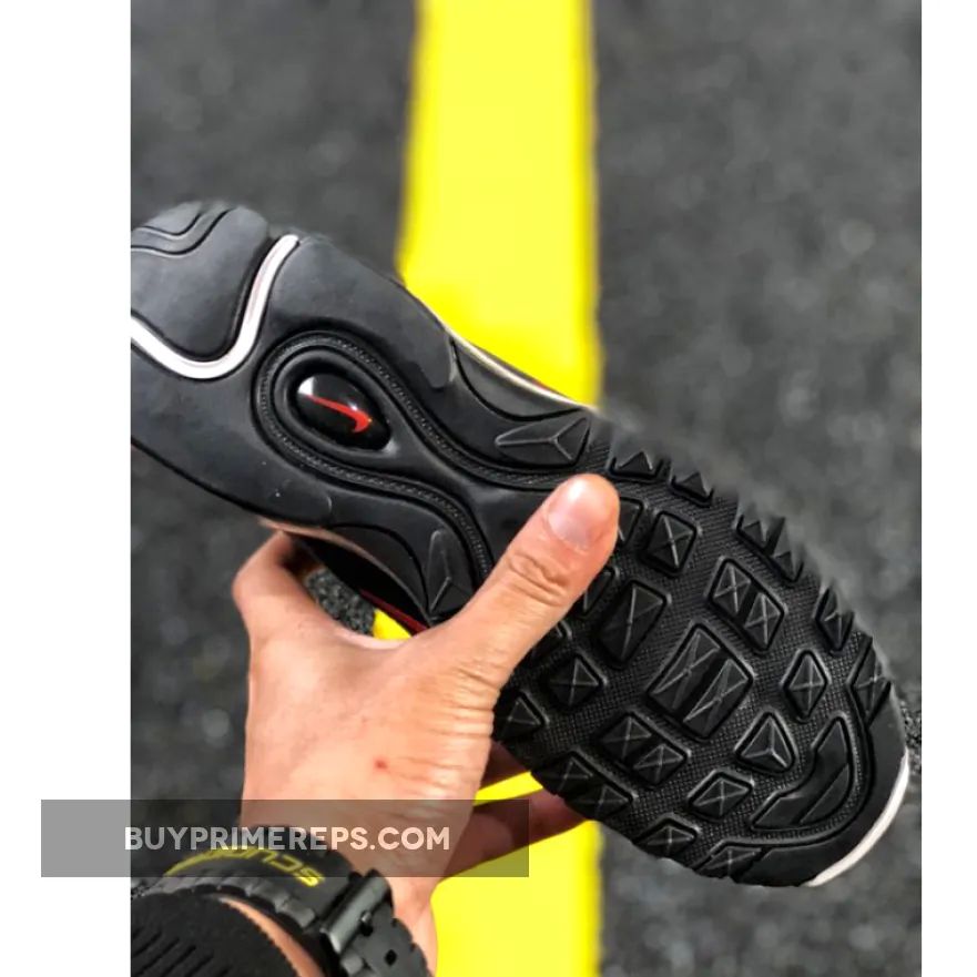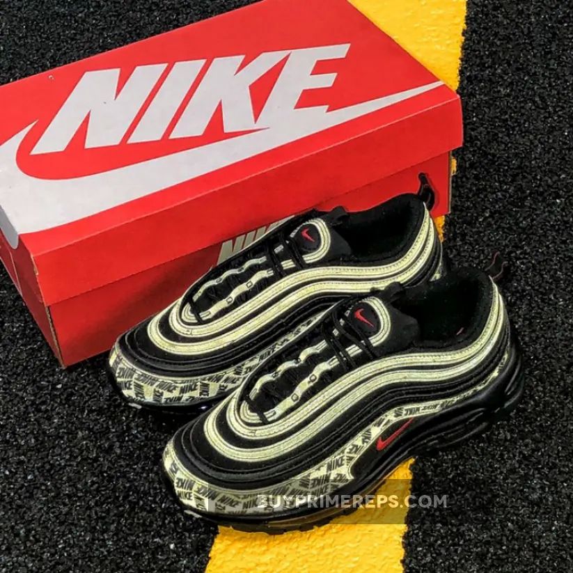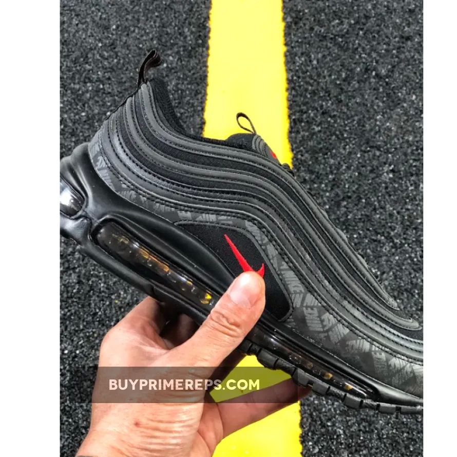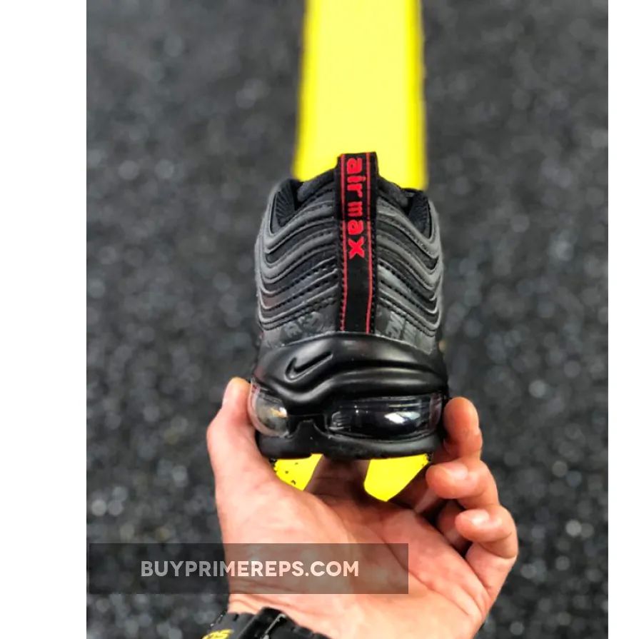 One of the standout features of this shoe is the reflective logos on the blacked-out mudguard. At first glance, the 97 appears to be a simple black pair with red highlights. However, upon closer inspection and with the help of light, the matte black Nike logos become visible, adding a unique touch to the overall design.