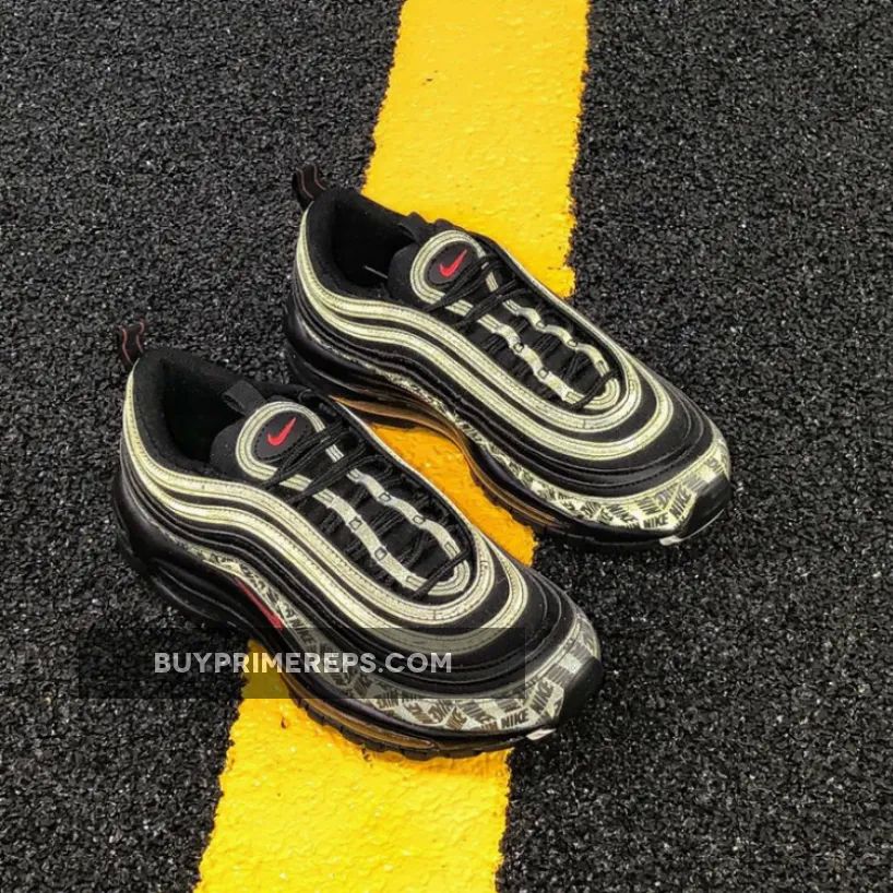 The Nike Air Max 97 Reflective Logos Black AR4259-001 is a highly sought-after sneaker that combines classic design elements with a modern aesthetic. Drawing inspiration from Japanese bullet trains, this shoe features a sleek black colorway with contrasting red accents on the Swoosh logos and heel tab.