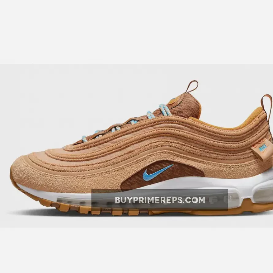 One notable detail of the Nike Air Max 97 Teddy Bear is the mid-panel cutout, where a chocolate brown woven fabric peeks through and reveals an embroidered University Blue mini Swoosh. This subtle touch of color adds a playful element to the overall design. The tongue of the shoe is also made from the same brown woven fabric, creating a cohesive look. A tan leather tongue tab with embroidered University Blue Swooshes further enhances the style.