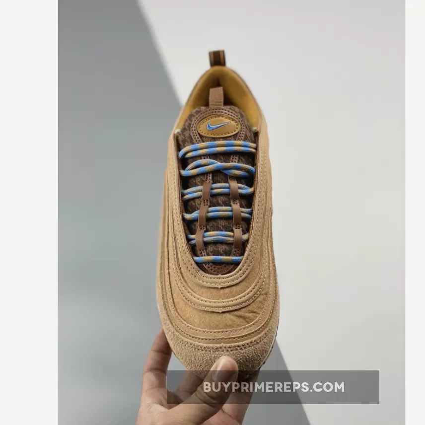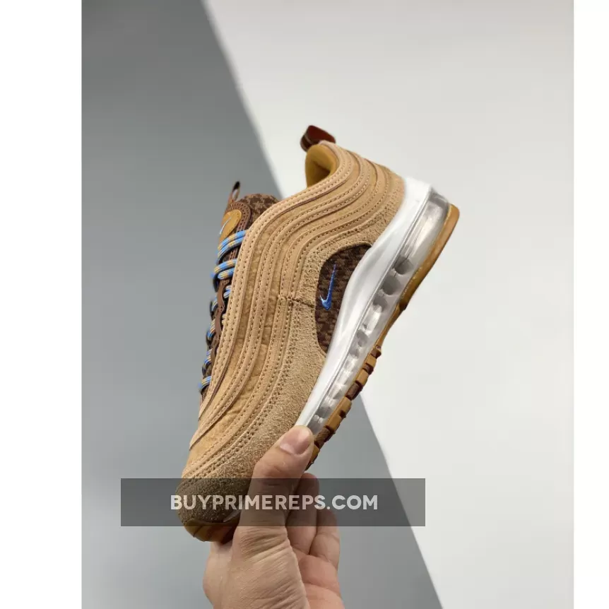 The rope laces of the Nike Air Max 97 Teddy Bear are a gradient mix of brown and blue, adding a dynamic touch to the shoe’s aesthetic. The attention to detail continues on the brown mesh insole, which features an adorable brown and blue teddy bear graphic. This whimsical addition adds a touch of personality and charm to the sneaker.