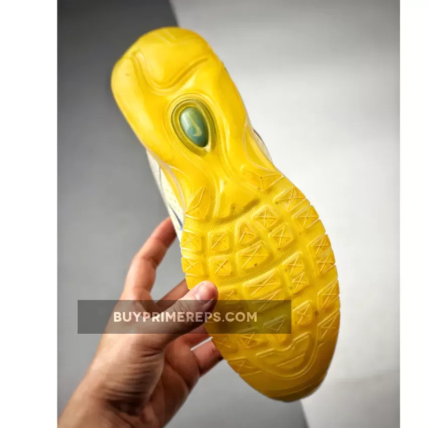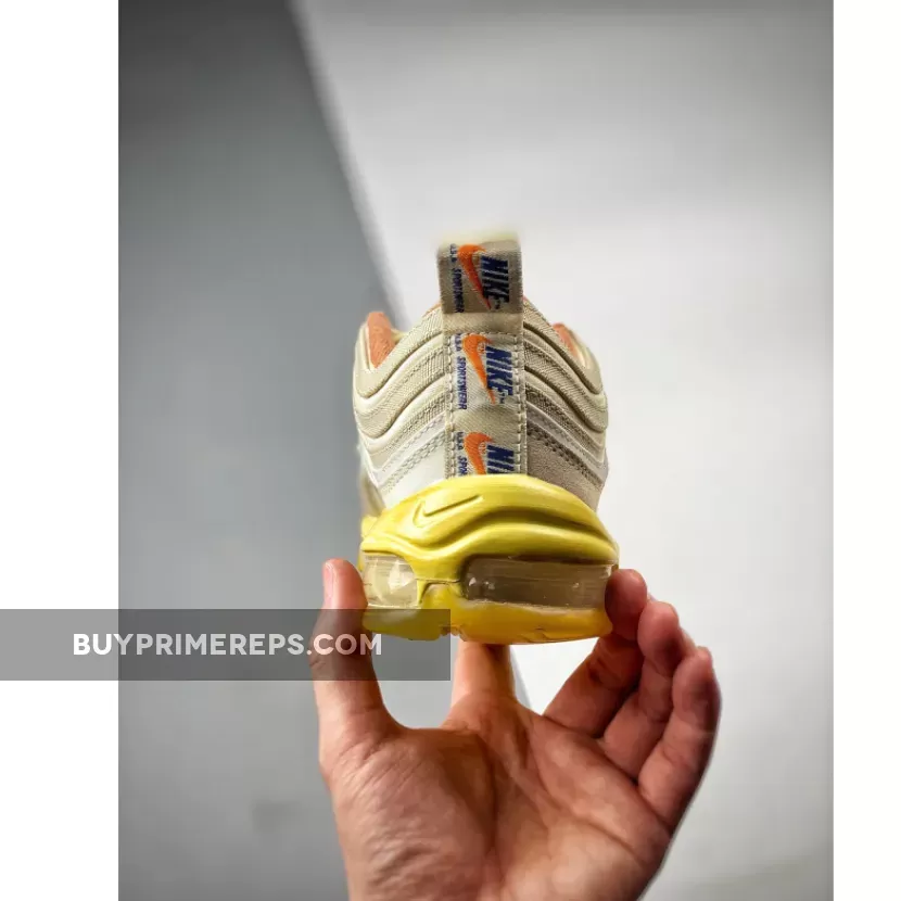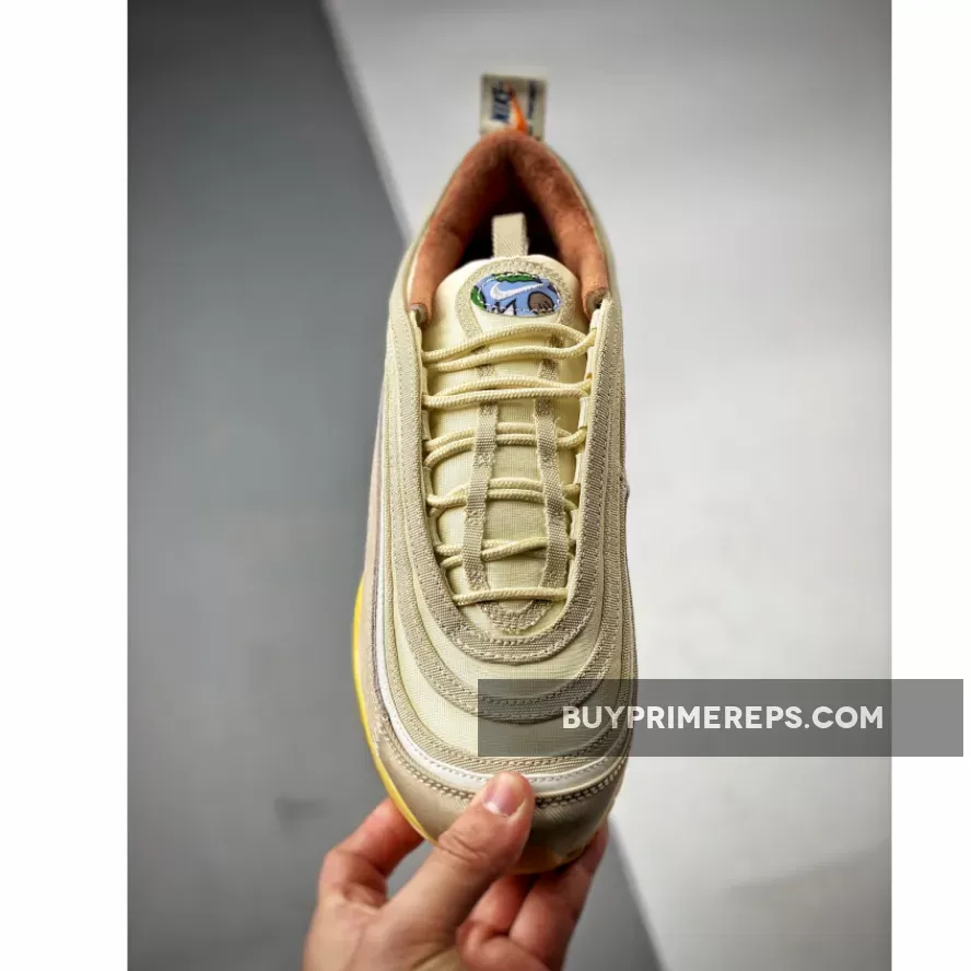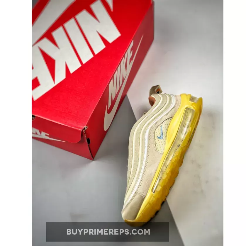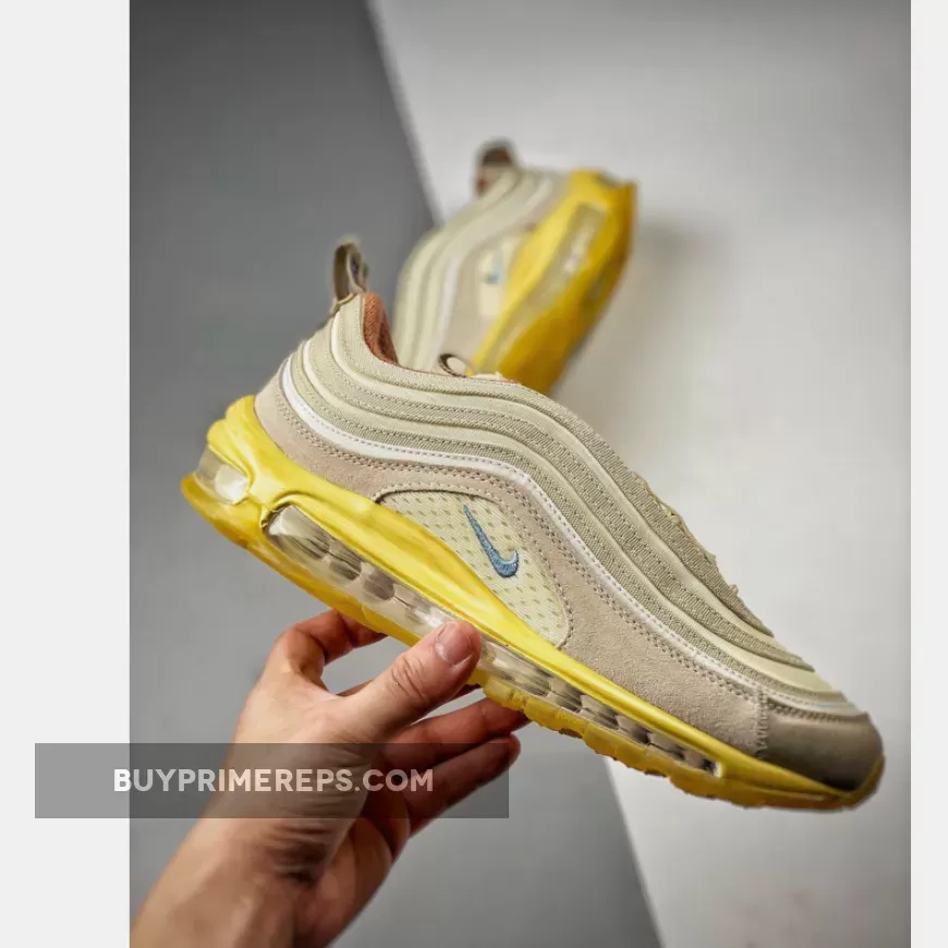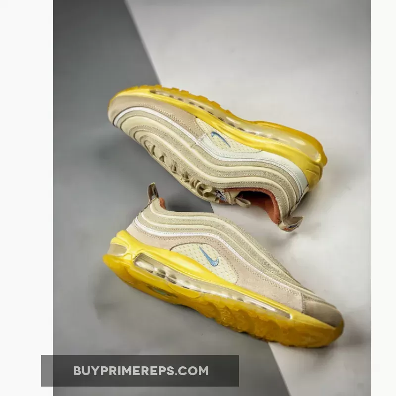 The midsole of the Nike Air Max 97 Retro Tan Gum is a sunny yellow color, which adds a vibrant contrast to the tan and gum upper. The midsole also features a full-length Air unit in clear casing, providing cushioning and support for all-day comfort. The outsole of the shoe is made from translucent gum rubber, adding a classic touch and providing excellent traction.