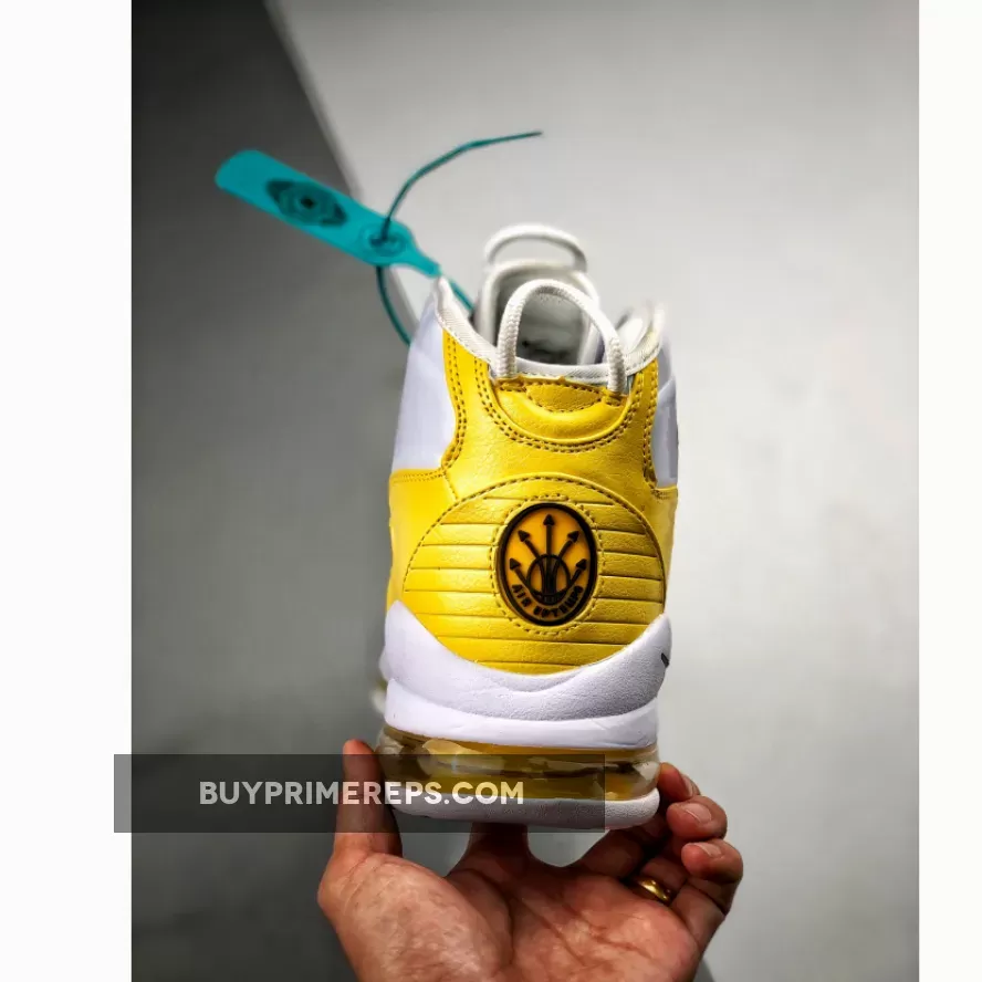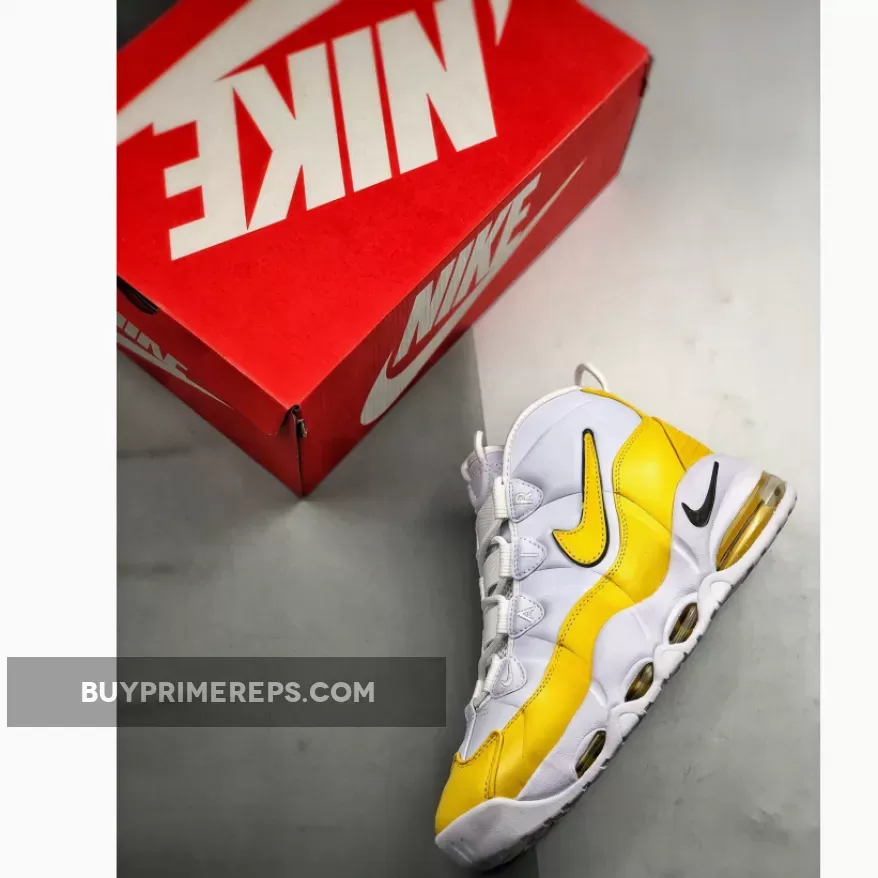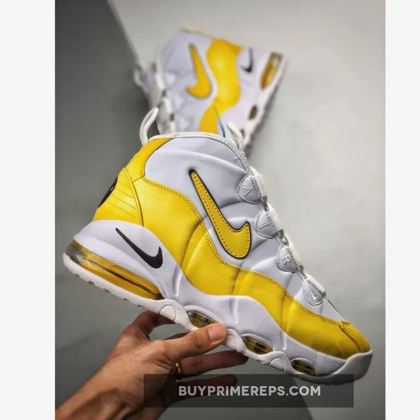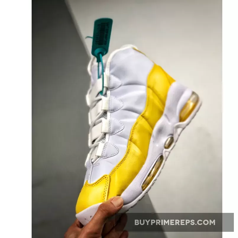 The Nike Air Max Uptempo 95 “Derek Fisher PE” features a clean white leather upper, giving it a fresh and timeless look. The yellow overlays add a pop of color and create a striking contrast against the white base. The Lakers’ signature purple accents can be seen on the outline of the iconic Swoosh and the midsole, adding a touch of team pride to the design.