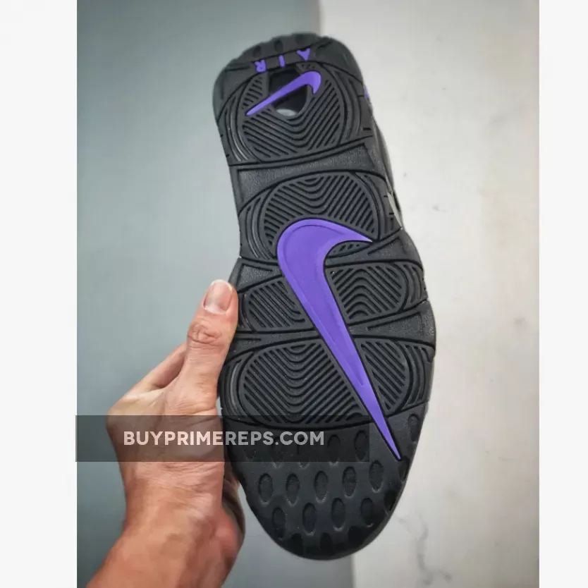 The lower design of the Nike Air More Uptempo 96 Action Grape features a treaded rubber midsole in Black, providing optimal traction and grip on various surfaces. This ensures stability and confidence with each step, whether you’re walking on city streets or hitting the basketball court.