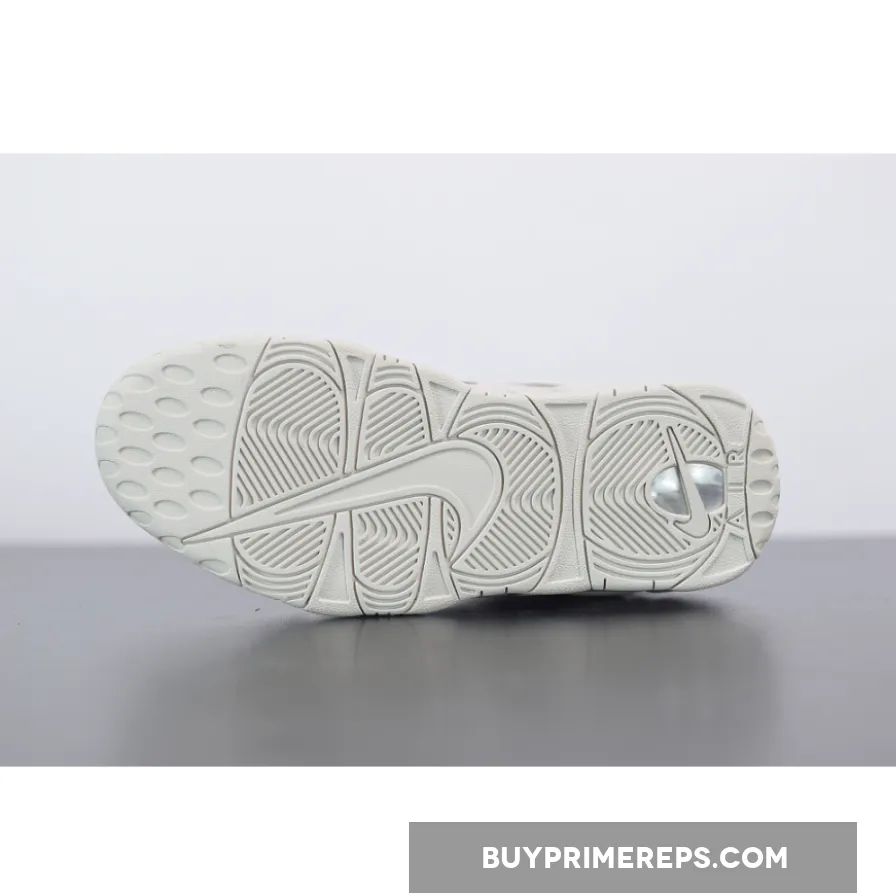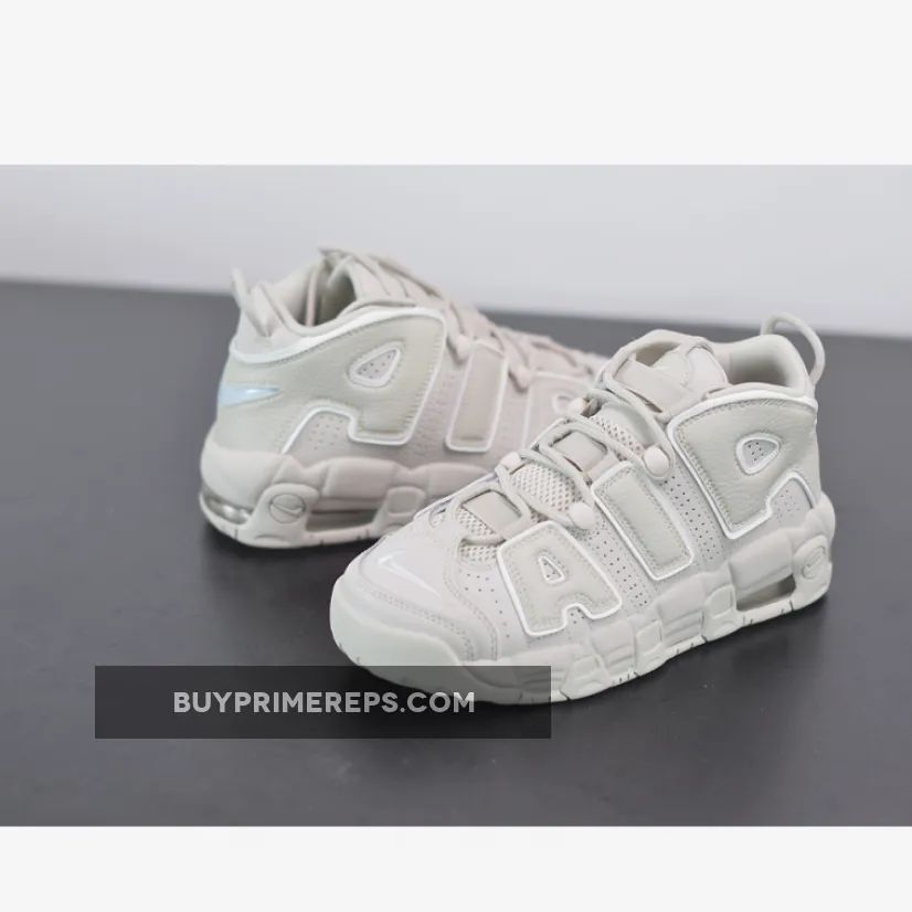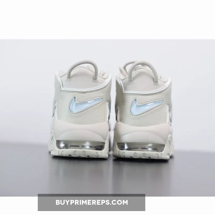 One of the standout features of the Air More Uptempo is the oversized “AIR” branding along the sidewall. In this Light Bone colorway, the branding is outlined in white, adding a subtle contrast to the overall design. The Nike Swoosh logos can also be found on the toe box and heel, completing the classic look of the shoe.
