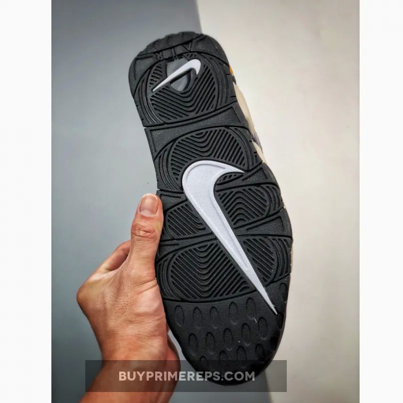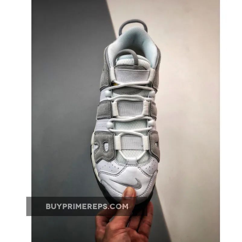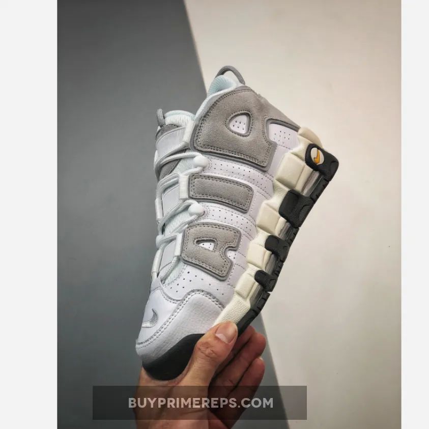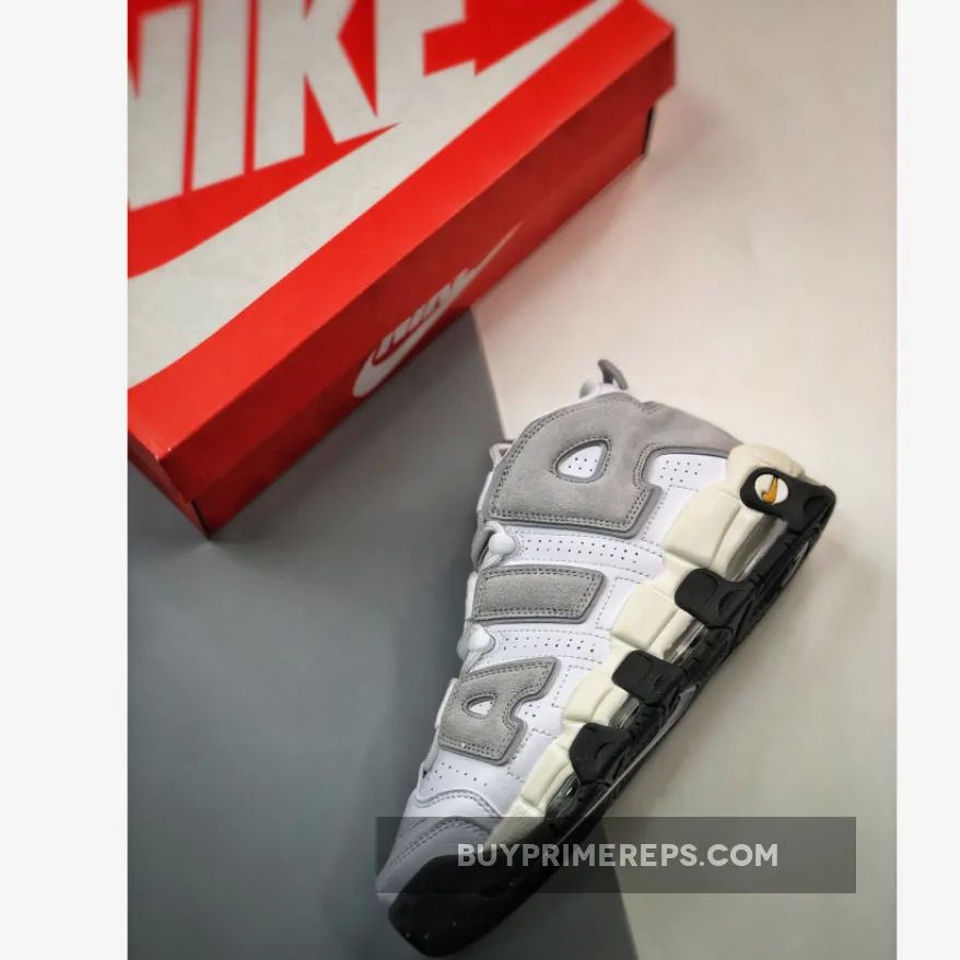 The midsole of the Air More Uptempo White Grey Black features a sail-colored construction, complete with exposed Air units for responsive cushioning and a comfortable stride. The outsole is finished in black rubber, providing durability and traction for everyday wear.