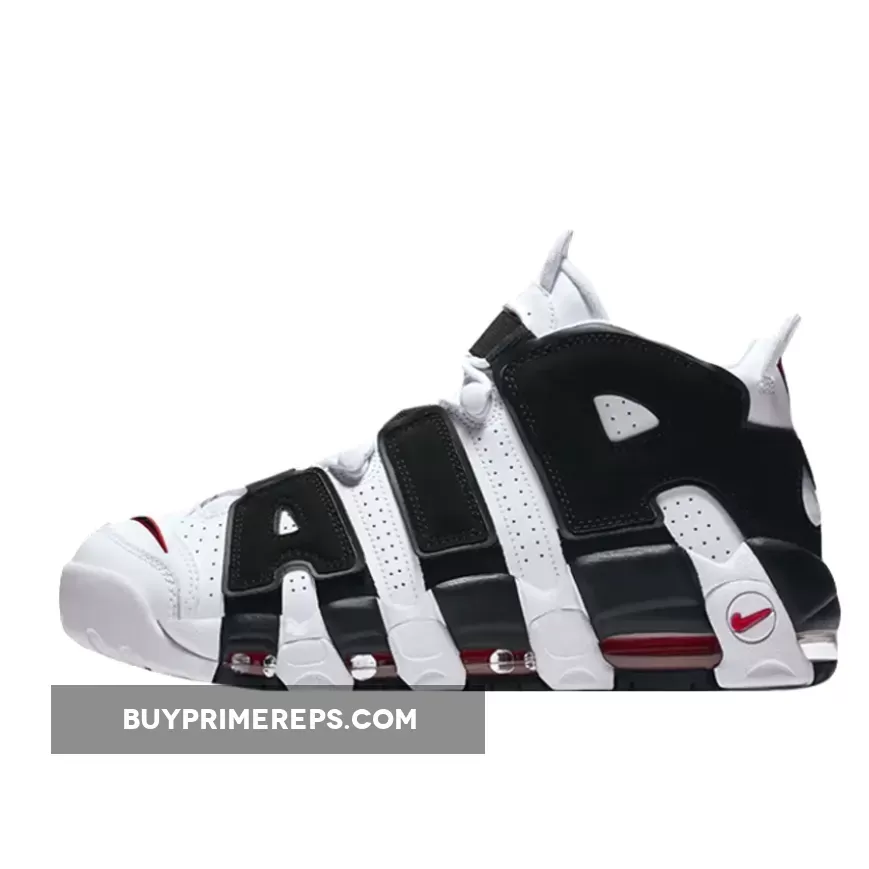 The Nike Air More Uptempo is a shoe that has gained a significant presence in the sneaker community, and the latest release in a White, Black, and Varsity Red colorway is poised to captivate sneakerheads once again. This new iteration of the classic Air More Uptempo exudes a sense of luxury with its premium leather construction, ensuring both durability and style. The predominantly white upper is punctuated by bold black accents, prominently featuring the oversized “AIR” lettering that extends onto the midsole, creating a striking zebra-like aesthetic.