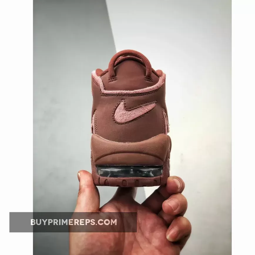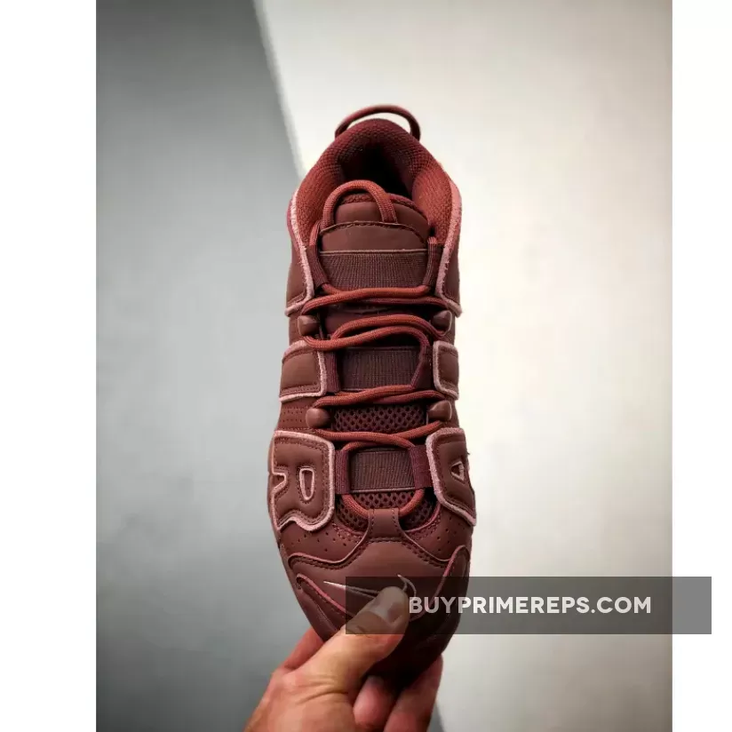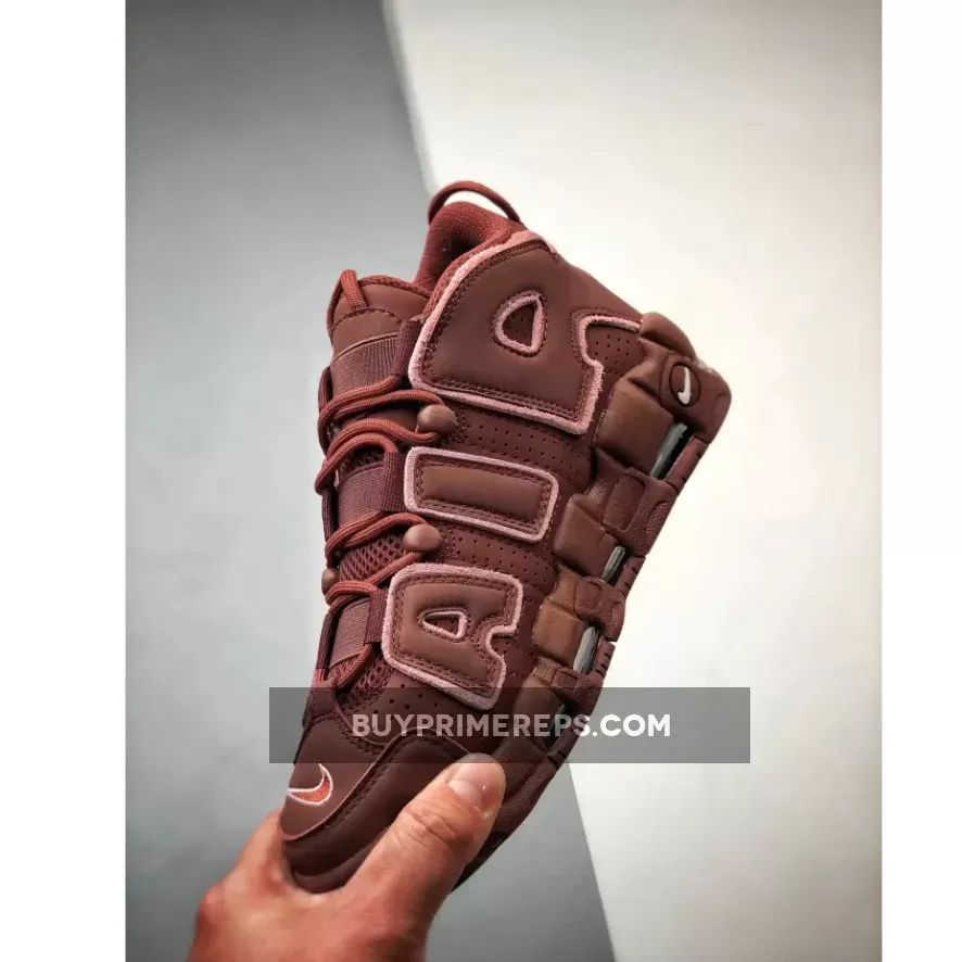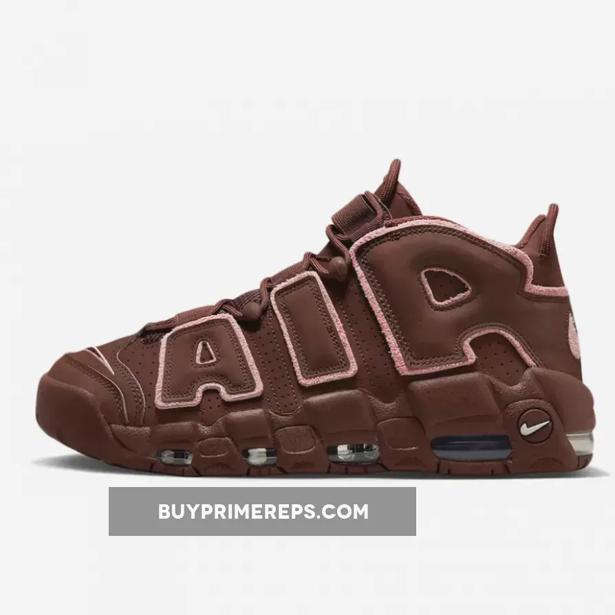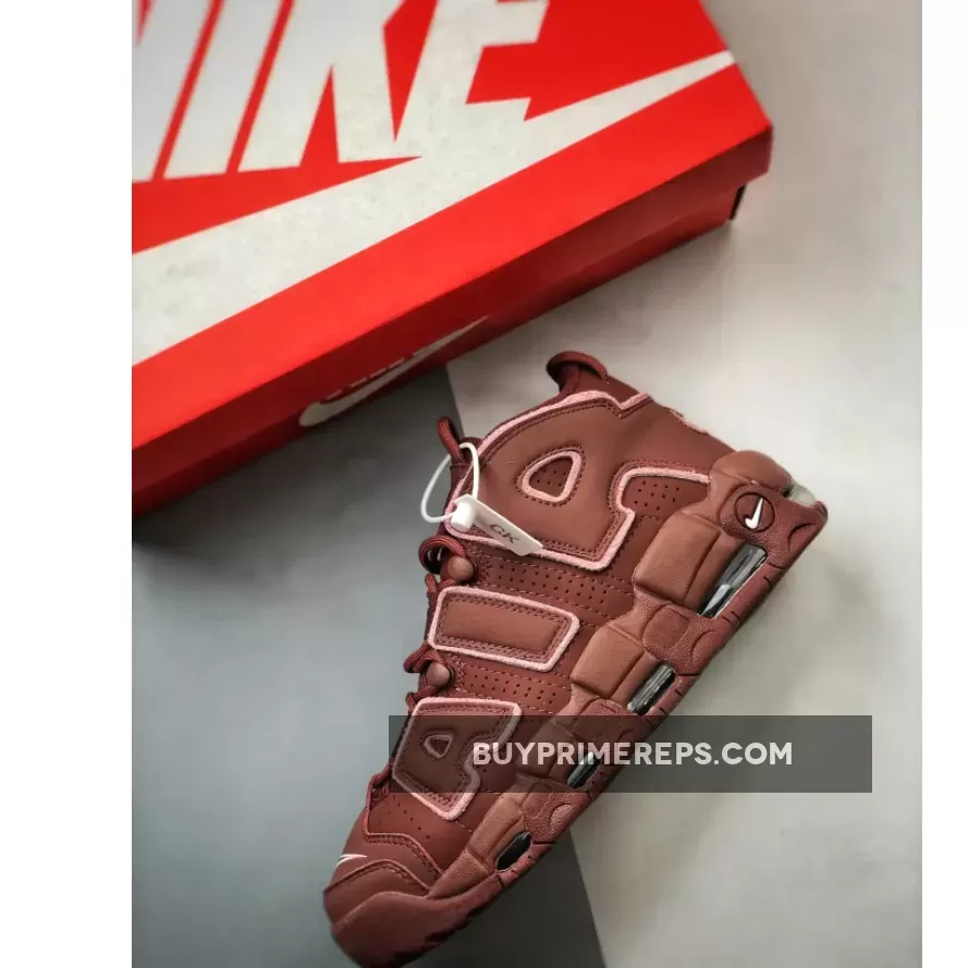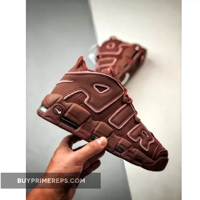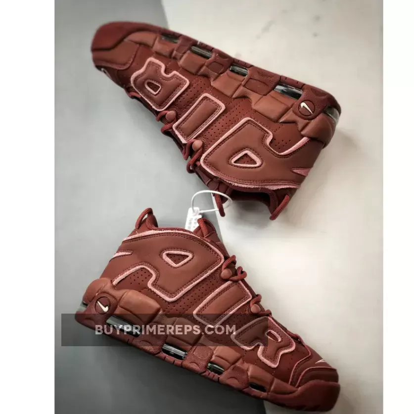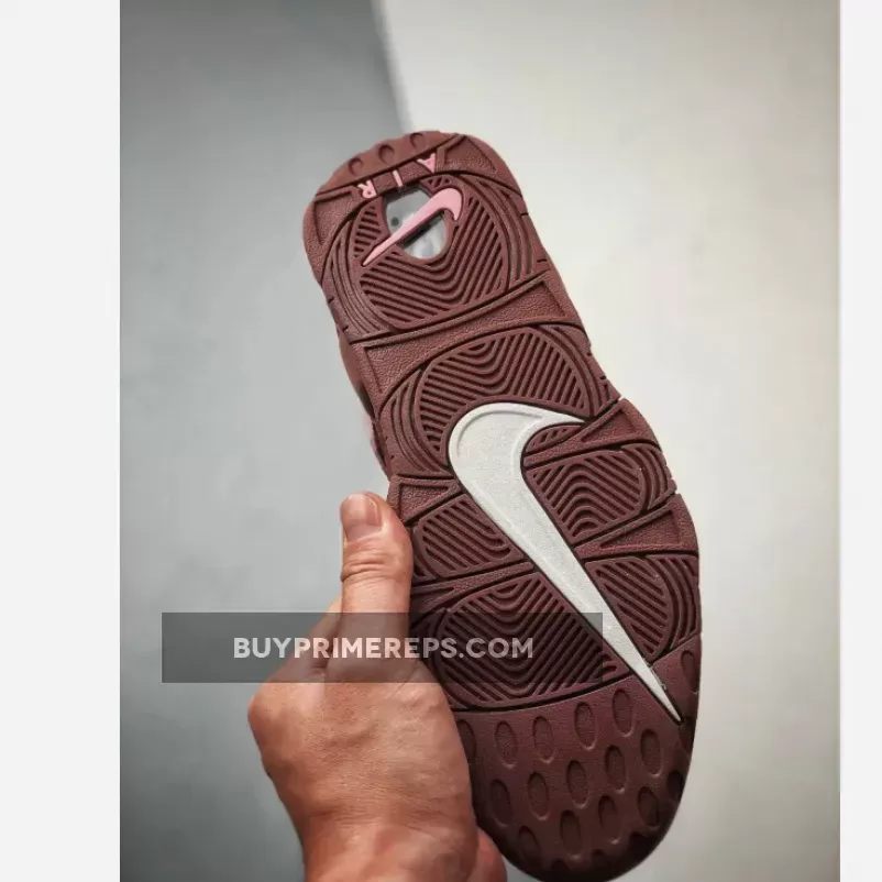 The upper of the Nike Air More Uptempo ‘Valentine’s Day’ is constructed with a rich burgundy nubuck material, giving the shoe a luxurious look and feel. The oversized “AIR” branding on the sidewalls is outlined in a soft pink color, adding a touch of femininity to the design. The same pink color is used for the mini-Swoosh on the pink outsole, creating a cohesive and stylish look.