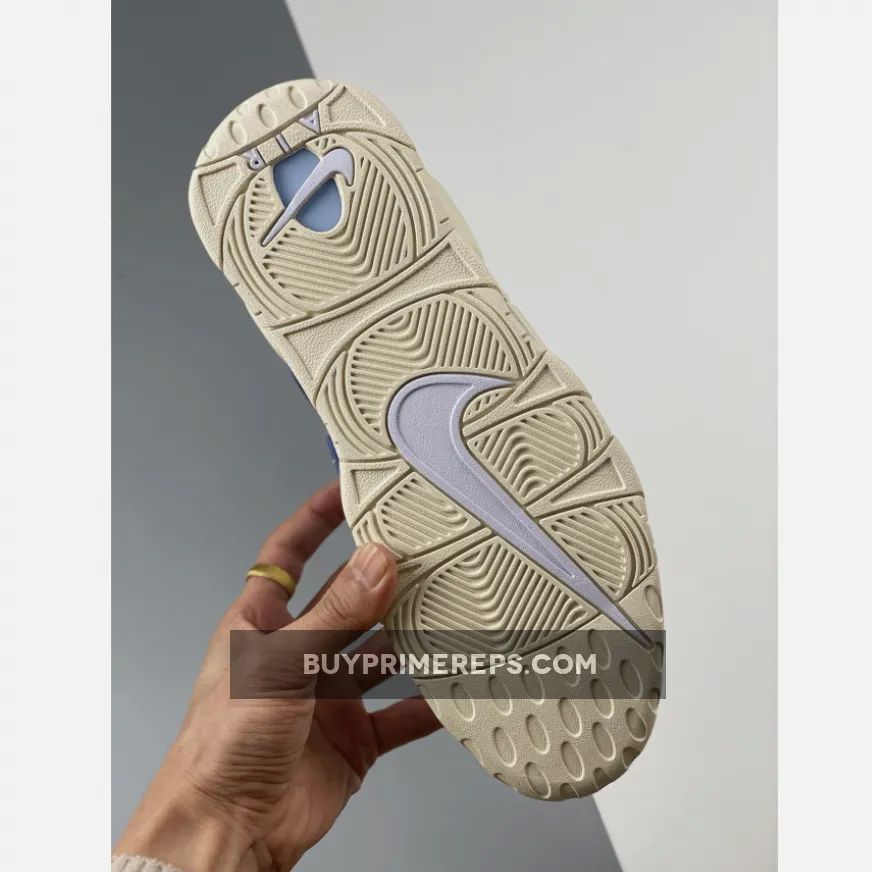 The midsole of the Nike Air More Uptempo White Blue is a creamy Sail color, adding contrast to the predominantly white upper. The midsole showcases exposed Air units from forefoot to heel, providing excellent cushioning and support with every step. The rubber outsole is also color-matched to the midsole, completing the overall look of the shoe.