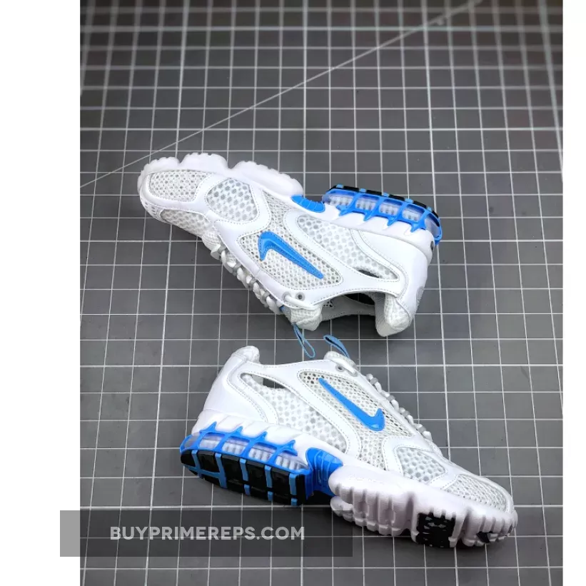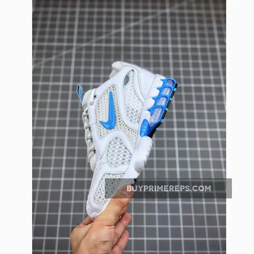 The upper of the Air Zoom Spiridon Cage 2 is constructed with a combination of mesh and canvas materials in a crisp white color. This provides a lightweight and breathable feel, perfect for the warmer months ahead. The iconic Nike Swoosh logo is prominently displayed on the side, while additional branding is seen on the tongue and heel in a striking University Blue color. This pop of color adds a retro touch to the overall design and gives the shoe a nostalgic feel.