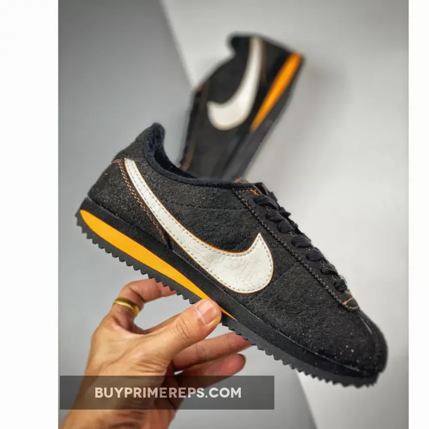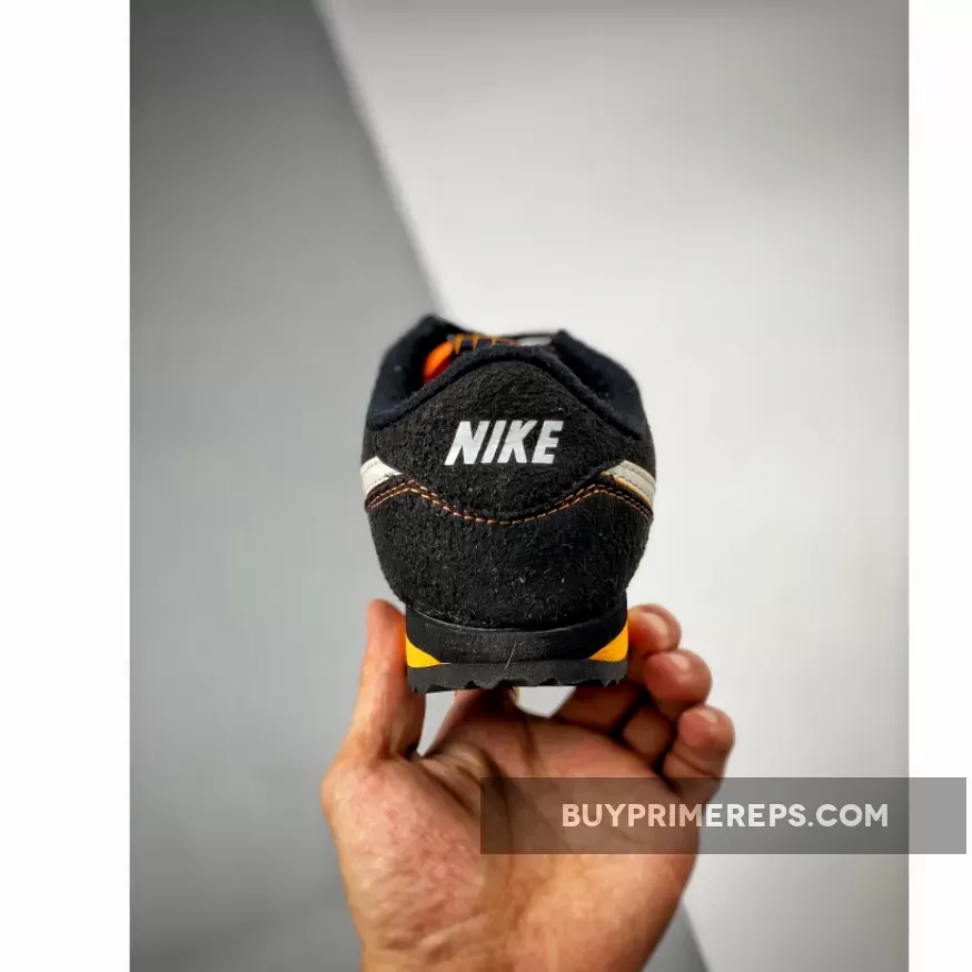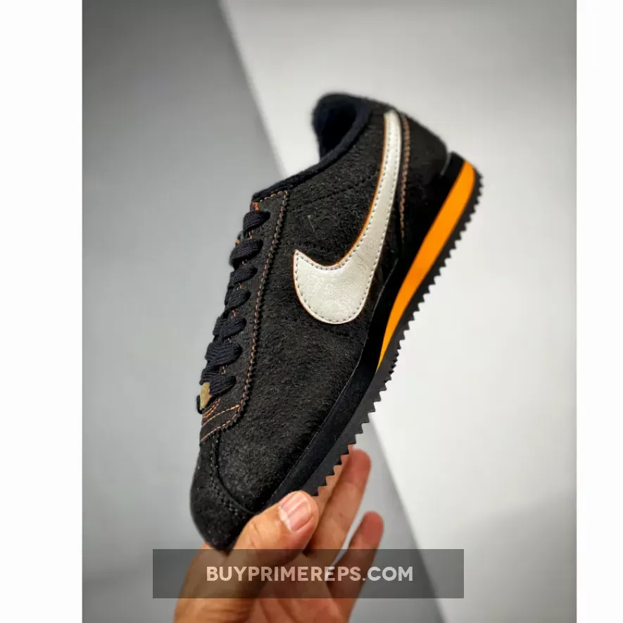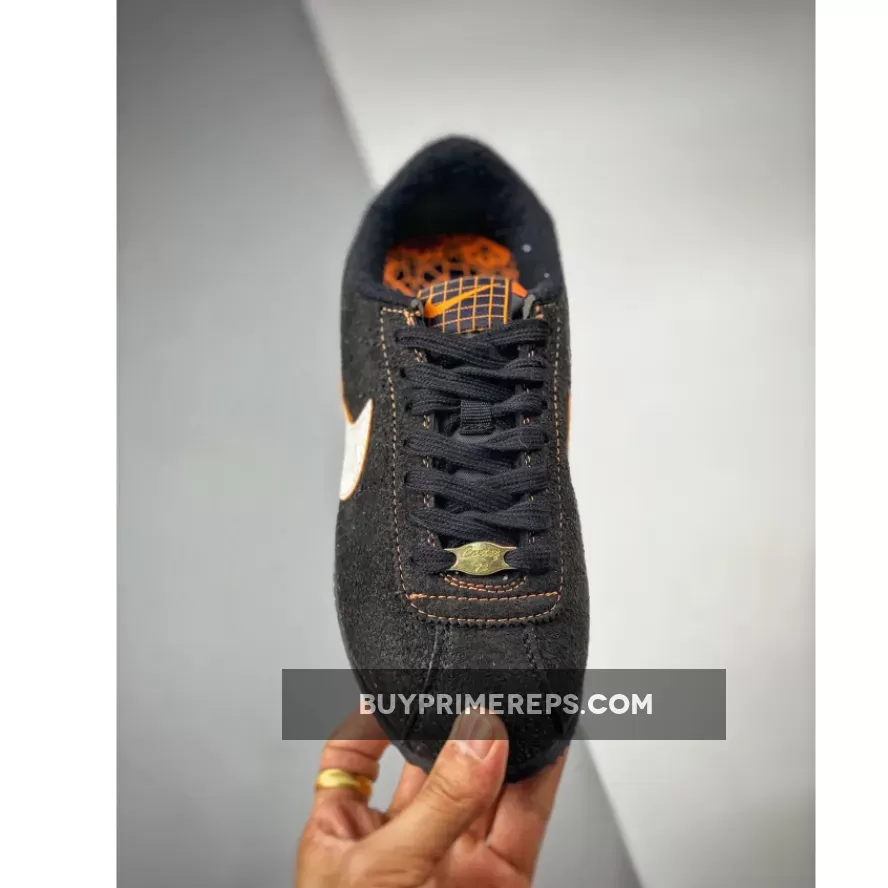 The design of the Cortez is innovative and streamlined, allowing for optimal performance and comfort during runs and everyday activities. The black-and-orange colorway of the Day of the Dead edition adds a unique and eye-catching touch to the shoe. The upper is made from smooth suede, giving it a luxurious and premium feel. The contrasting smooth leather Swoosh logo stands out against the black background, adding a stylish element to the design. The retro Nike logo is stamped on the back of the shoe, adding a nostalgic touch.