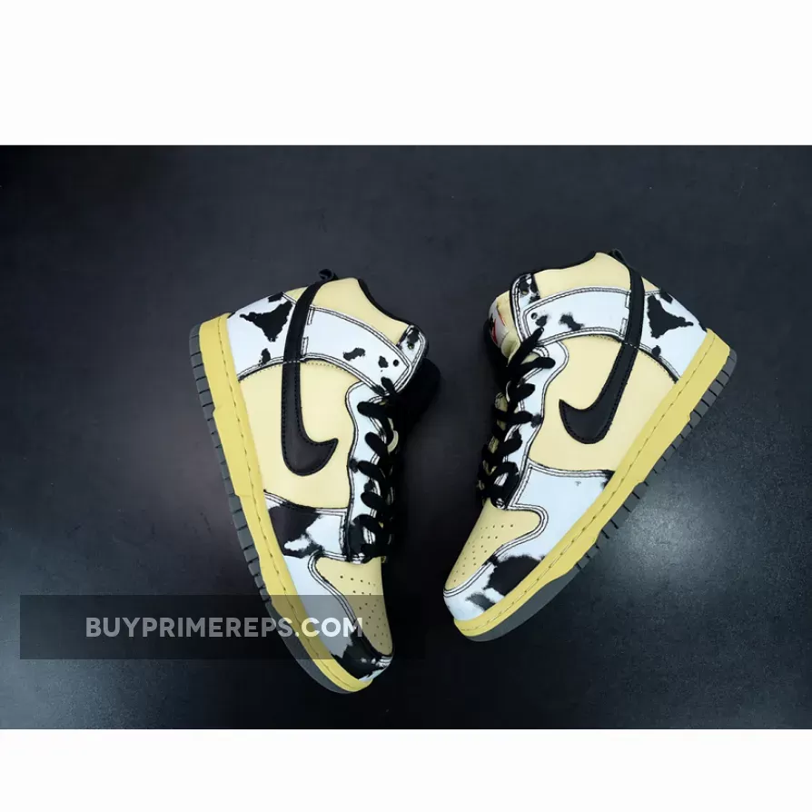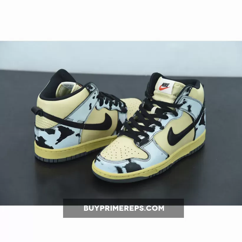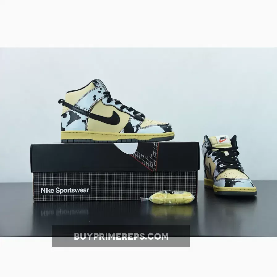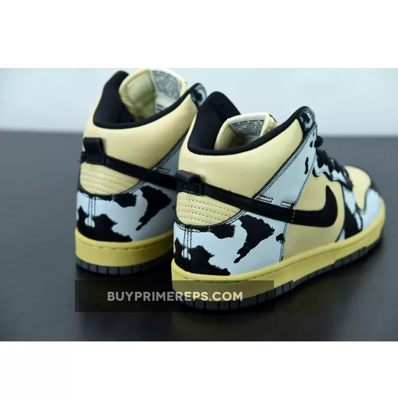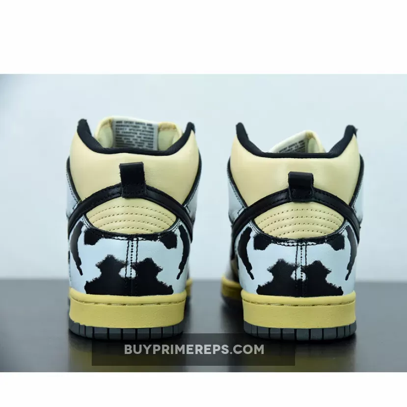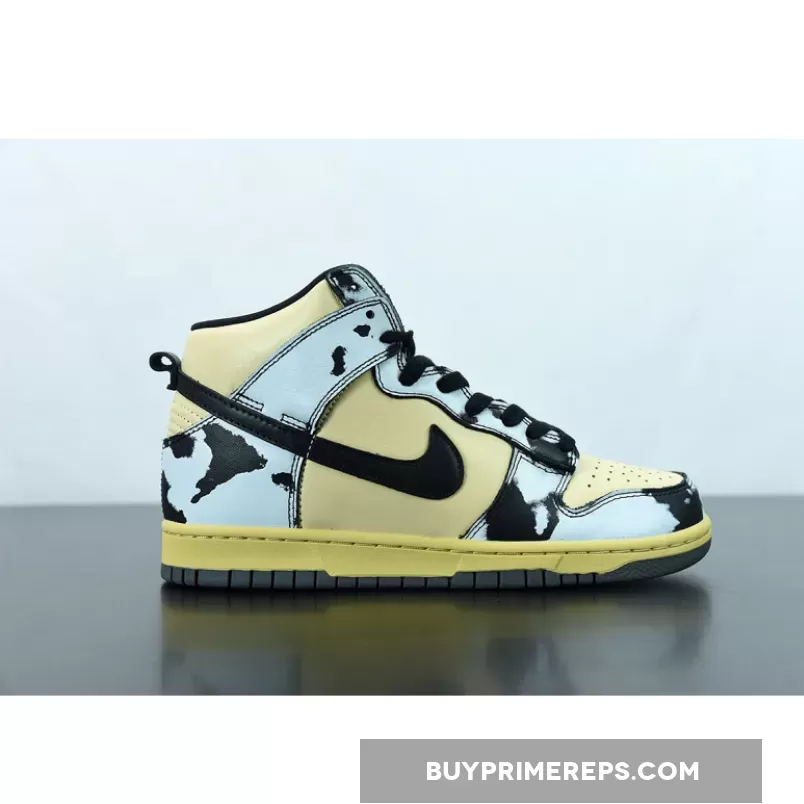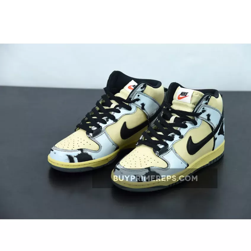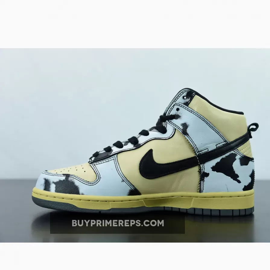 The Nike Dunk High 1985 Acid Wash Grey features a Lemon Drop leather upper that has been treated with an acid wash print. This technique creates a black and white splotchy effect, reminiscent of the popular acid wash bleach techniques used on fabrics during the 80s. The result is a truly eye-catching design that sets this Dunk High apart from the rest.