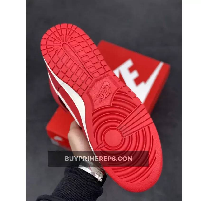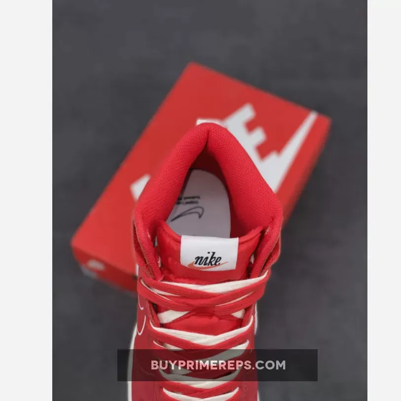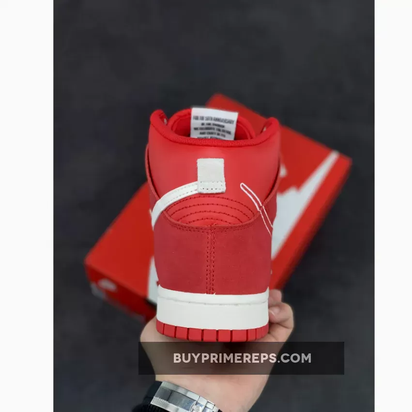 The upper of the Nike Dunk High First Use University Red is crafted from premium leather in a vibrant University Red colorway. The use of leather gives the shoe a luxurious and high-quality feel, while also providing durability and support. Suede overlays add a textural contrast and enhance the overall aesthetic of the shoe.