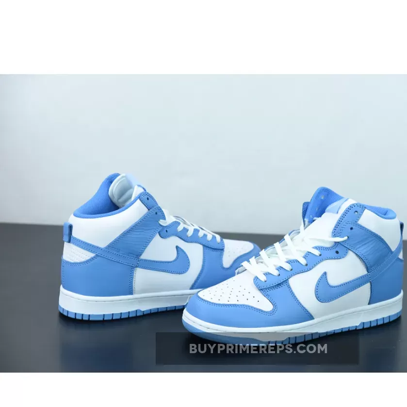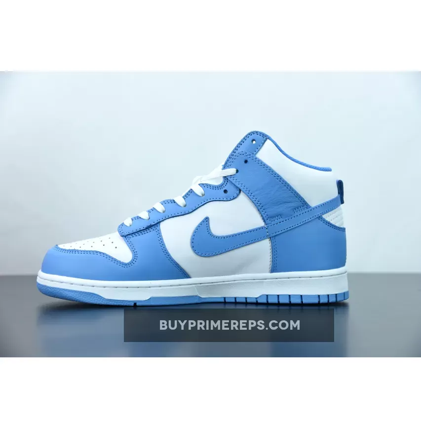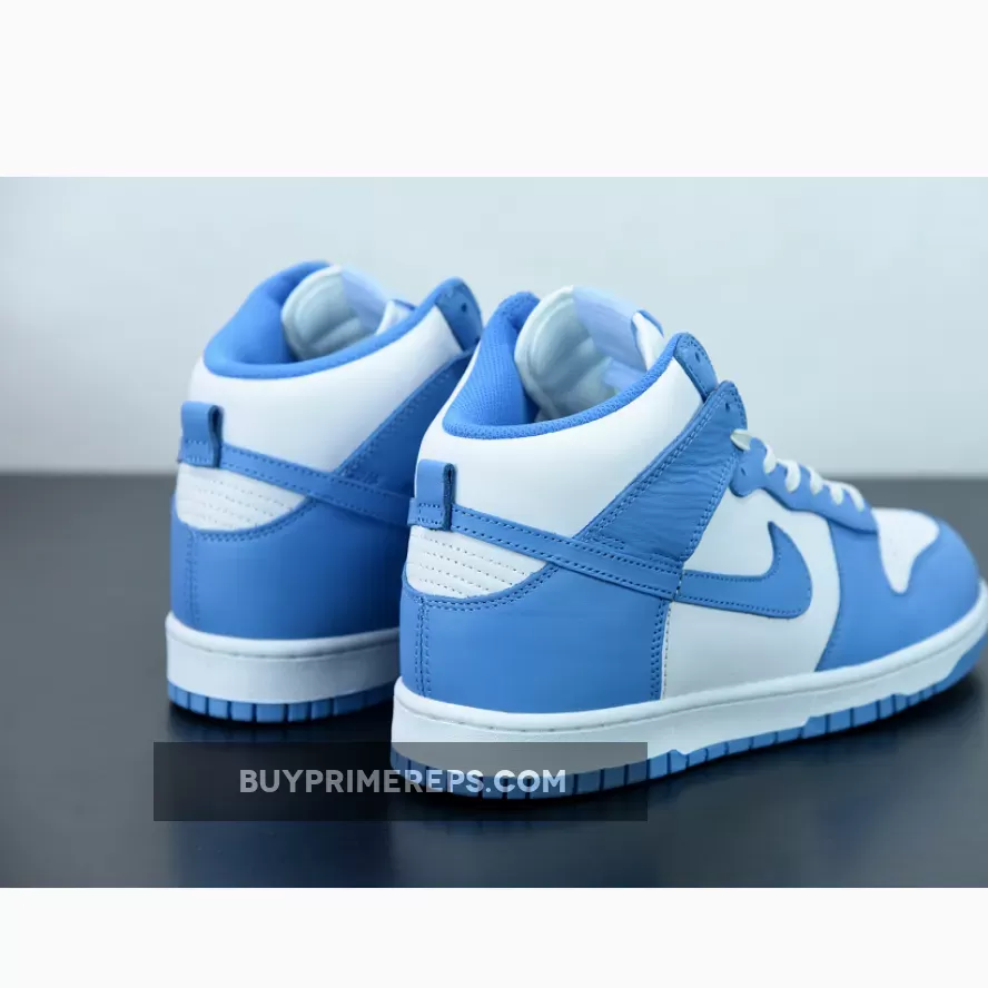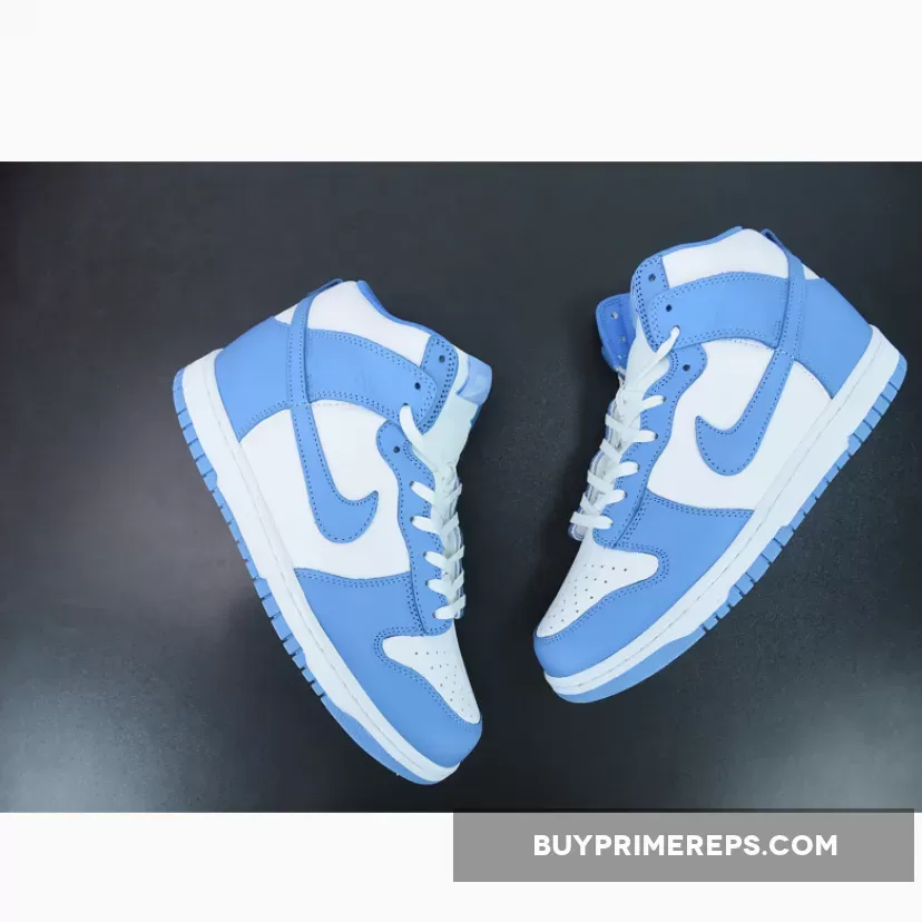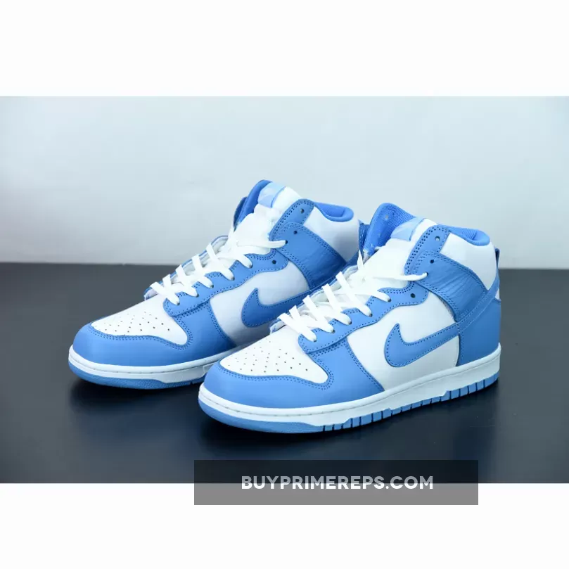 The shoe features a high-top profile, providing ankle support and a classic basketball silhouette. The upper is constructed with premium smooth leather, adding a touch of luxury to the overall aesthetic. The underlays and overlays are adorned in a clean white color, while the toe boxes, quarter panels, and collars feature a vibrant baby blue hue reminiscent of the University of North Carolina’s signature color.