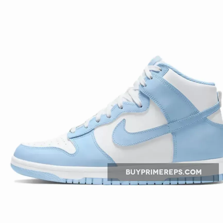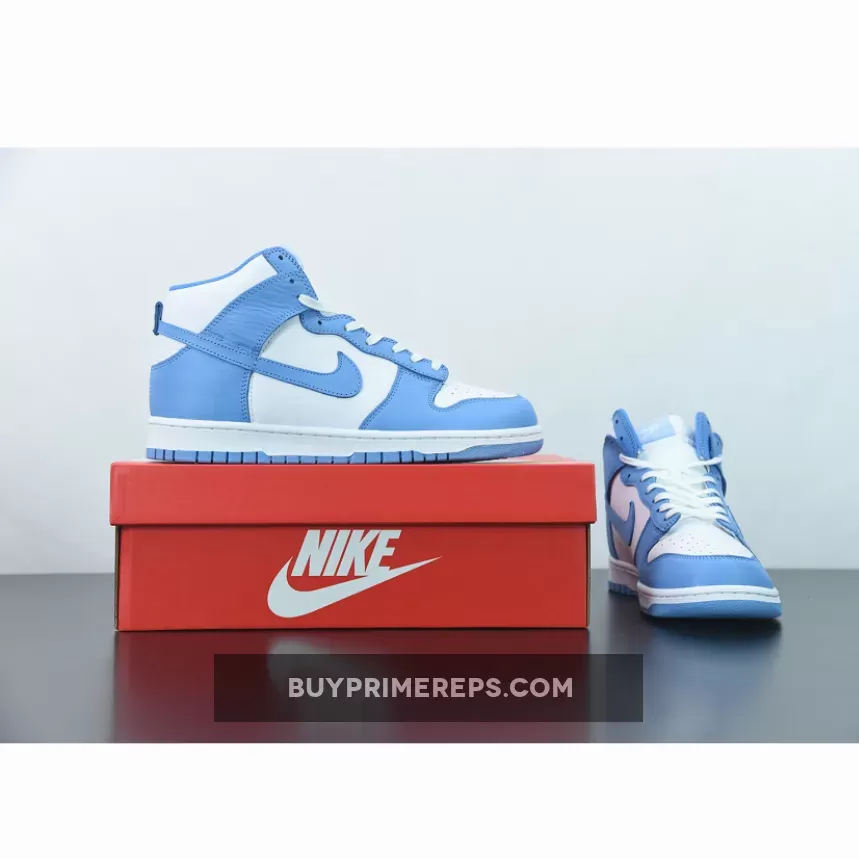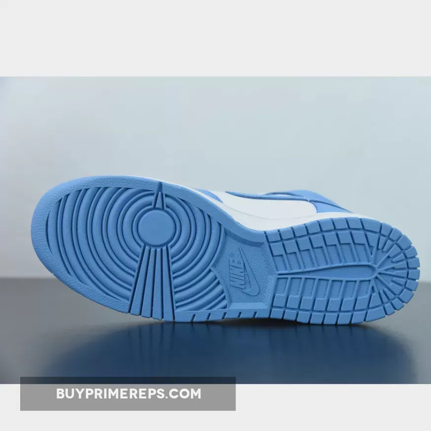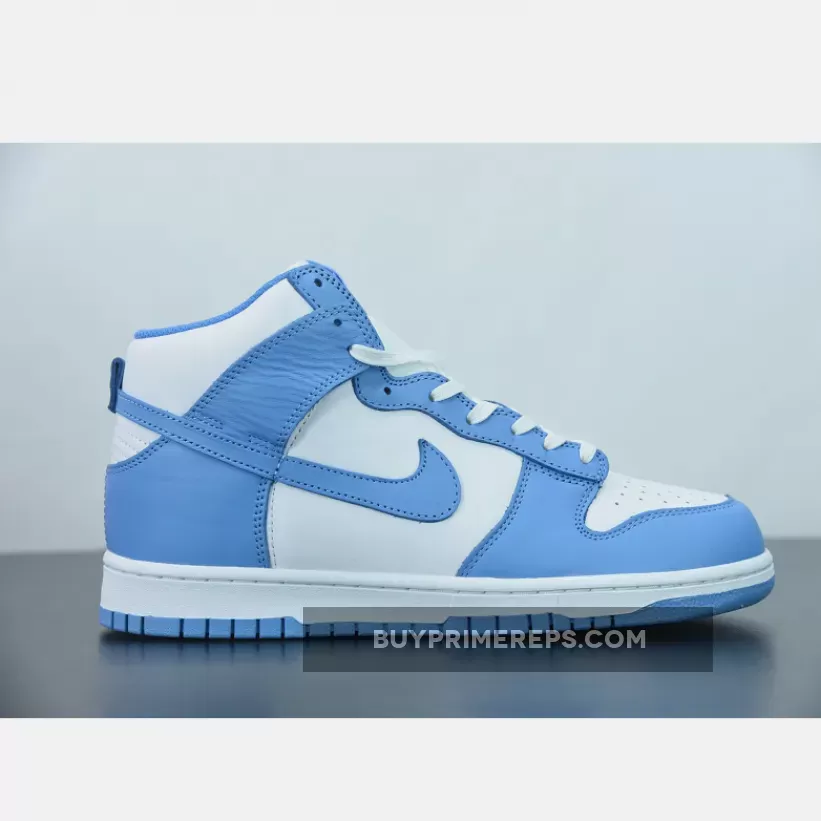 The shoe features a high-top profile, providing ankle support and a classic basketball silhouette. The upper is constructed with premium smooth leather, adding a touch of luxury to the overall aesthetic. The underlays and overlays are adorned in a clean white color, while the toe boxes, quarter panels, and collars feature a vibrant baby blue hue reminiscent of the University of North Carolina’s signature color.