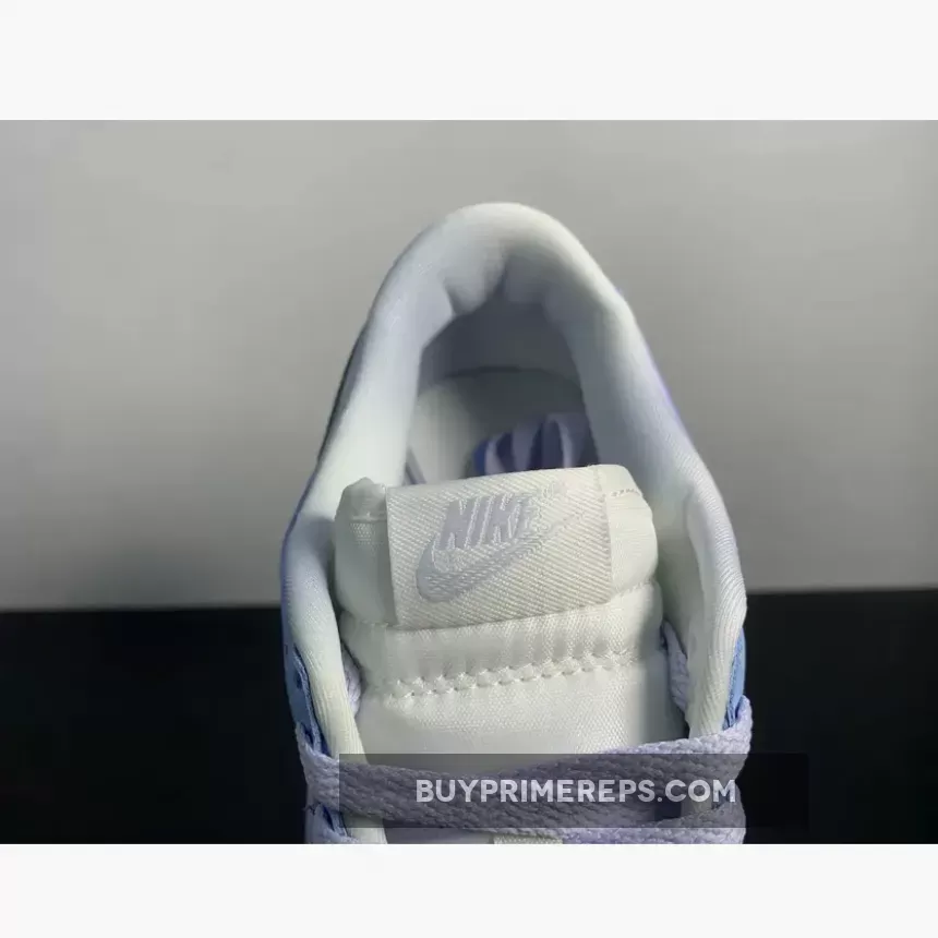 Subtle branding can be found on the tongue tabs, with pale blue on white accents. The heel tabs feature embroidered royal blue Nike text branding, adding a touch of contrast. The shoe is finished off with a speckled white midsole and a speckled powder blue rubber outsole, adding a unique touch to the overall aesthetic.