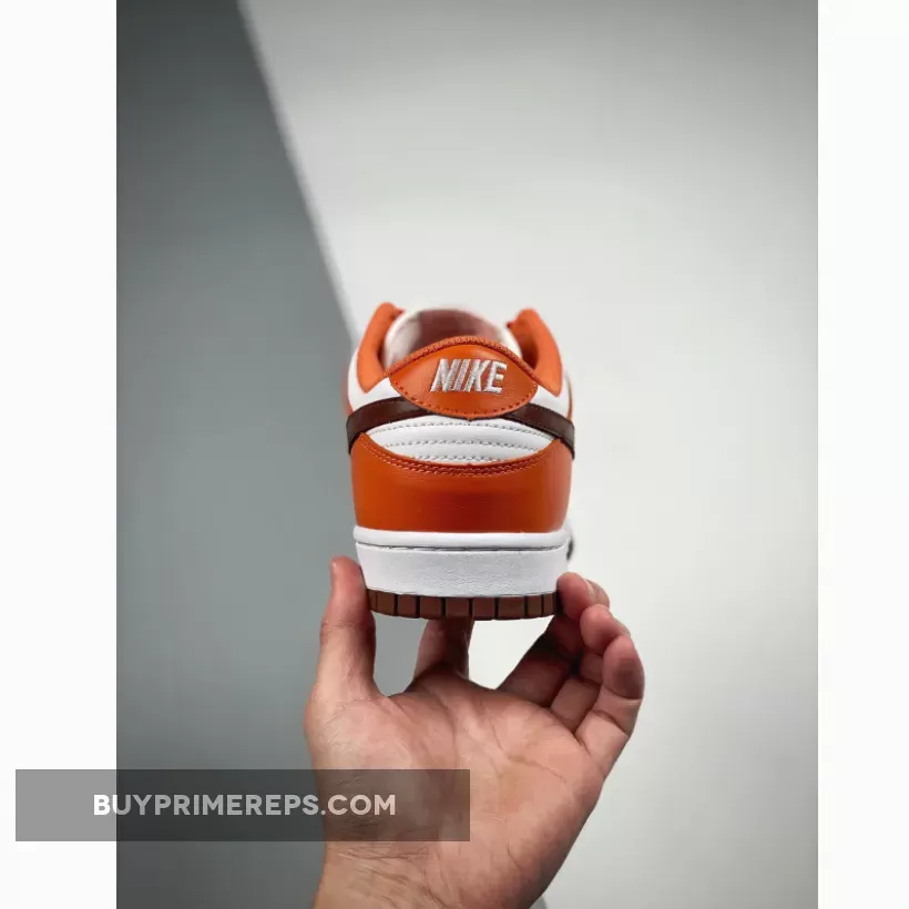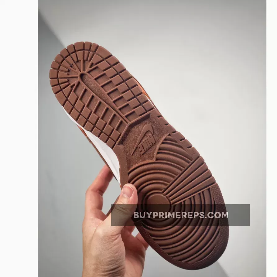 The attention to detail doesn’t stop there. The Nike Dunk Low “Reverse Mesa Orange” also features brown Swooshes and a rubber outsole, which contrasts beautifully with the white panels and midsole. The “NIKE” embroidery on the rear and midsole adds a subtle branding touch.