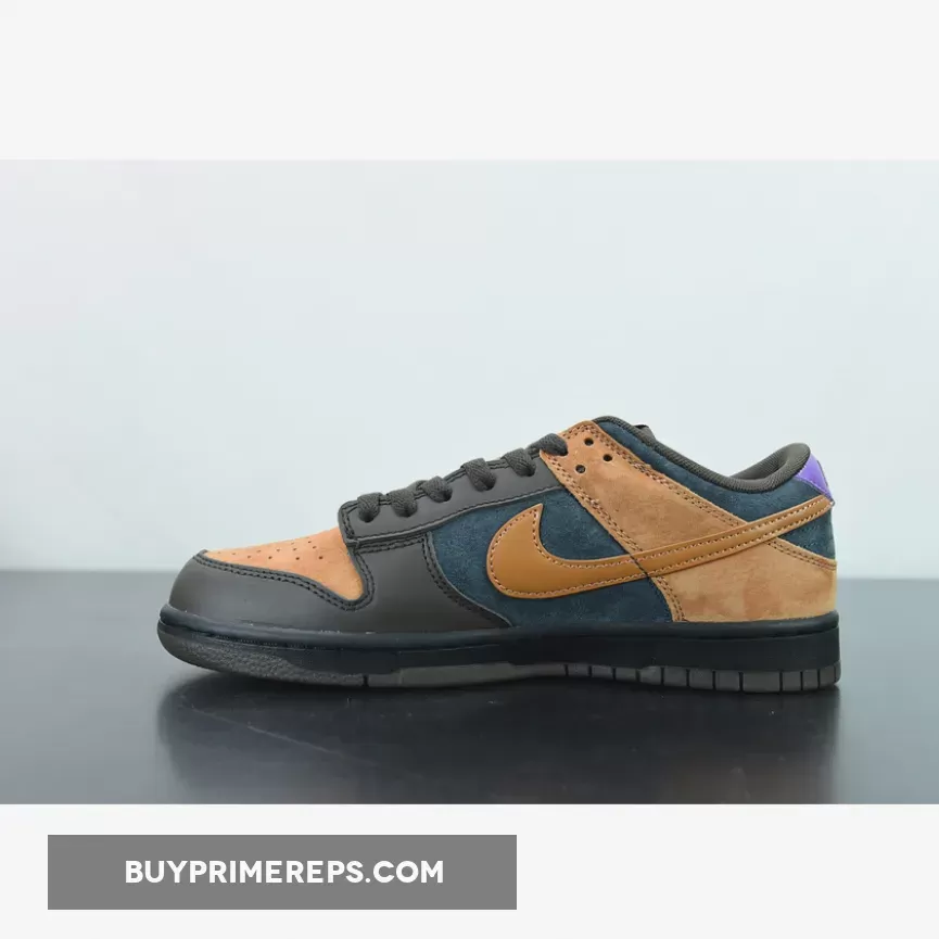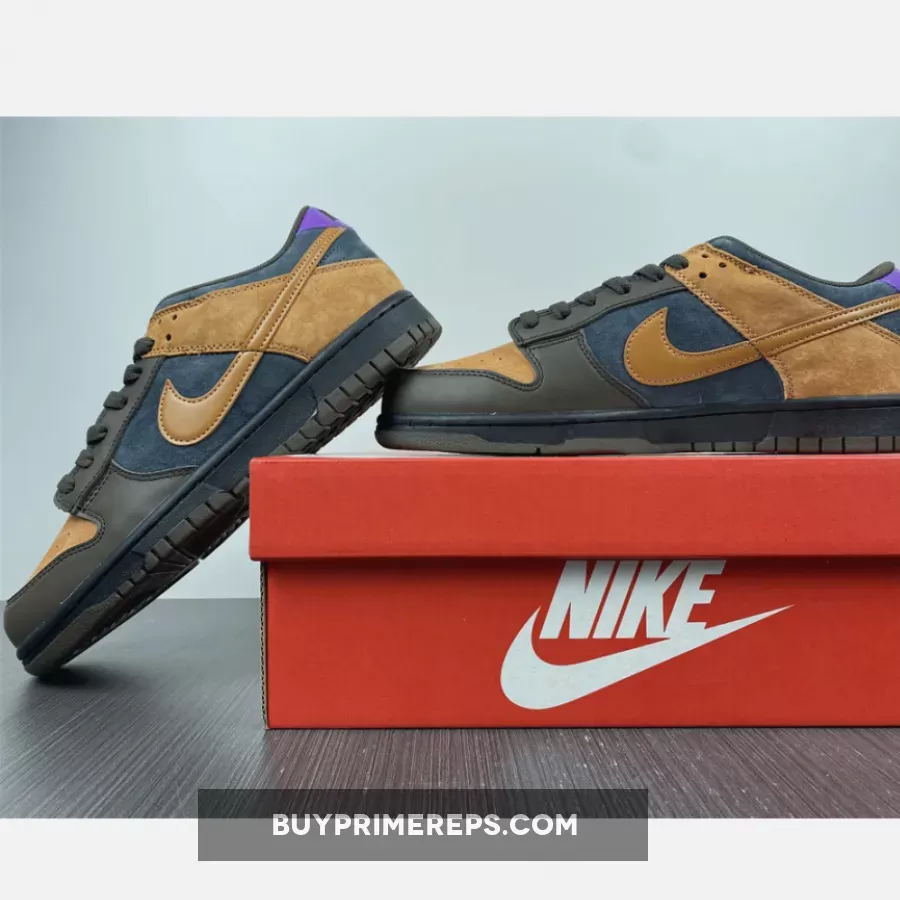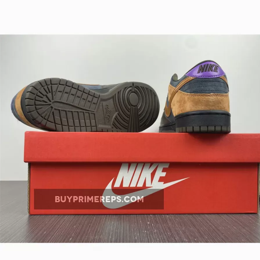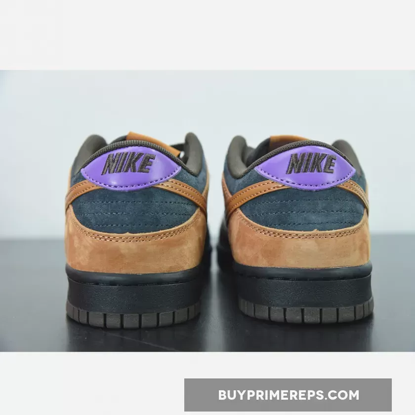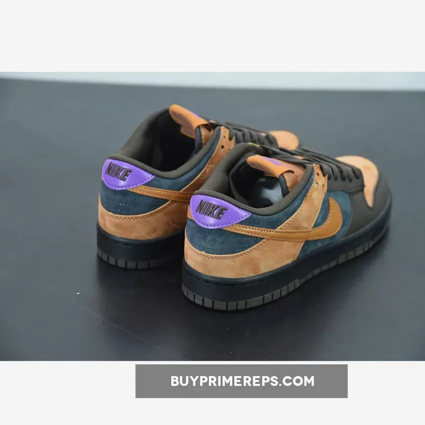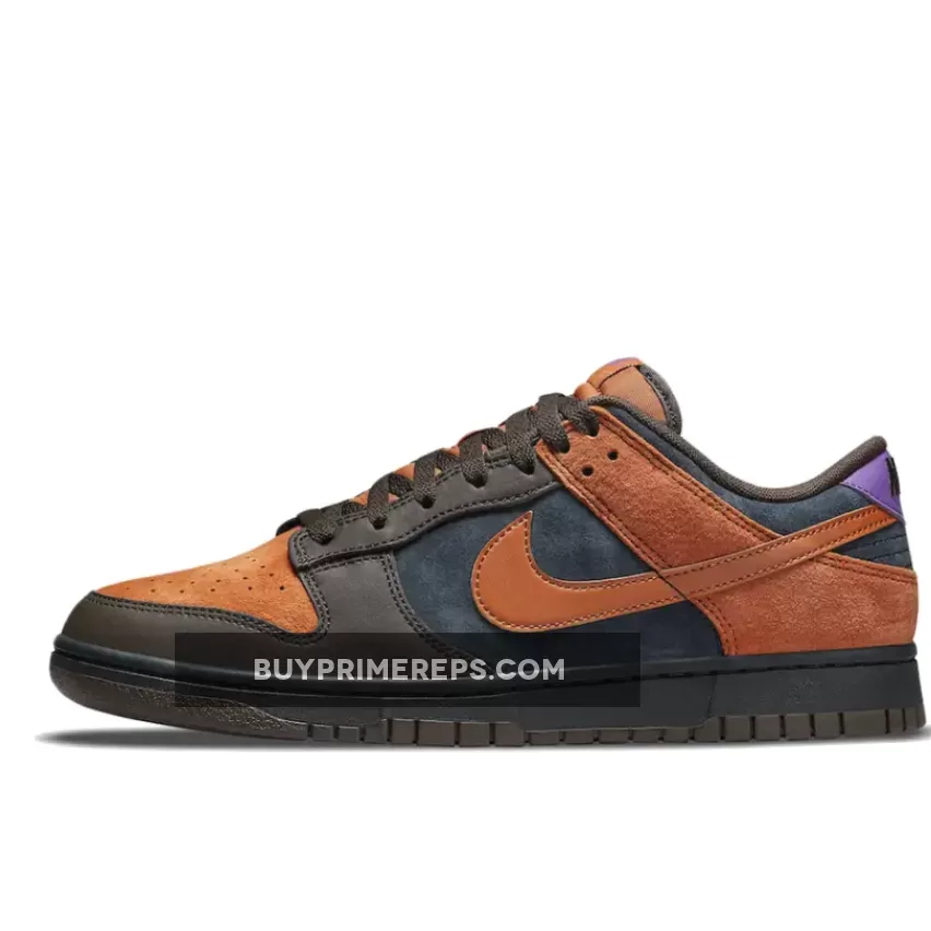 Introducing the Nike Dunk Low Cider – the perfect sneaker to embrace the cozy vibes of autumn. This fall-ready shoe is crafted with a combination of luxe materials, world-famous branding, exclusive cushioning, and a rich color palette. With its mix of smooth leather, brushed suede, and nubuck, the upper of the shoe showcases varying shades of brown, orange, and black. Adding a touch of contrast, a pop of purple is featured on the heel. The iconic Nike Swoosh sits proudly on the sidewalls, while the retro logo completes the look on the heel and tongue.