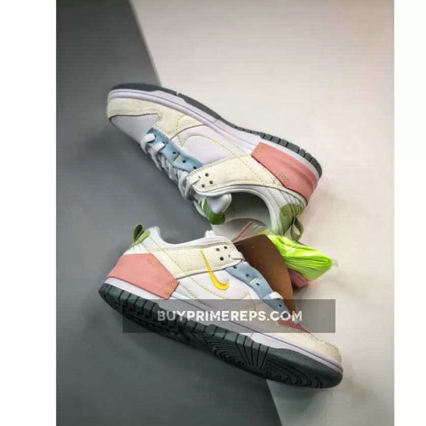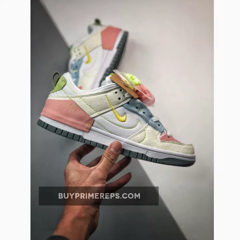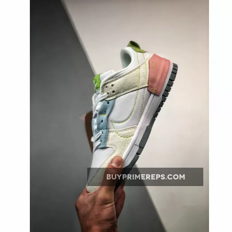 The design of the Nike Dunk Low Disrupt 2 Next Nature Multi is a harmonious blend of pastel hues and neutral shades. The white canvas uppers serve as the base, while beige overlays at the toe and heel add depth and texture. A muted slate blue eyestay panel adds a touch of sophistication.