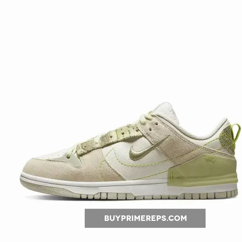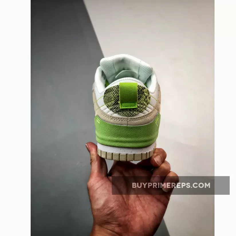 The upper of the Nike Dunk Low Disrupt 2 Green Snake is constructed with a combination of leather and suede materials. The base of the upper is made from a premium Sail leather, giving the shoe a clean and sleek look. The tan suede overlays add texture and depth to the design, contrasting nicely with the smooth leather.