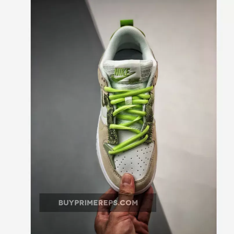 In addition to the snakeskin print, the Nike Dunk Low Disrupt 2 Green Snake also features green accents throughout the design. The laces, heel overlay, tongue branding, and heels are all adorned with green detailing, complementing the snakeskin print and adding a pop of color to the shoe.