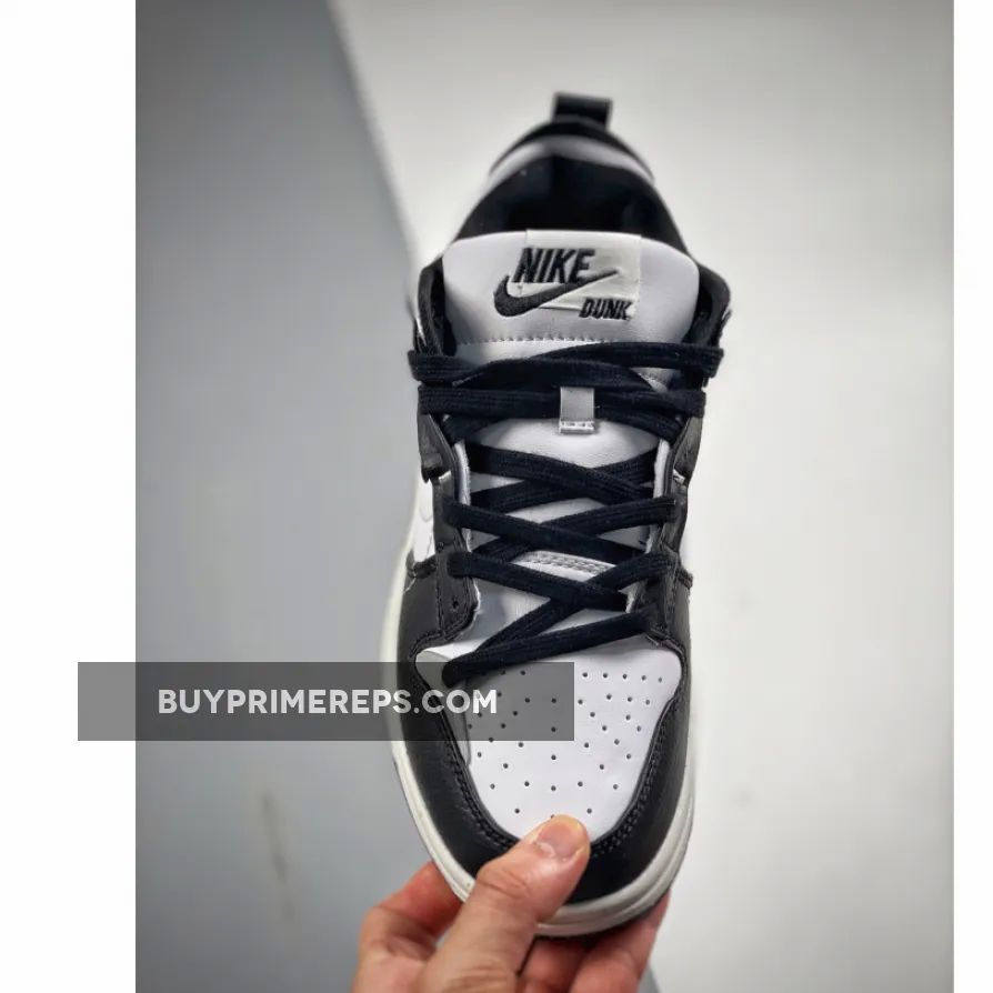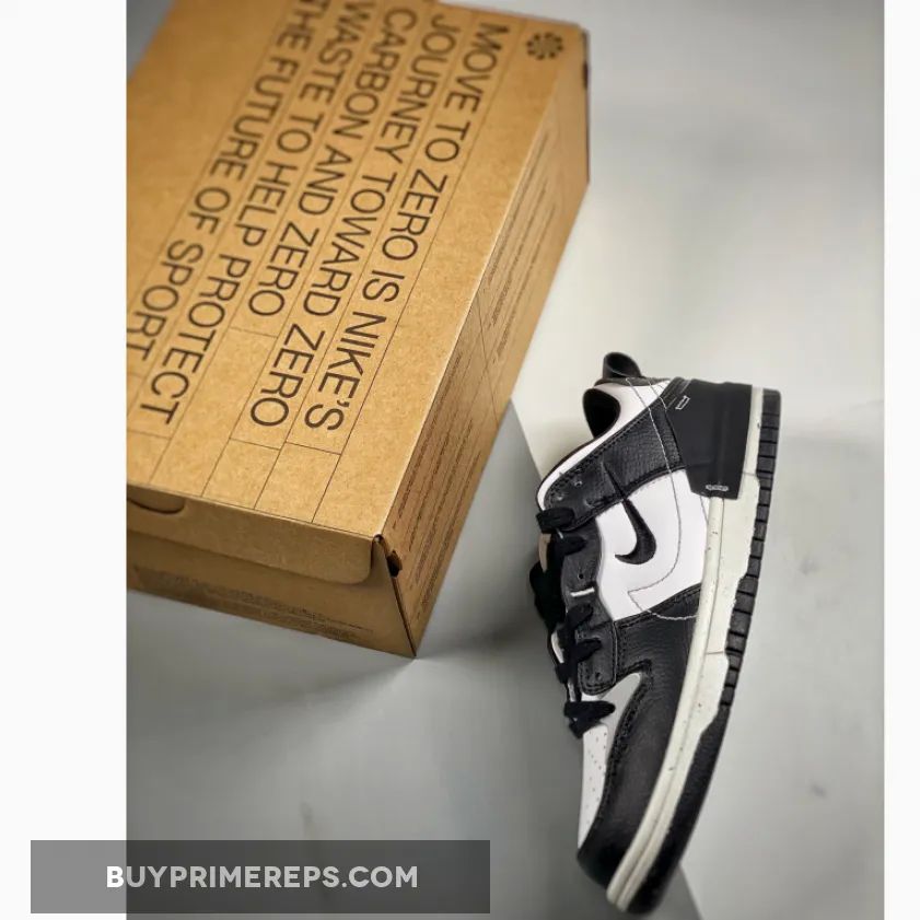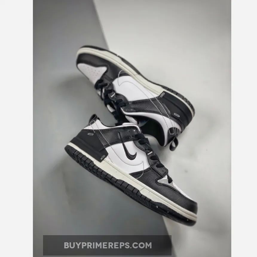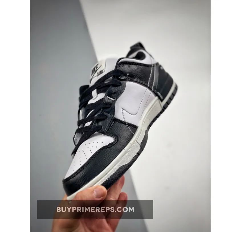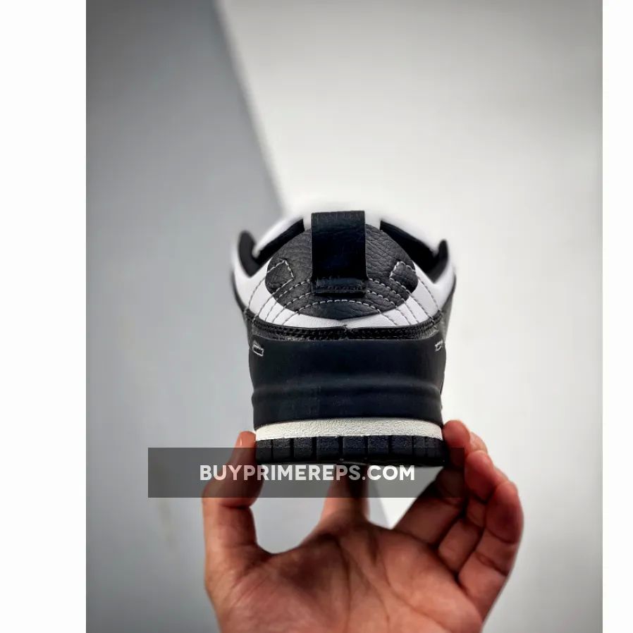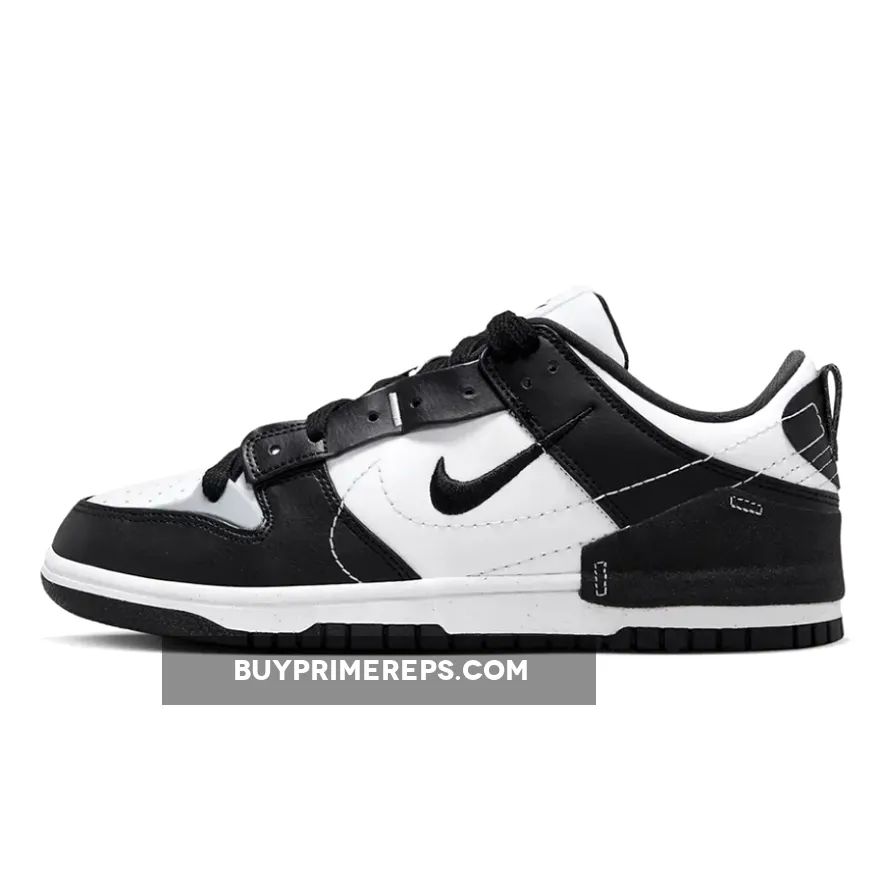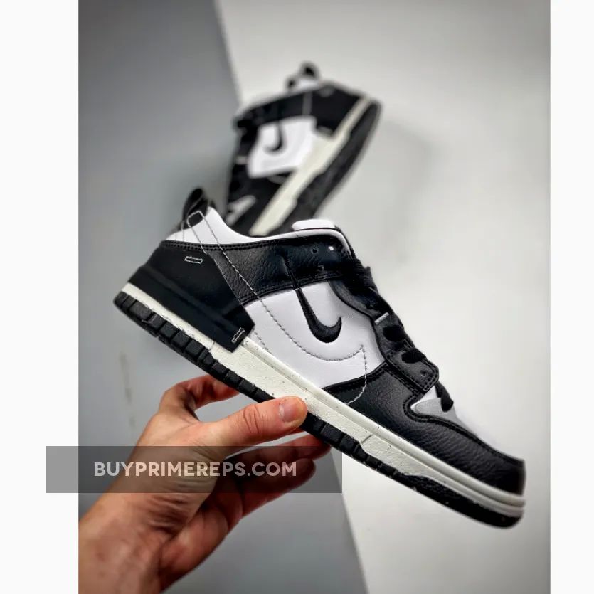 The upper of the Nike Dunk Low Disrupt 2 Panda is predominantly white, with DIY-effect panelling in black. This contrasting color scheme creates a visually striking and modern look, reminiscent of the iconic black and white coloring of pandas. The black outsole seamlessly blends into a crisp-white midsole, adding to the overall clean and sleek appearance of the shoe.