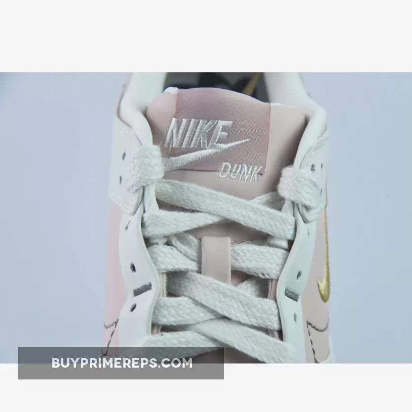 The base of the sneaker comes in a beautiful rosy-pink hue, which is complemented perfectly by the embroidered gold Nike Swooshes on the side. The combination of pink and gold gives the sneaker a feminine and luxurious touch. The attention to detail is evident in the design, with every element carefully chosen to create a cohesive and eye-catching look.