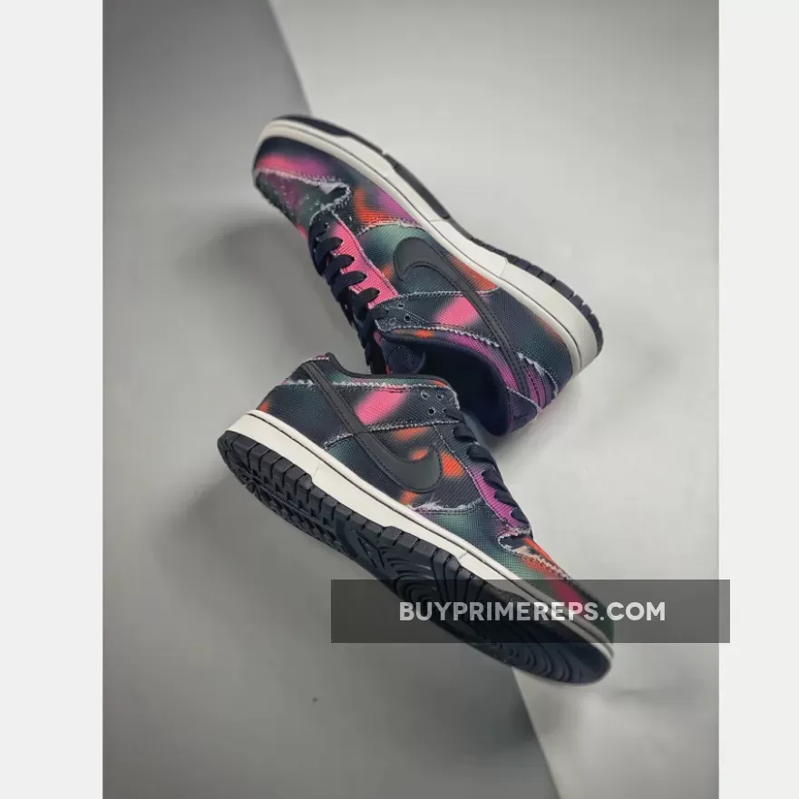 The upper of the Dunk Low Graffiti features a heavy-duty canvas construction that is splashed with asymmetrical pink, violet, grey, and black spray paint-like blotches. This graffiti-inspired pattern adds a unique and artistic touch to the shoe, giving it a one-of-a-kind look. The frayed edges further enhance the rebellious energy of the design, adding an extra level of edginess.