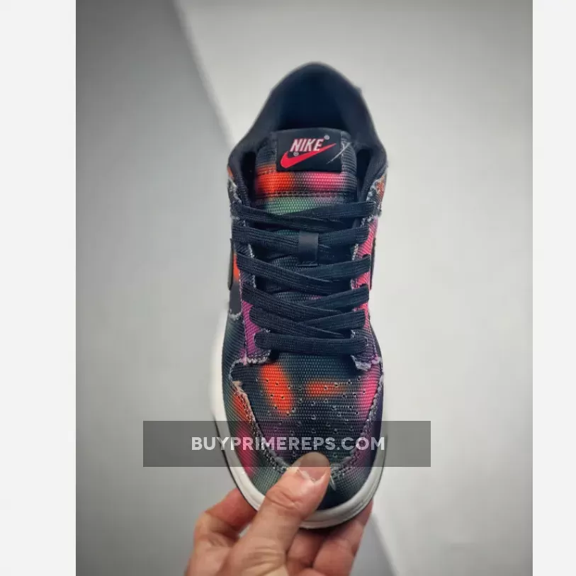 Contrasting the vibrant and chaotic upper are the sleek black leather Swooshes, which add a touch of sophistication to the shoe. The classic colorless Dunk Low midsole provides full-length cushioning for ultimate comfort, making these sneakers not only stylish but also practical for everyday wear. The lightweight black outsole completes the look, ensuring traction and stability with every step.