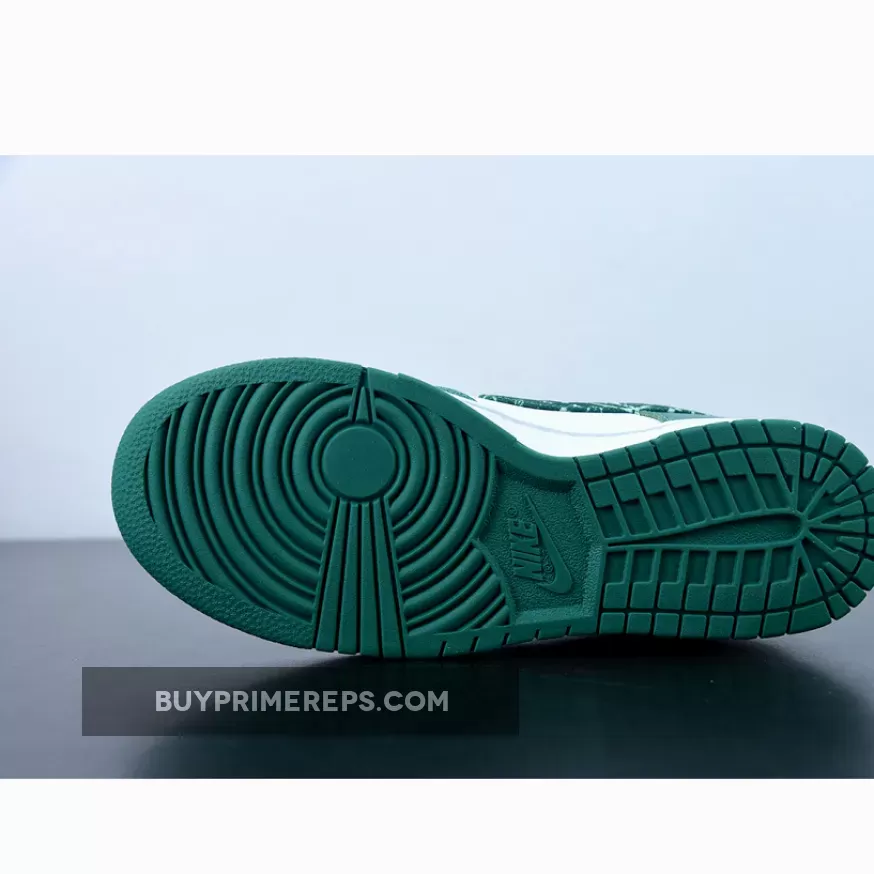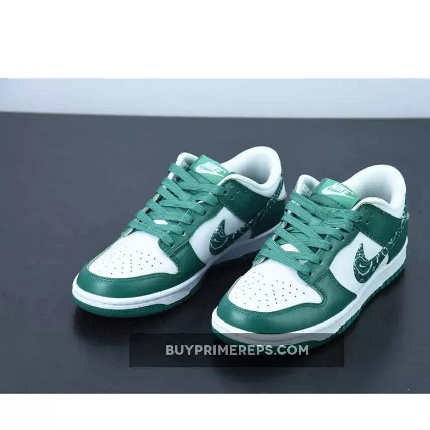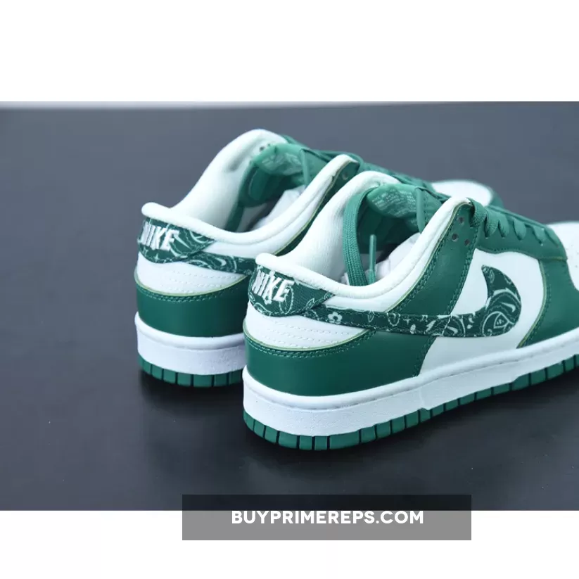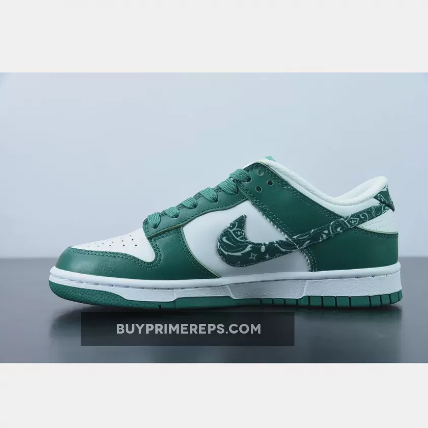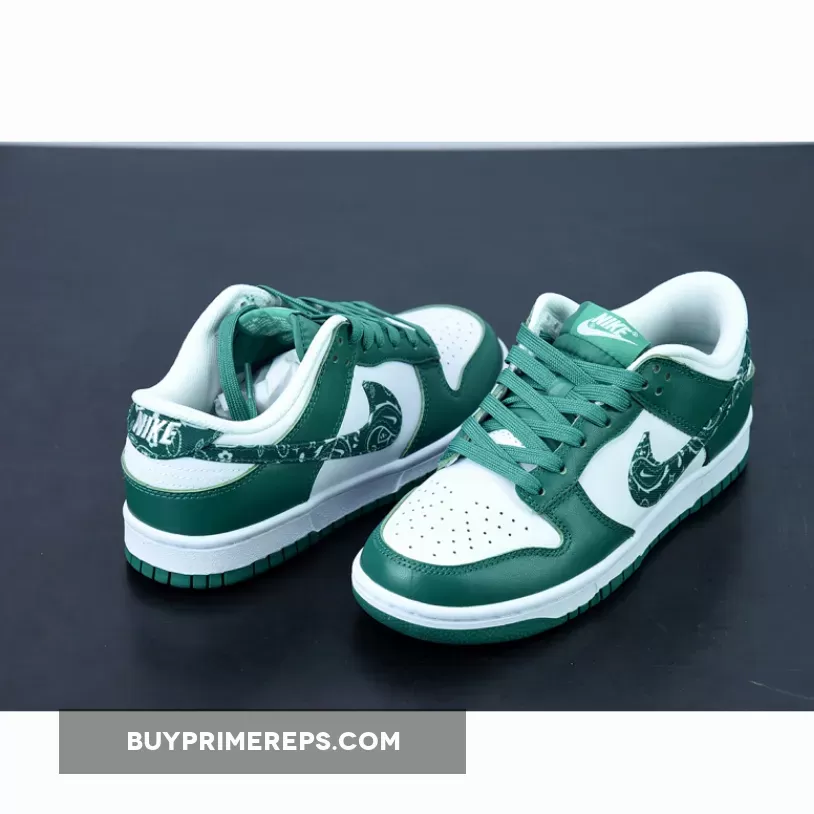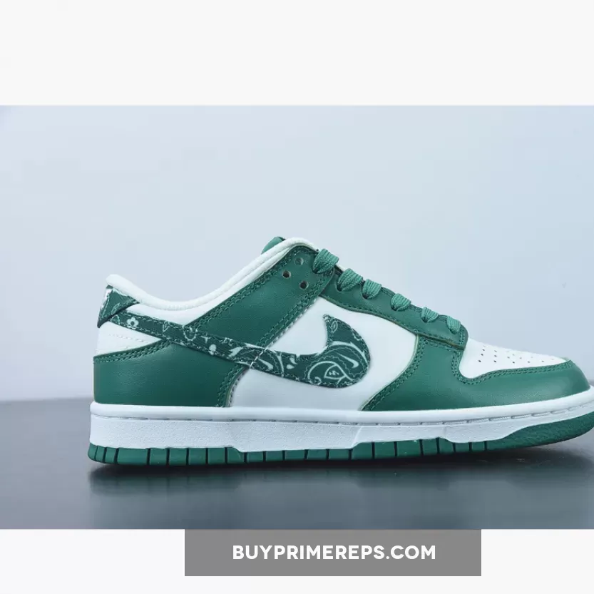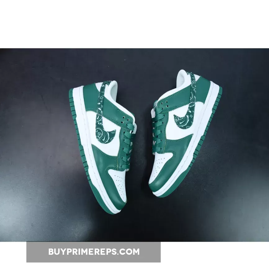 Introducing the Nike Dunk Low Green Paisley, the latest addition to Nike’s “Paisley Pack.” This sneaker showcases a clean and stylish design that is sure to turn heads. The upper is constructed with smooth and perforated leather in a crisp white color, providing a sleek and timeless look. The toe cap, mudguard, eyestay panel, and foxing are adorned with overlays in a rich dark forest green hue, perfectly complementing the white base.