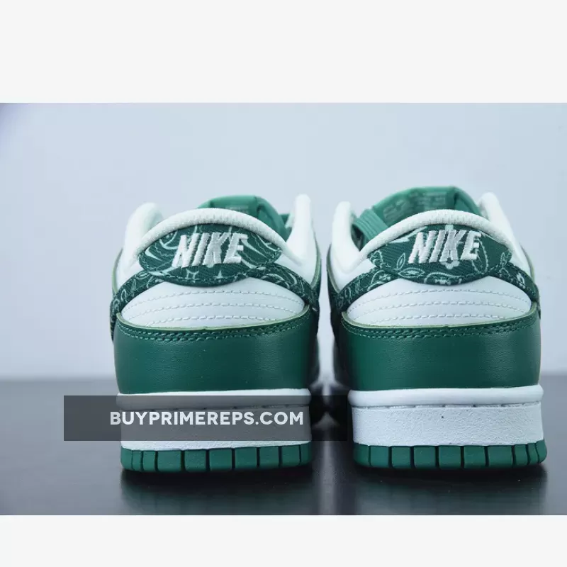 The tongue of the Nike Dunk Low Green Paisley is made of nylon and features the same dark green color as the overlays, creating a cohesive and unified aesthetic. White Nike branding on the tongue tab adds a subtle touch of branding.