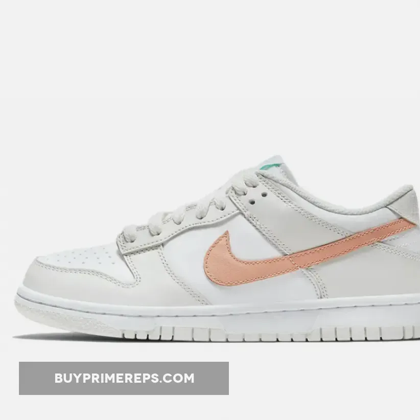 The upper of the Nike Dunk Low GS Mismatch Swoosh Peach Aqua is constructed with a crisp white leather base, giving it a clean and versatile look. Smoke grey overlays adorn the panels across the shoe, adding a touch of contrast and visual interest. The branding details that have made the Nike Dunk iconic are present on the heel tab, tongue, and insoles, ensuring that everyone will know you’re rocking a classic.