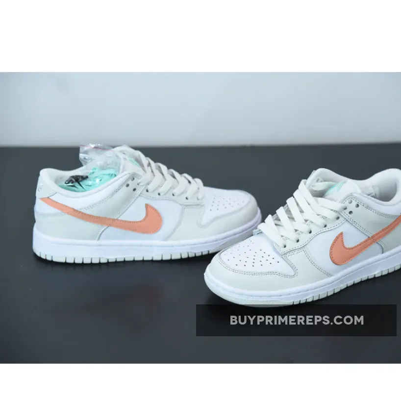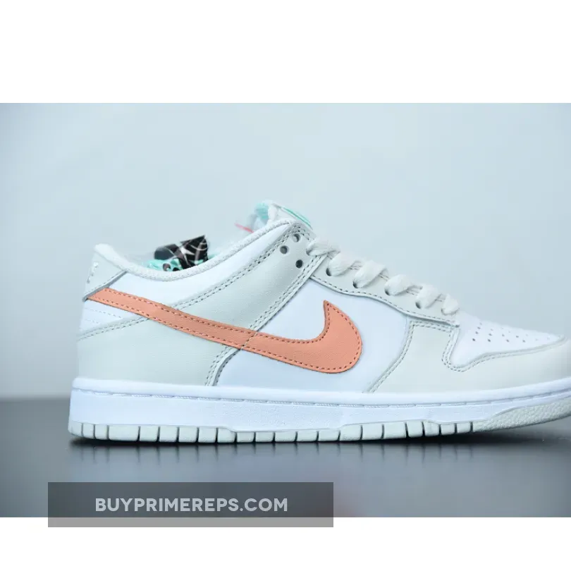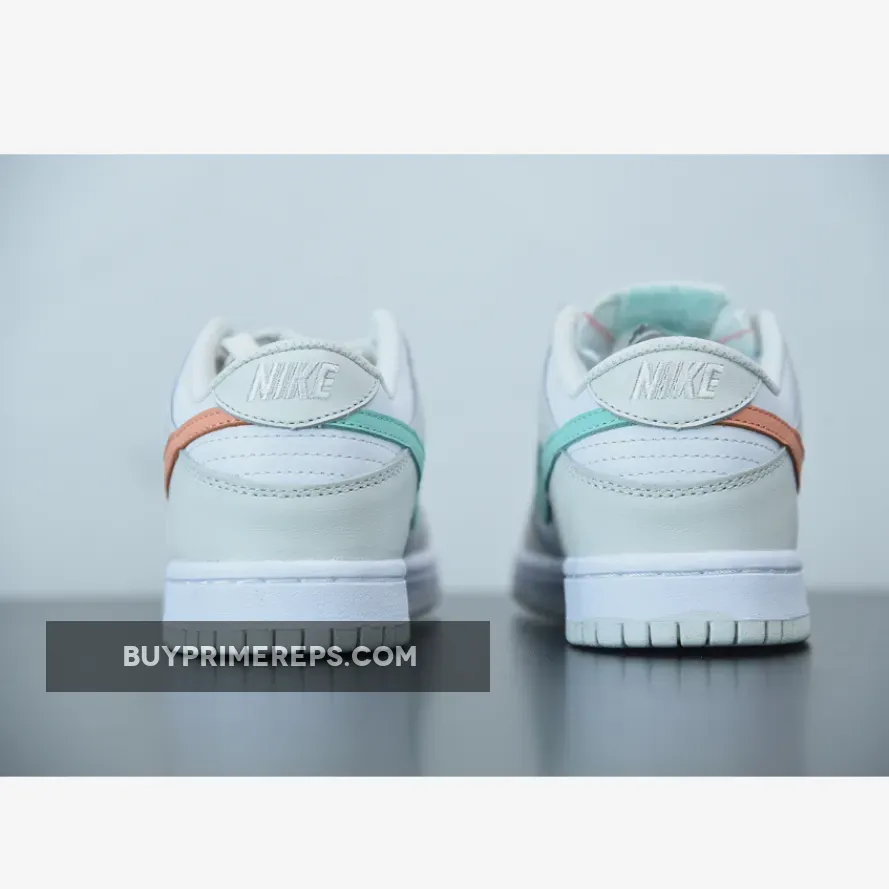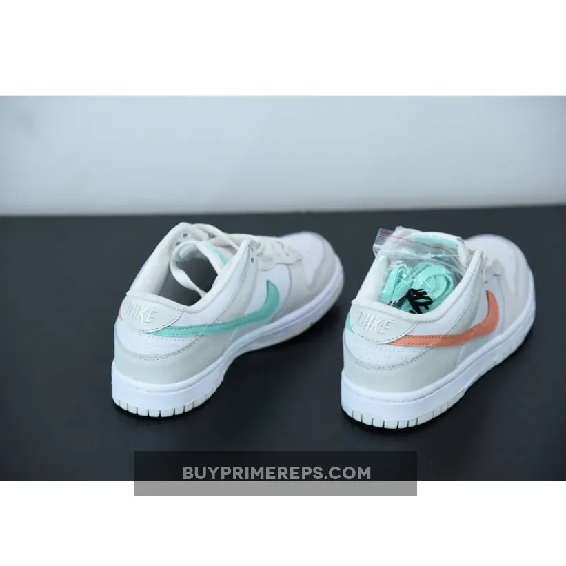 One of the standout features of this colorway is the mismatched Swoosh insignia. On the lateral side, the Swoosh appears in a muted orange tone, while the medial side is painted in a vibrant aqua blue hue. This mismatched look adds a unique and playful touch to the design, making it stand out from other Dunk Low colorways.