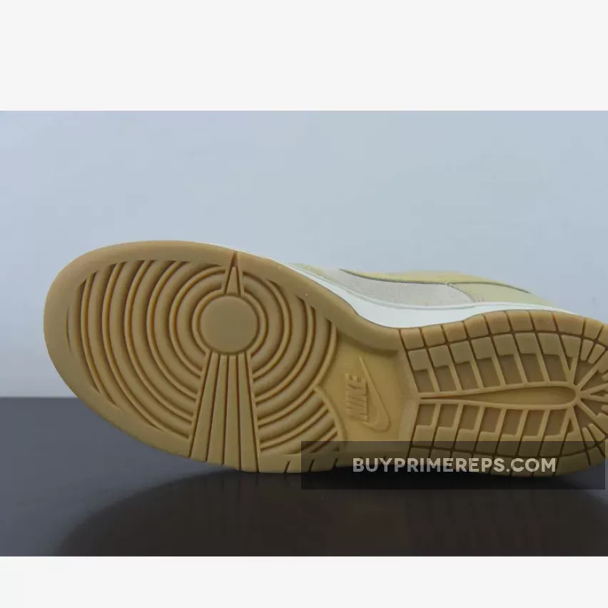 Underneath, the Nike Dunk Low Tan Suede Gum features a white midsole and a gum rubber outsole. The white midsole provides a crisp and clean look, while the gum outsole adds a classic touch. The combination of these two elements creates a balanced and stylish look that complements the rest of the shoe.