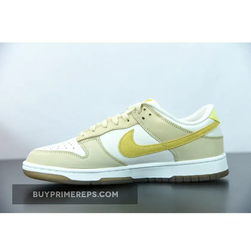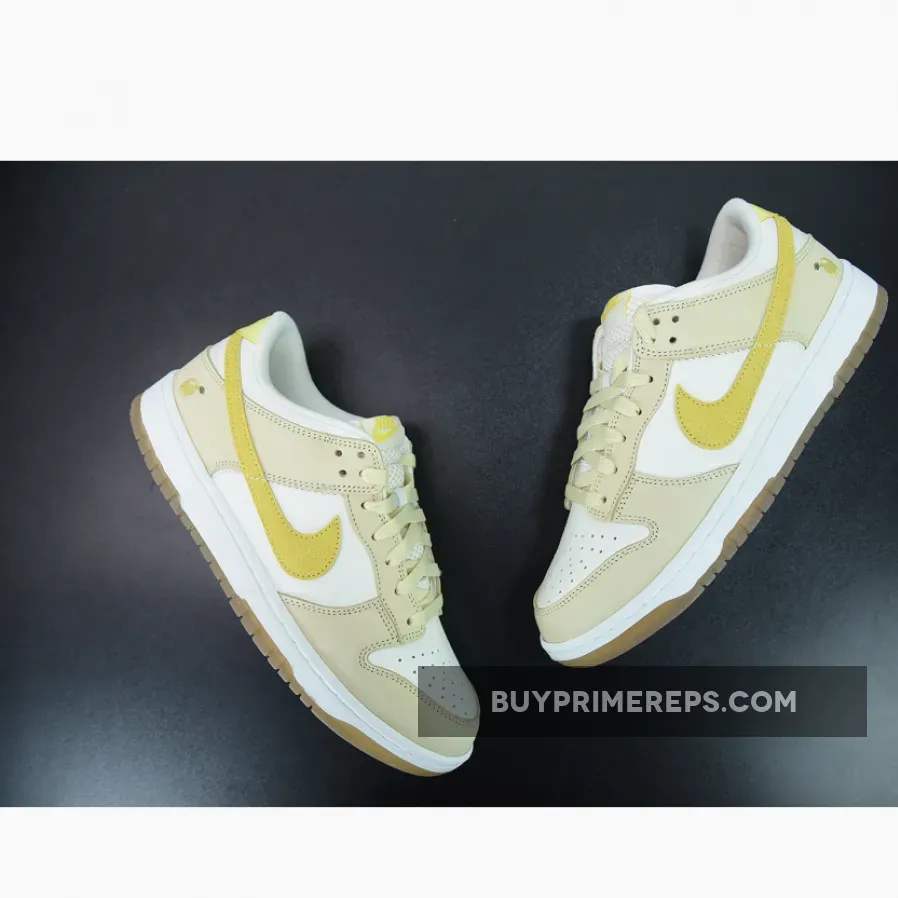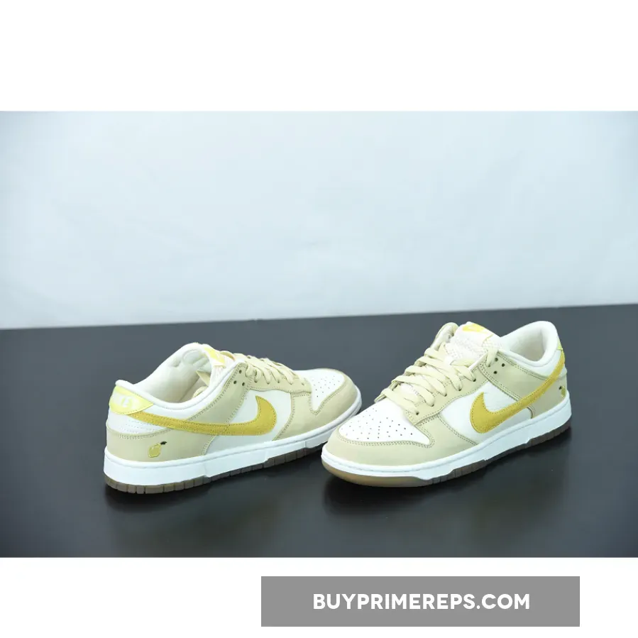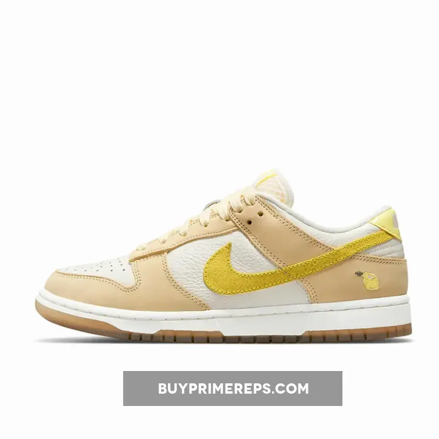 The Nike Dunk Low “Lemon Drop” is here to add a fresh and vibrant touch to your sneaker collection. This women’s exclusive colorway takes inspiration from the summertime favorite fruit, the lemon, and incorporates its sunny hues into the design. The shoe features a clean and crisp white tumbled leather upper, providing a sleek and classic look. The toe caps, eyestays, and other panels are adorned in a beautiful beige shade, adding depth and dimension to the overall design.