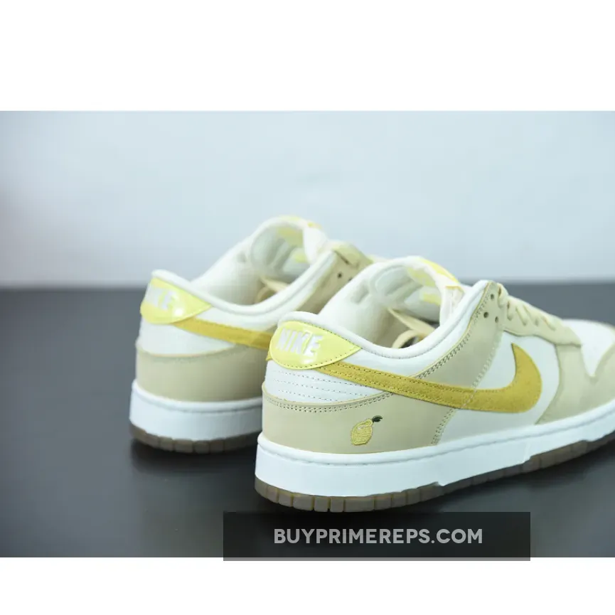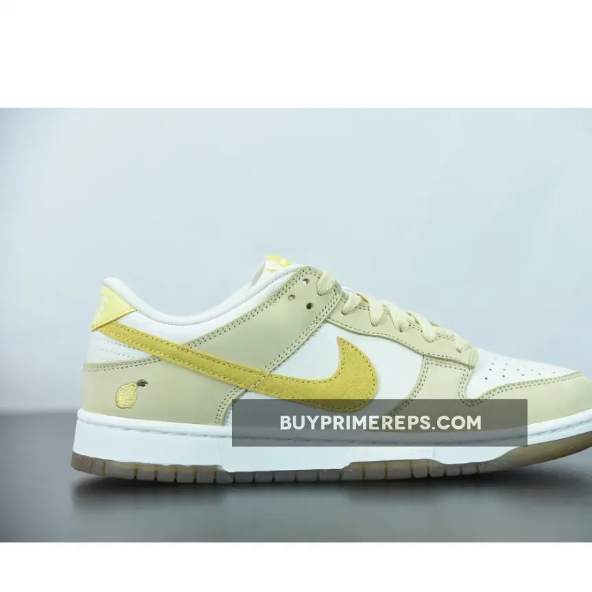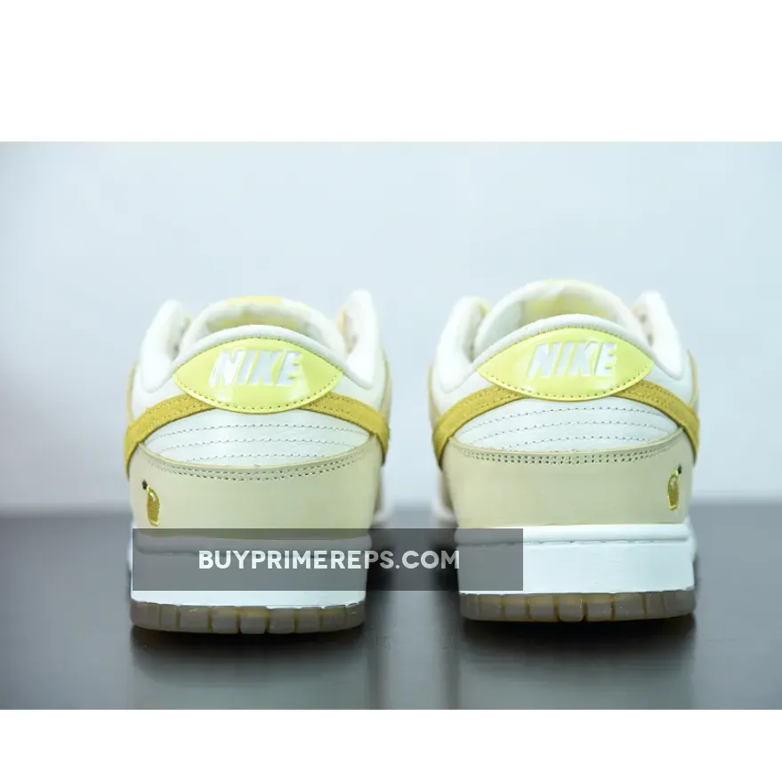 One of the standout features of this Dunk Low is the lemon skin-textured Swooshes on the sides. These textured overlays not only add visual interest but also create a unique and playful element to the shoe. The lemon theme is further emphasized by an embroidered lemon graphic at the lateral heel, adding a fun and whimsical touch to the design.