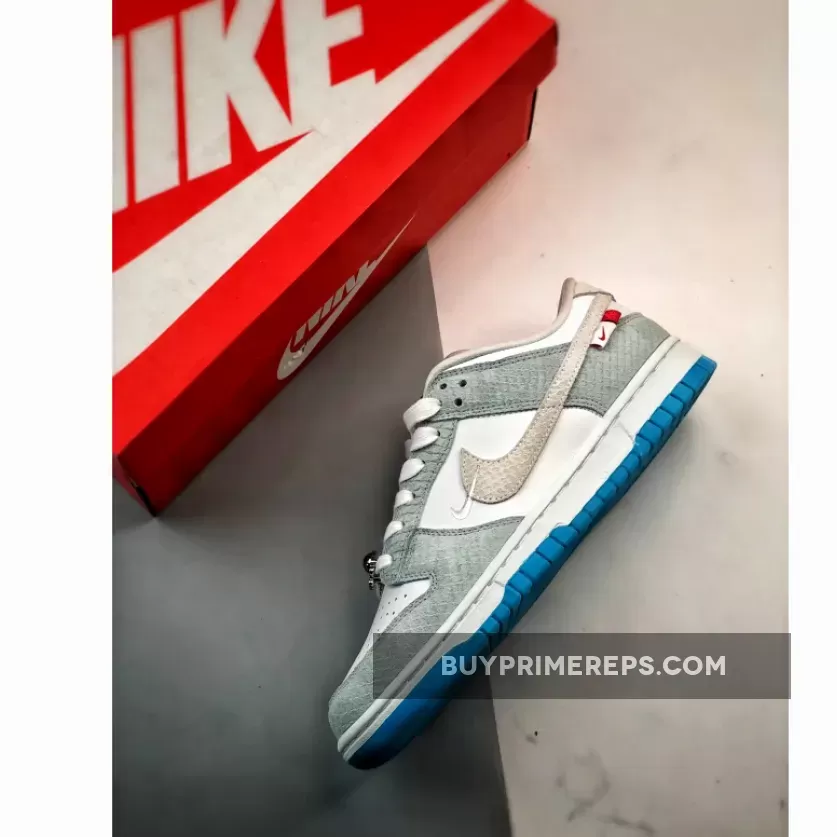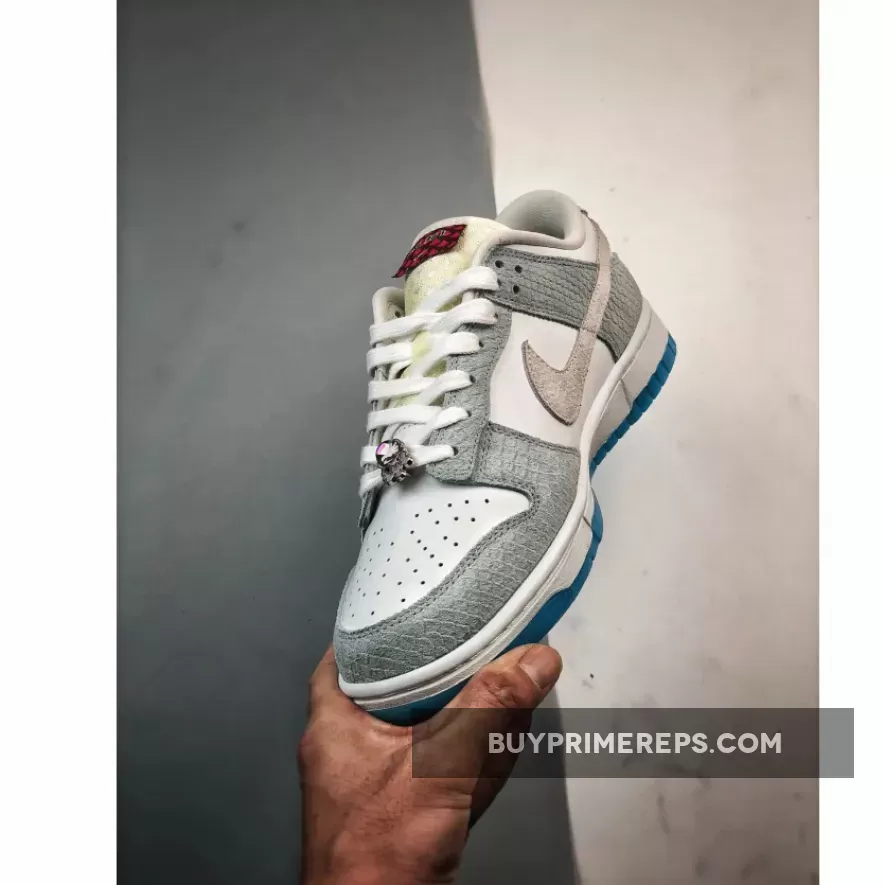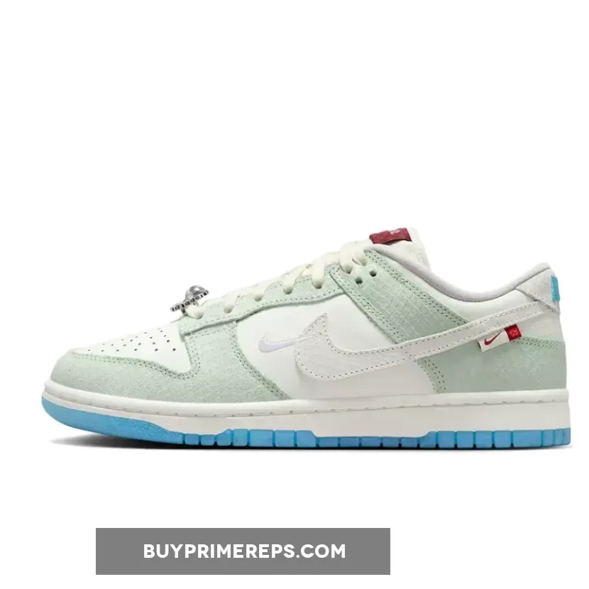 Additional details that add to the charm of the Nike Dunk Low “Year of the Dragon” include a colorful charm that dangles from the lace dubrae and a mini Swoosh on the midfoot. The sneaker sits atop a clean white midsole and an icy blue rubber outsole, completing the overall look.