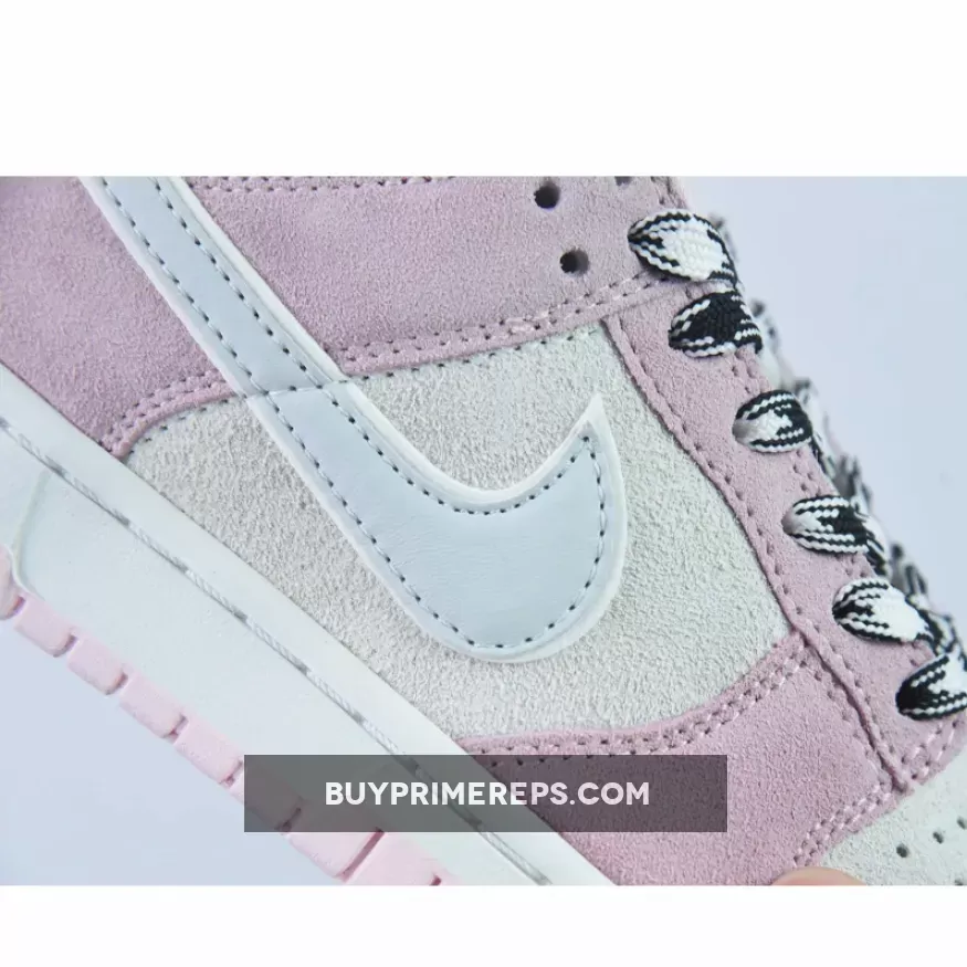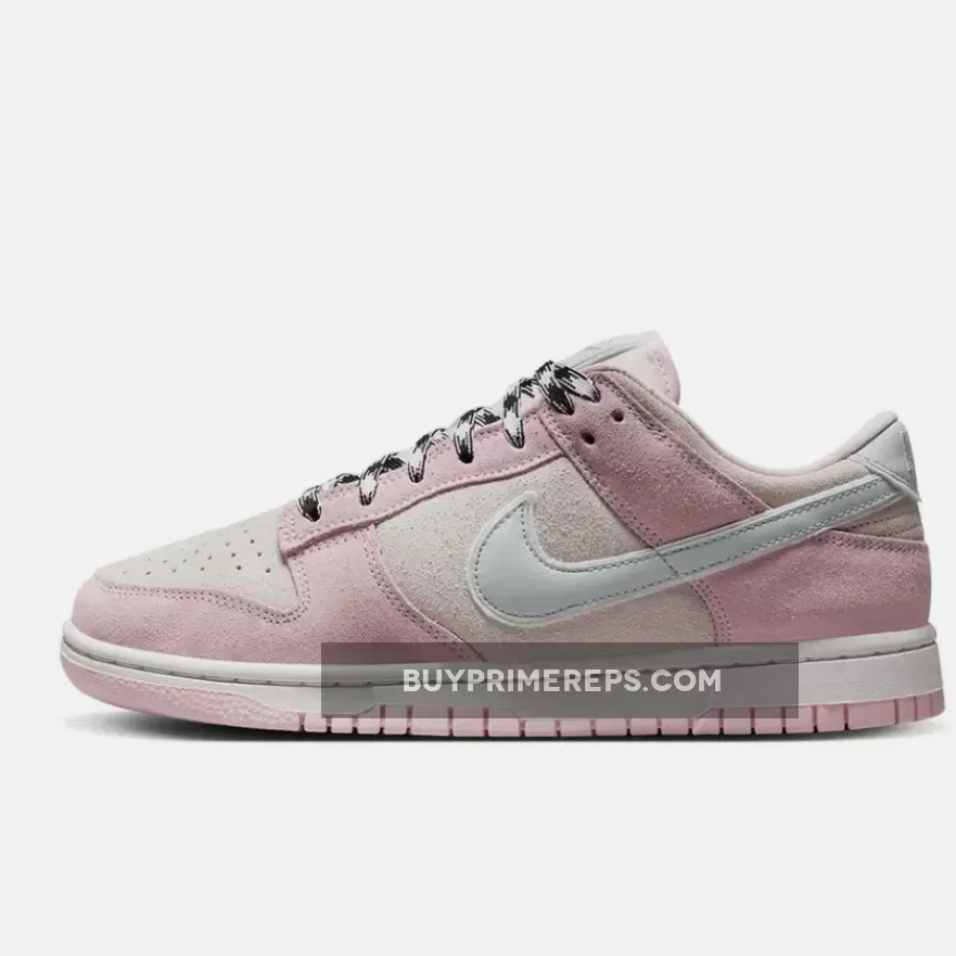 The Nike Dunk Low Pink Grey Suede takes a departure from the traditional white leather base and opts for a soft, shaggy grey suede material instead. This plush suede covers the upper of the shoe, providing a luxurious and premium feel.