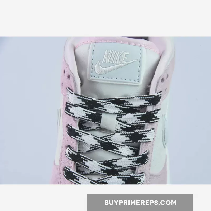 Adding to the visual appeal of the Nike Dunk Low Pink Grey Suede are the smooth leather profile Swooshes on both sides of the shoe. These Swooshes are in a matching pastel color, powder blue, creating a harmonious and cohesive look.