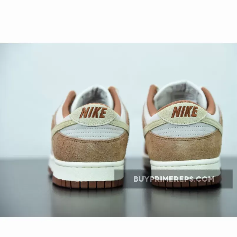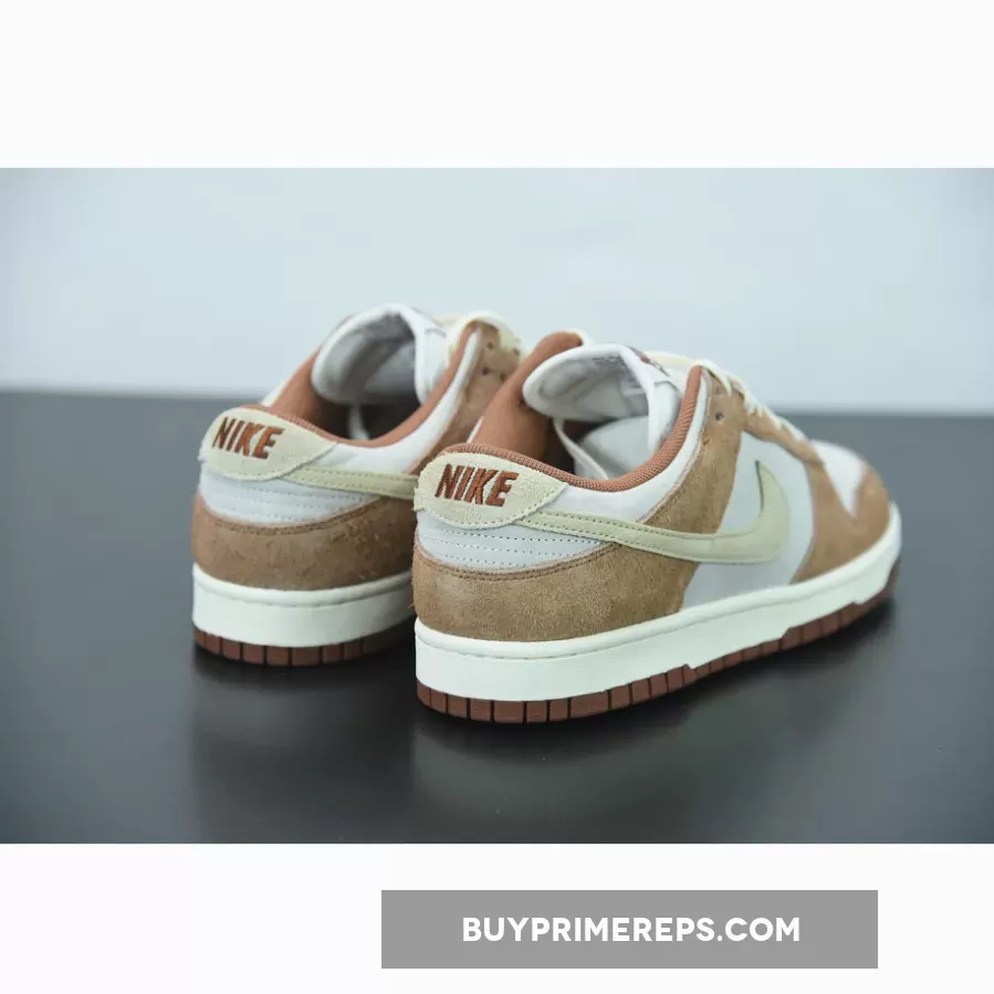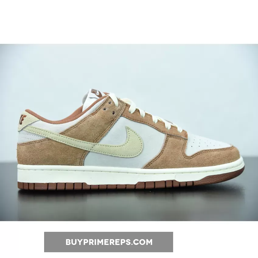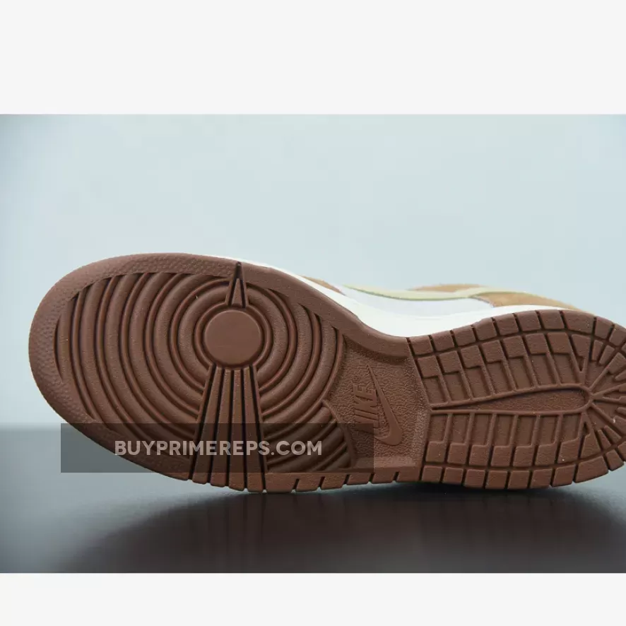The upper of the Dunk Low PRM Medium Curry is constructed from a combination of suede and leather, giving it a luxurious and premium feel. The brown curry overlays on the eyestay and overlay add depth and texture to the design, while the sail color on the base provides a clean and crisp contrast.