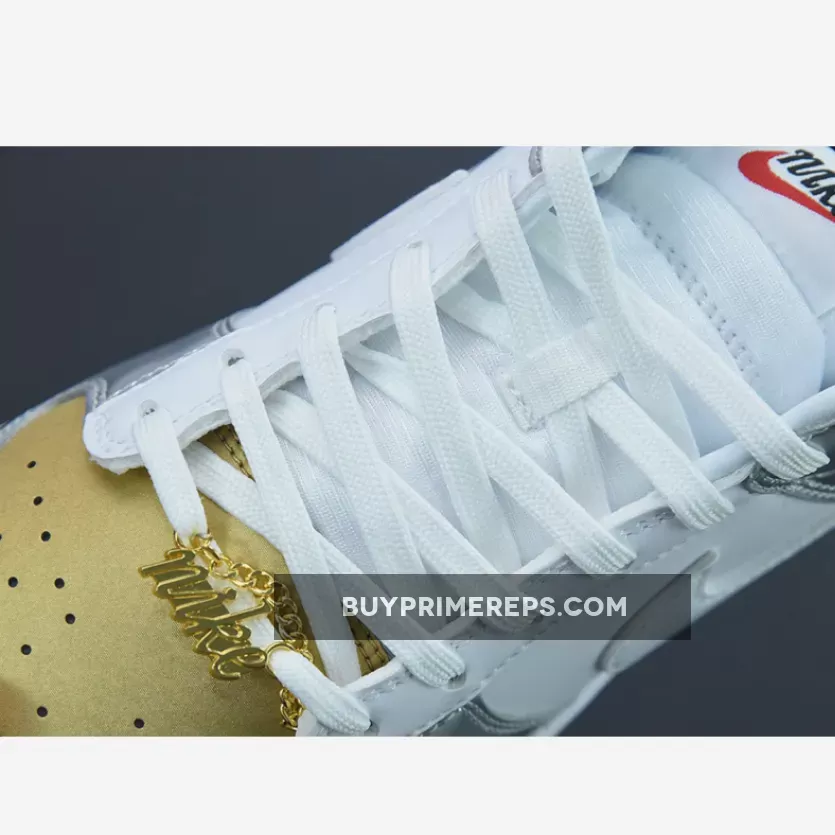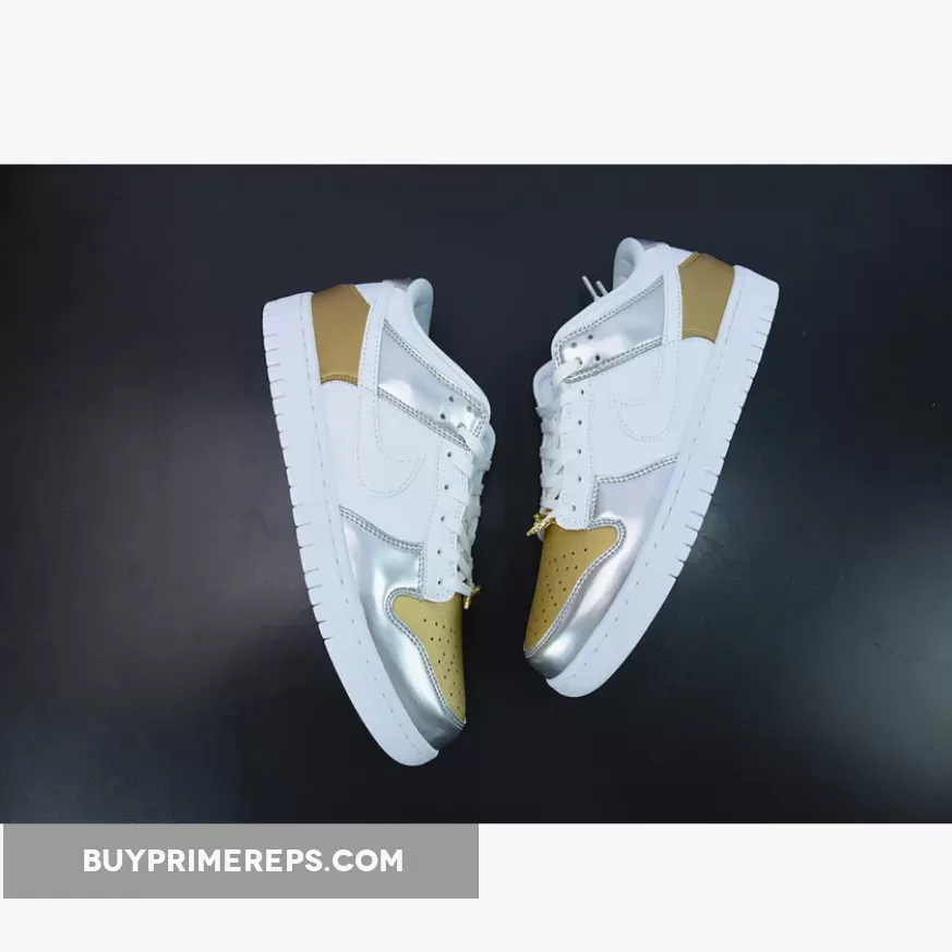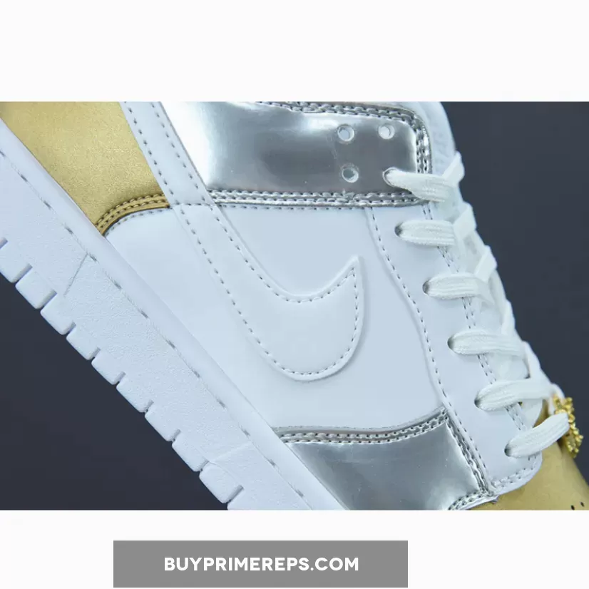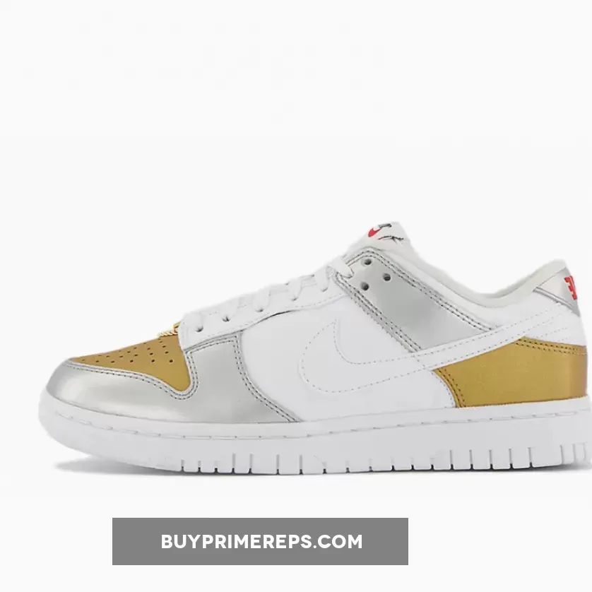 The Nike Dunk Low Gold White Silver Red is a sneaker that combines simplicity with a touch of luxury. Leaked just a few weeks ago, this colorway showcases a clean and minimalist design that allows the metallic accents to shine.