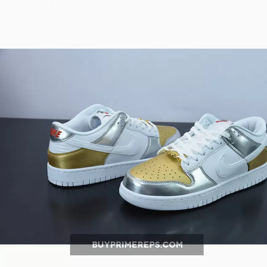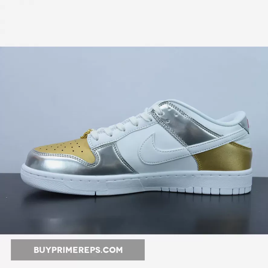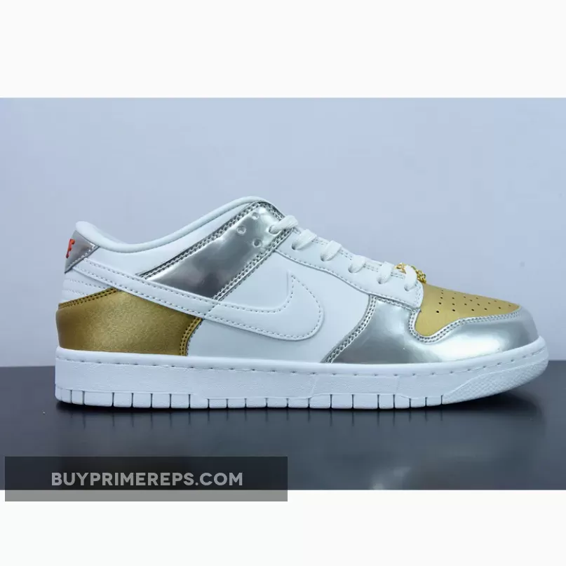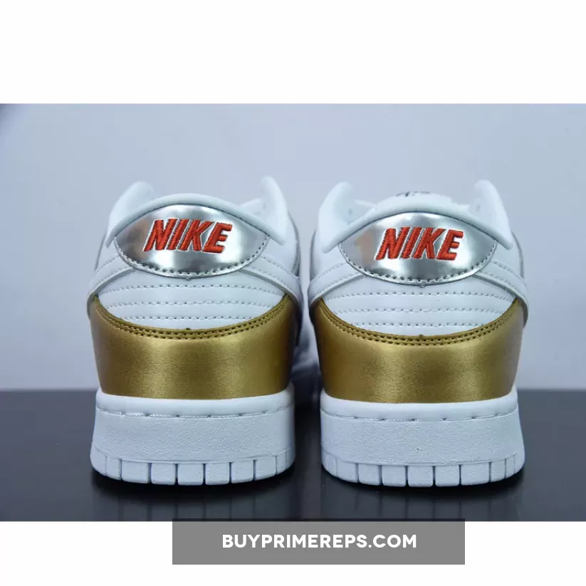 Overall, the Nike Dunk Low Gold White Silver Red is a sneaker that combines simplicity and luxury in a unique and eye-catching way. The clean white base allows the metallic gold and silver accents to shine, while the University Red accents add a pop of color. With its premium materials and attention to detail, this Dunk Low is sure to turn heads and make a statement.